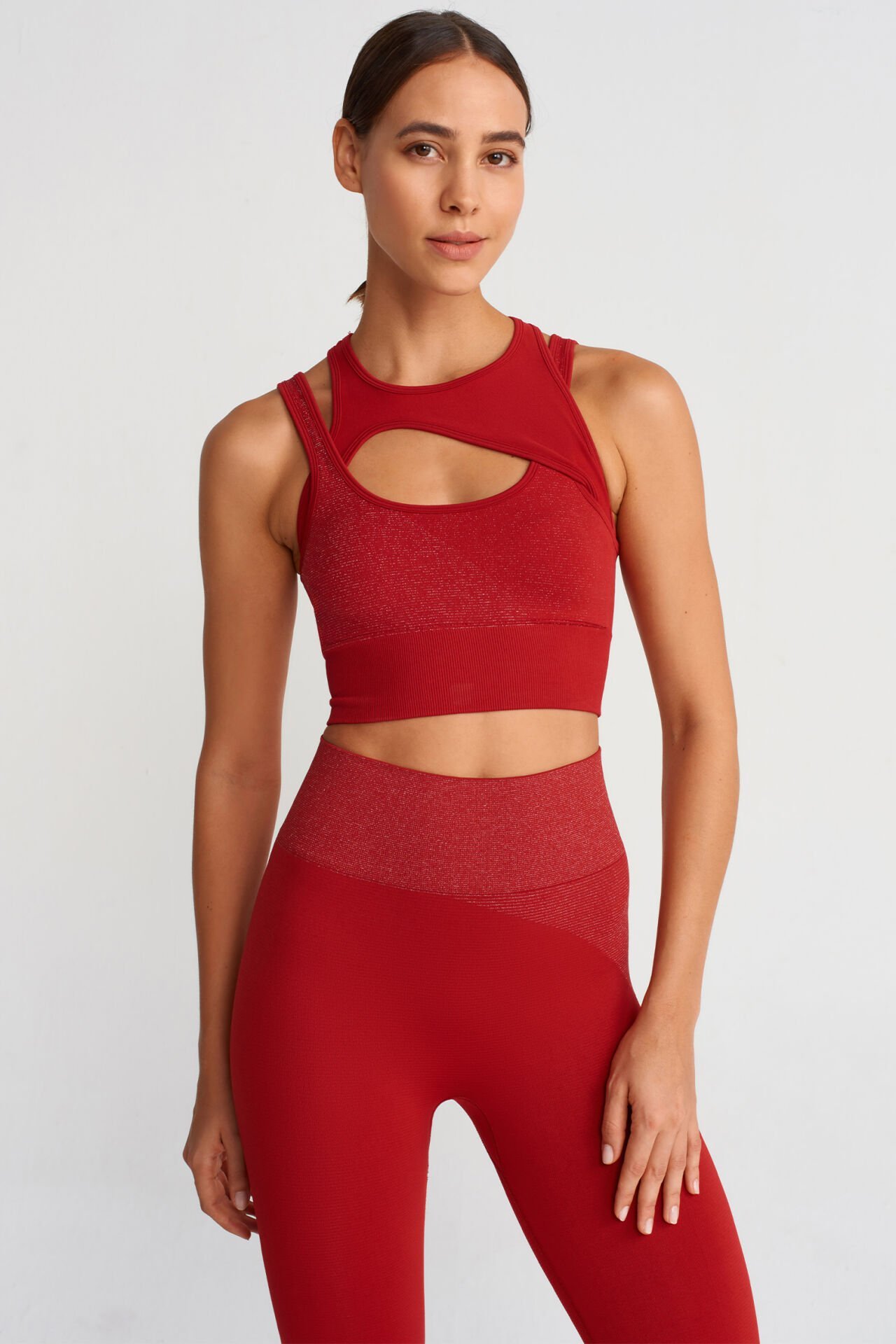 Asimetrik Halter Yaka Simli Sporcu Sütyeni Kırmızı