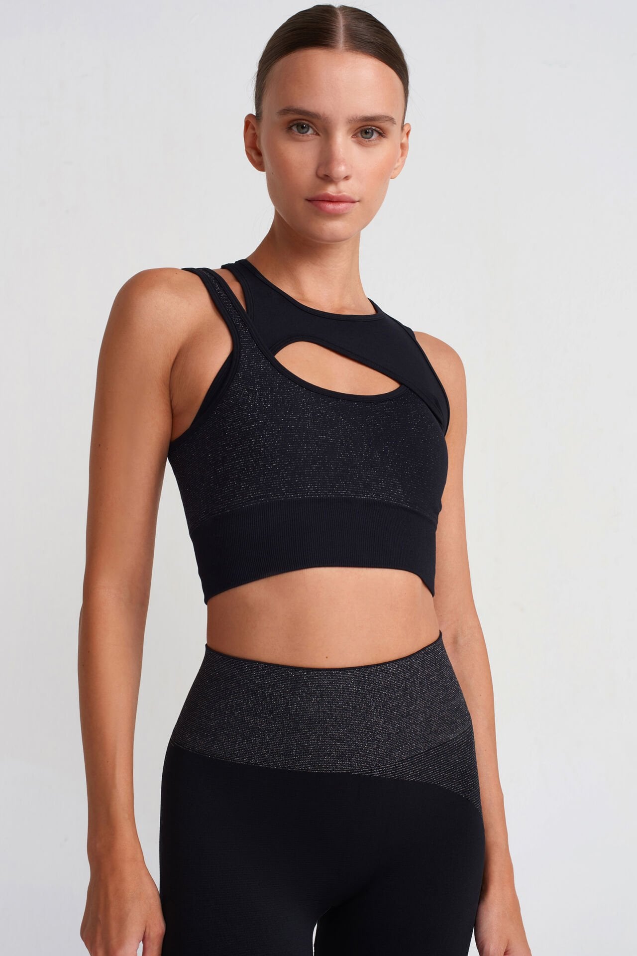 Asimetrik Halter Yaka Simli Sporcu Sütyeni Siyah