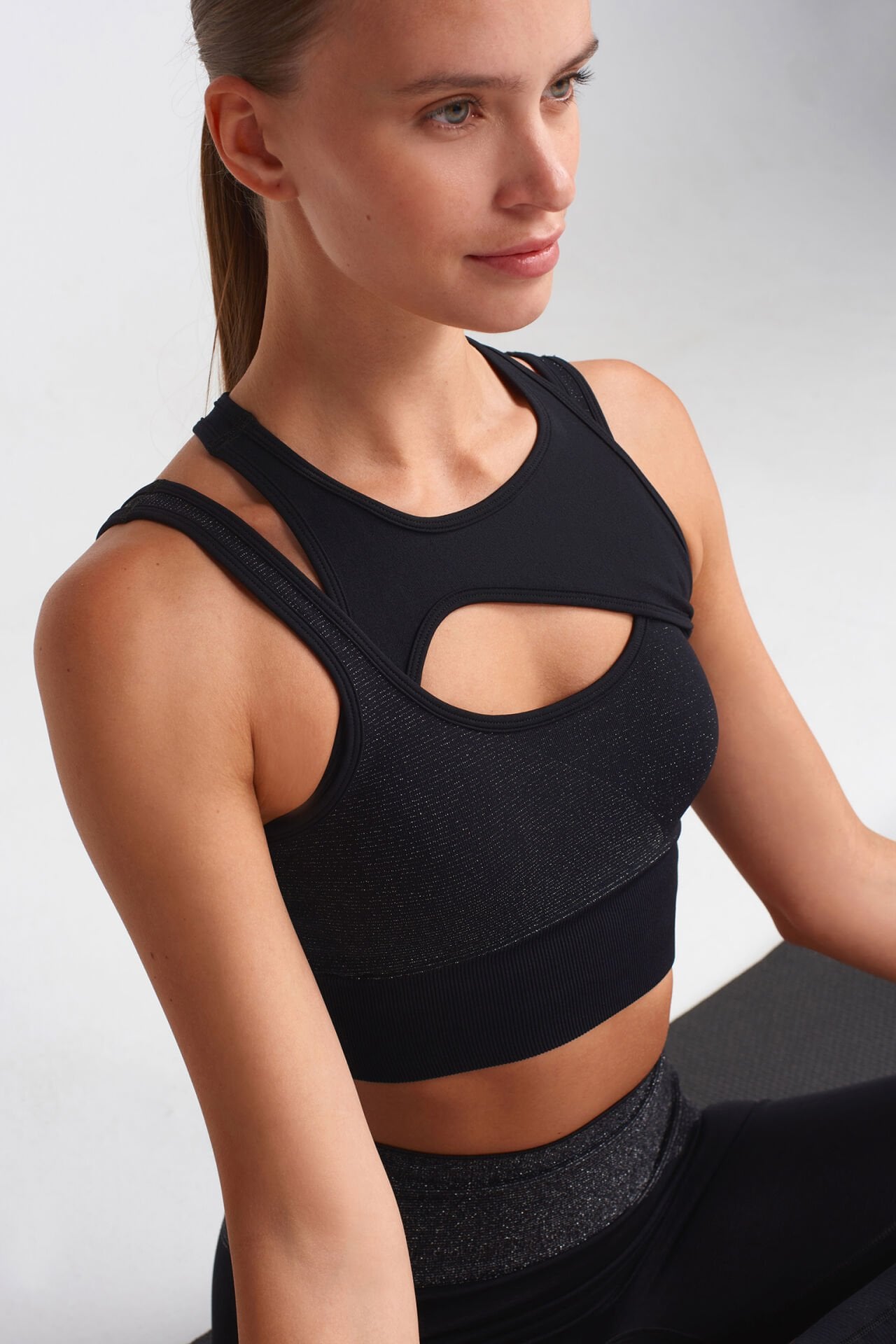 Bel kemeri yumuşak bir şekilde bedene otururken kayma yapmaz. Sporcu sütyenin yaka formu özgün bir tasarıma sahiptir. Sırt kısmı halter görünümlüdür. Spor sütyenin üst kumaşı simli, alt kumaşı düzdür. Günden geceye, spordan sokağa her an kullanışlı bir parça olması için tasarlandı.