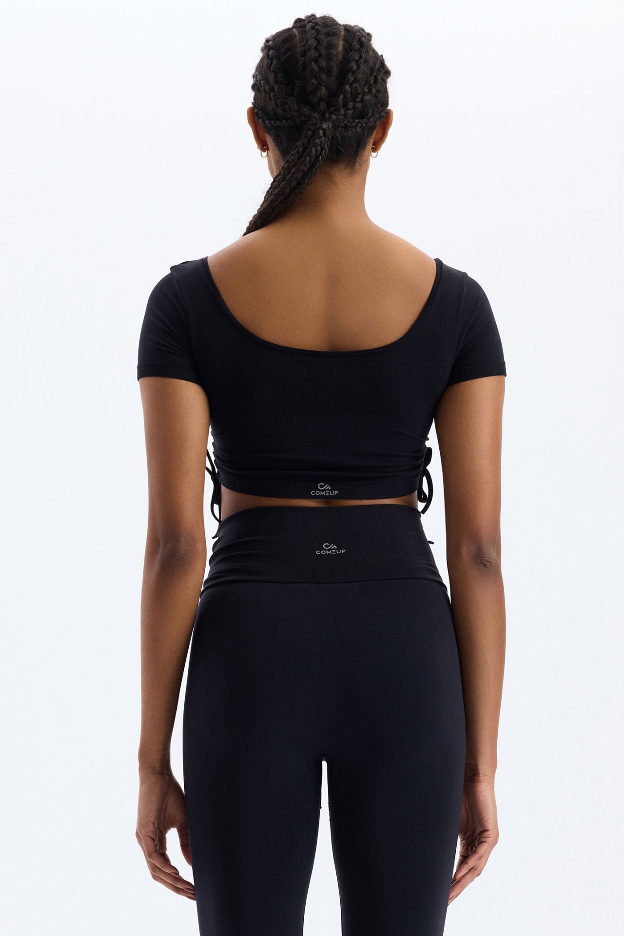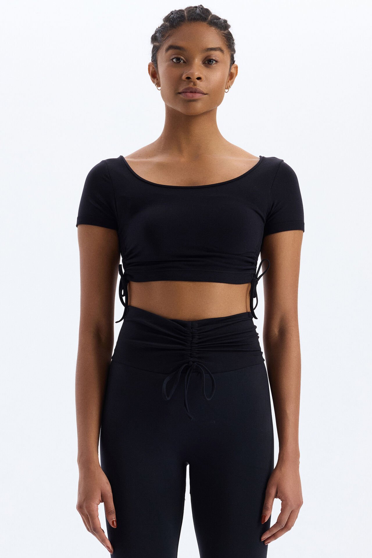 Bağcıklı Yanlardan Büzgülü Crop Top Siyah