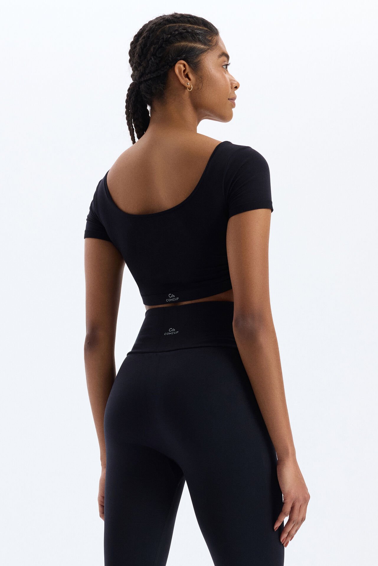 Takıp çıkarılabilir göğüs pedleri sayesinde kişisel ihtiyaçlarına göre şekillenebilen siyah kısa kollu crop top, dikişsiz ve yüksek esnek kumaşıyla hareket özgürlüğü sunar.