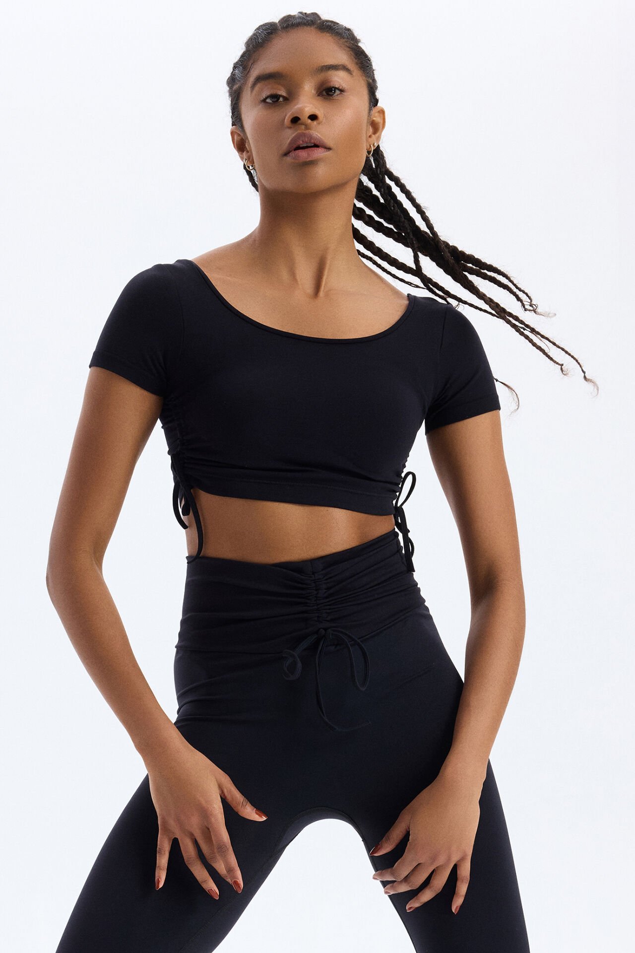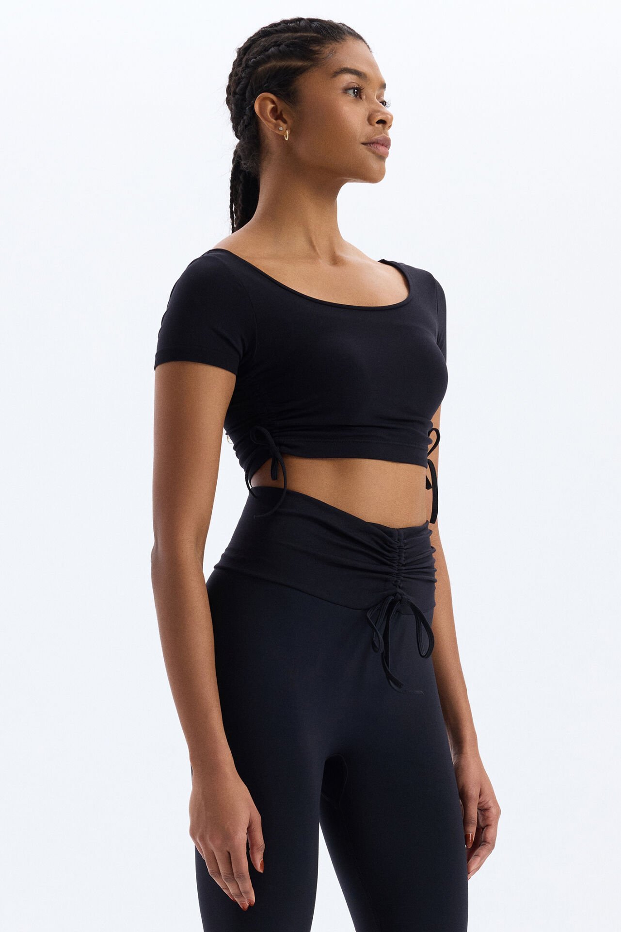 Zamansız siyah rengiyle öne çıkan siyah crop top, hem spor aktivitelerinde hem de günlük kullanımda şıklığı ve konforu bir arada sunar. Yanlardan büzgülü ve bağcıklı tasarımı, vücut hatlarını vurgularken ayarlanabilir yapısıyla bedenine özel bir uyum sağlar.