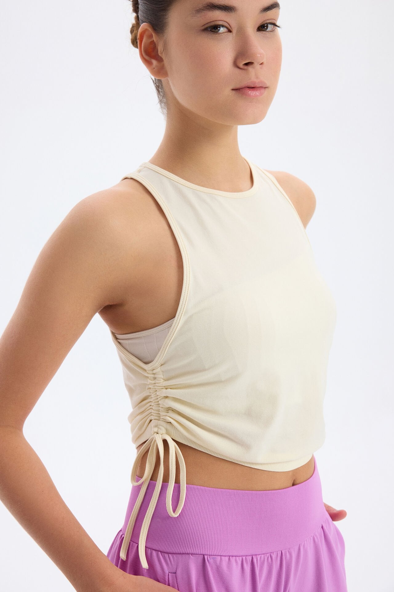 Bağcıklı yanlardan büzgülü spor atlet, antik beyaz renginin soft ve sofistike görünümüyle her ana uyum sağlar. Şıklığını ve stilini sade bir zarafetle yansıtan spor atlet, yanlardaki büzgü detaylarıyla modern bir dokunuş sunar. Ayarlanabilir bağcıklar, vücut hatlarına tam uyum sağlayarak sana özel bir konfor deneyimi sunar. İçine ekleyebileceğin spor sütyeni ise egzersiz sırasında ekstra destek ve güven hissi sağlar.
