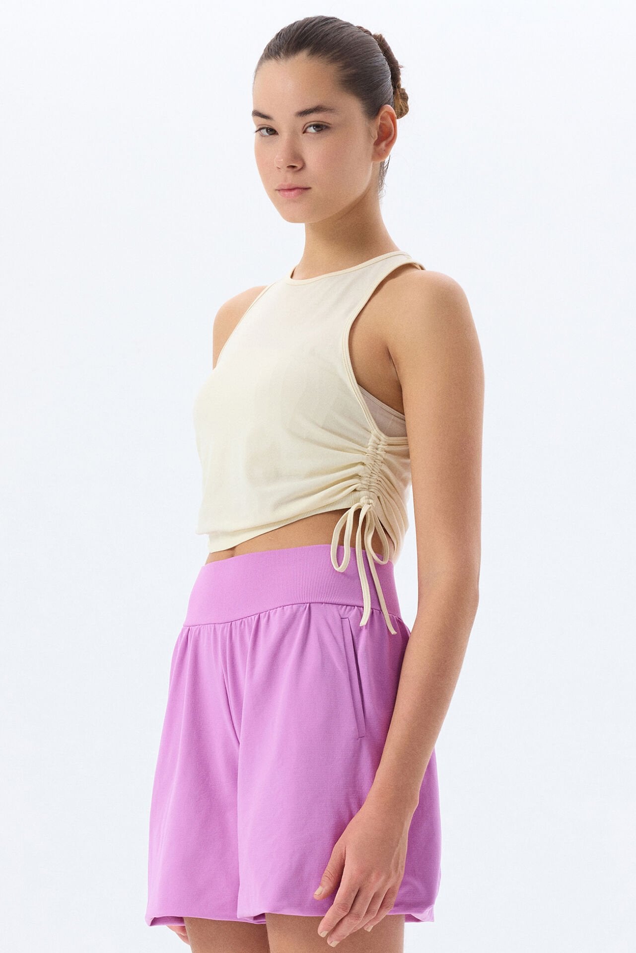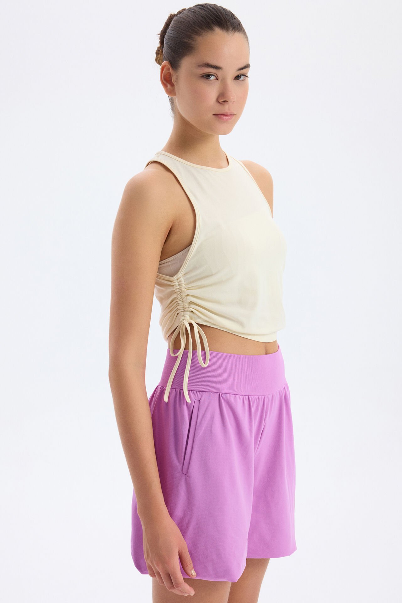 -Bağcıklı yanlardan büzgülü spor atletin içine spor sütyenini ekleyerek kusursuz bir kombin oluşturabilirsin.
