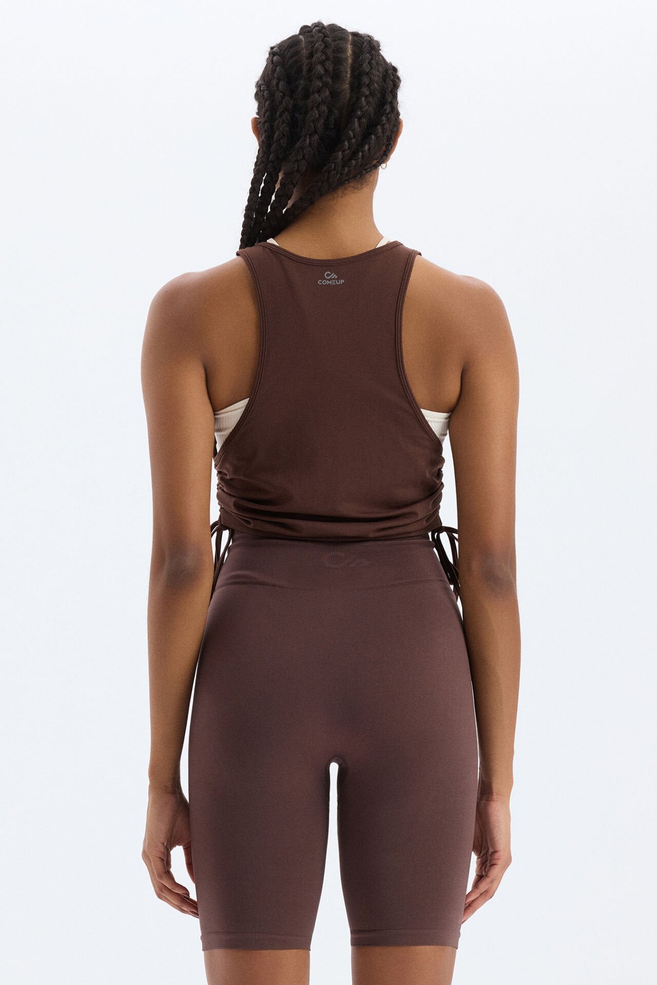 -Bağcıklı yanlardan büzgülü spor atletin içine spor sütyenini ekleyerek kusursuz bir kombin oluşturabilirsin.