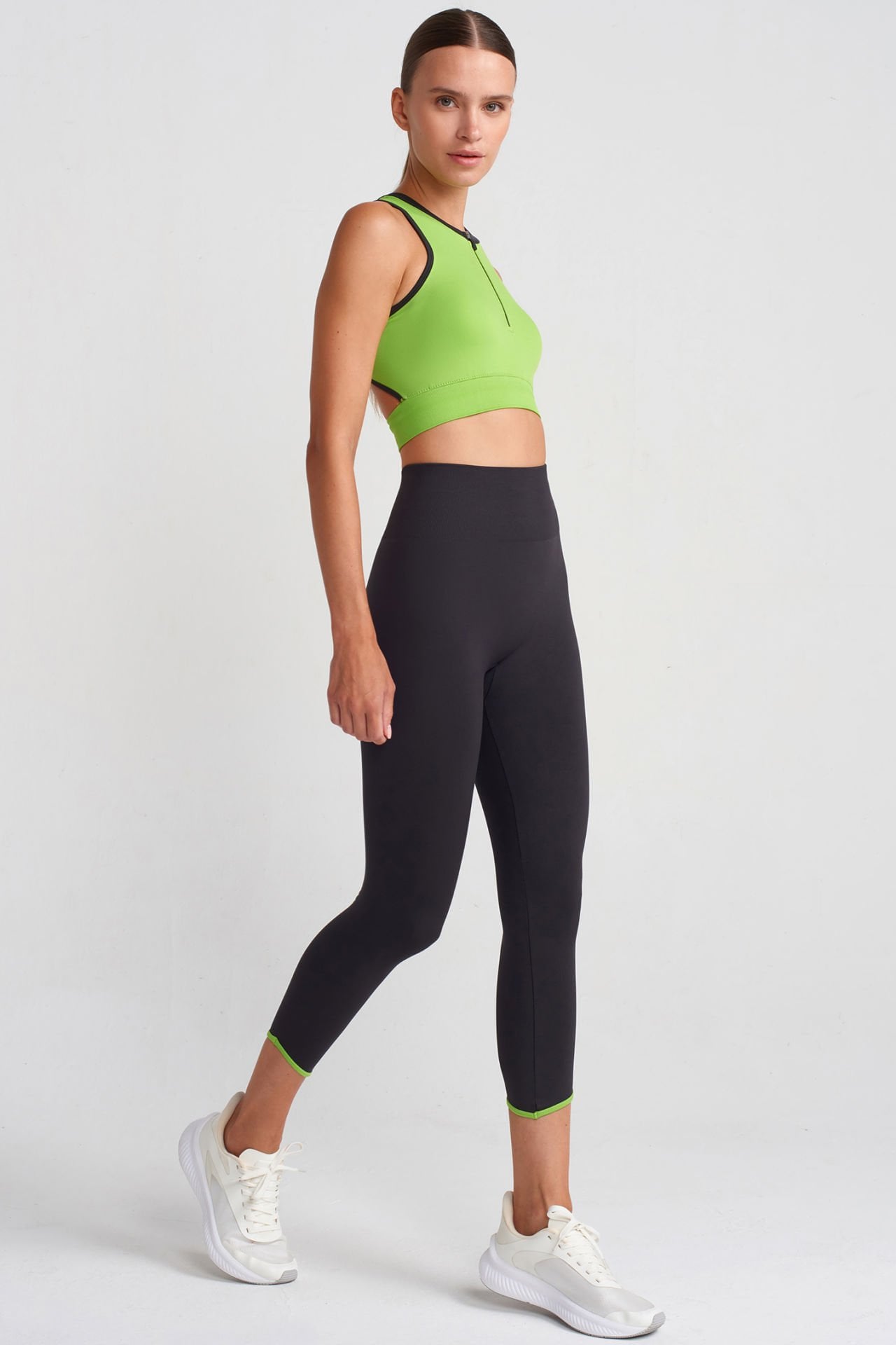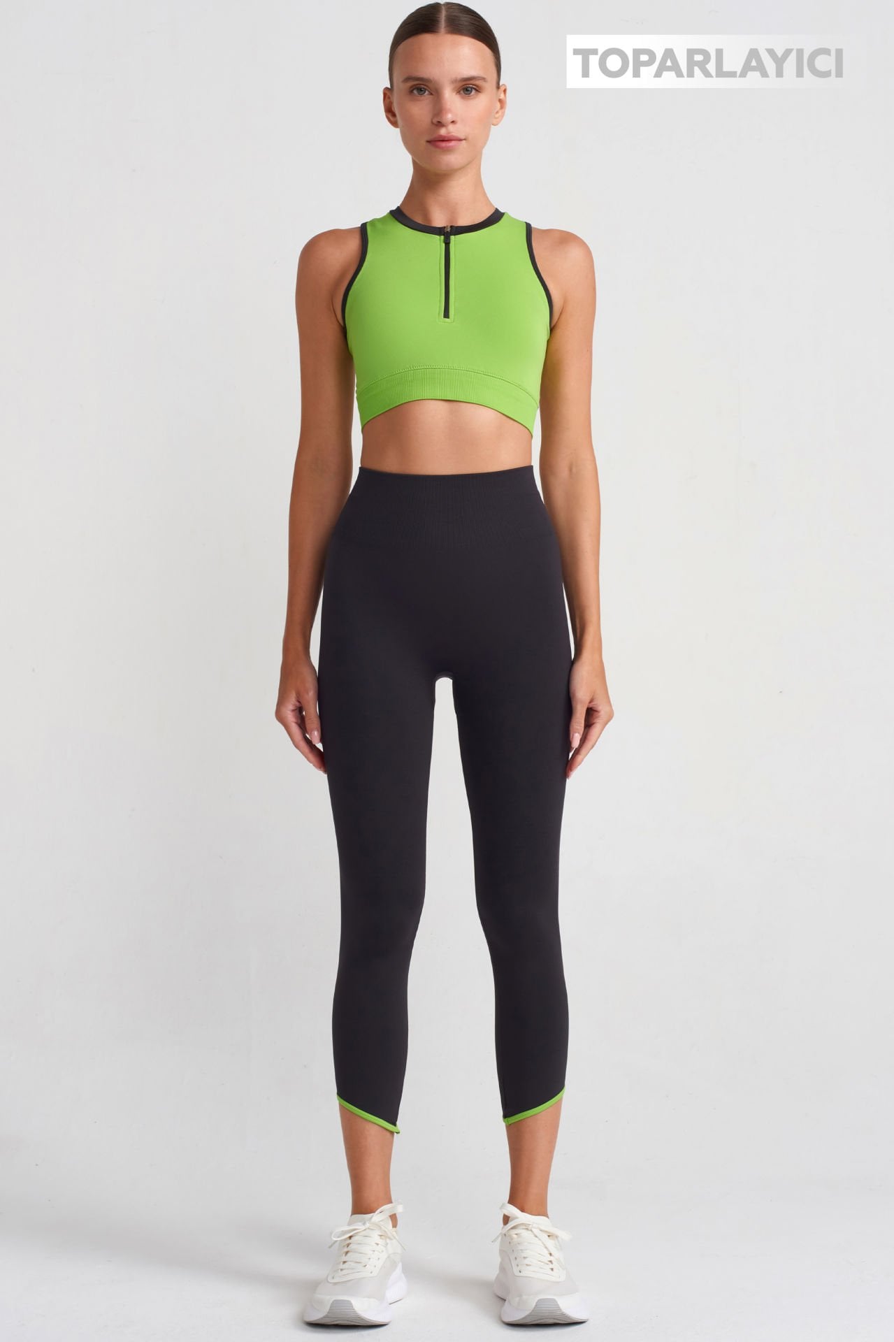 Dikişsiz teknoloji ile üretilen toparlayıcı taytın küllü siyah ve egzotik yeşil renkleri canlı bir tarzı yansıtarak dikkat çeker. Bilek üstü crop boy taytın paça kısmında yeşil biye detaylarına sahiptir, taytın şıklığını arttırır. Toparlayıcı tasarımı, vücudu saran ve hatları kusursuzlaştıran formu ile fit görünüm kazanırsın.