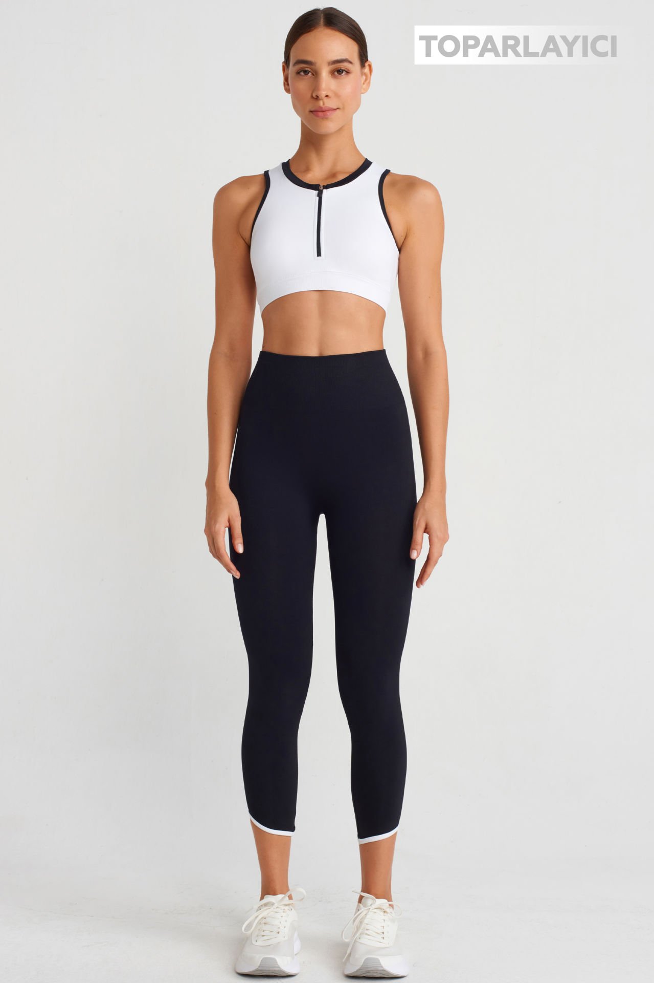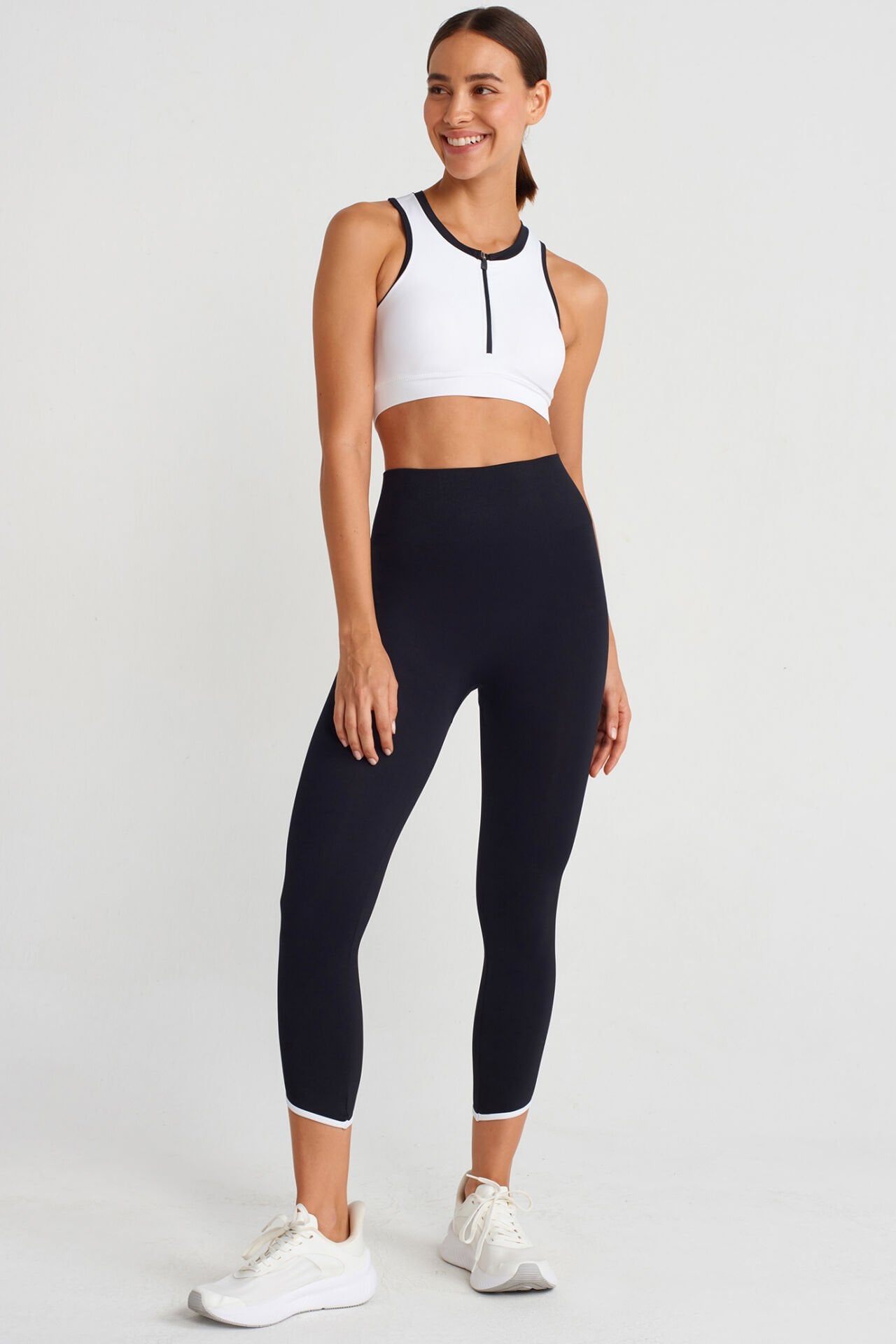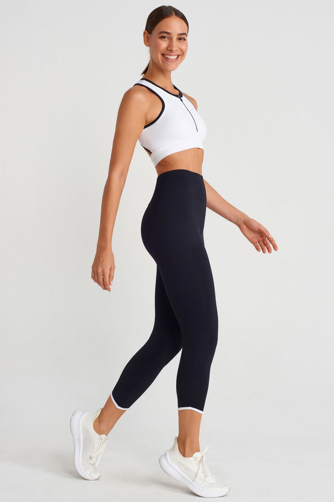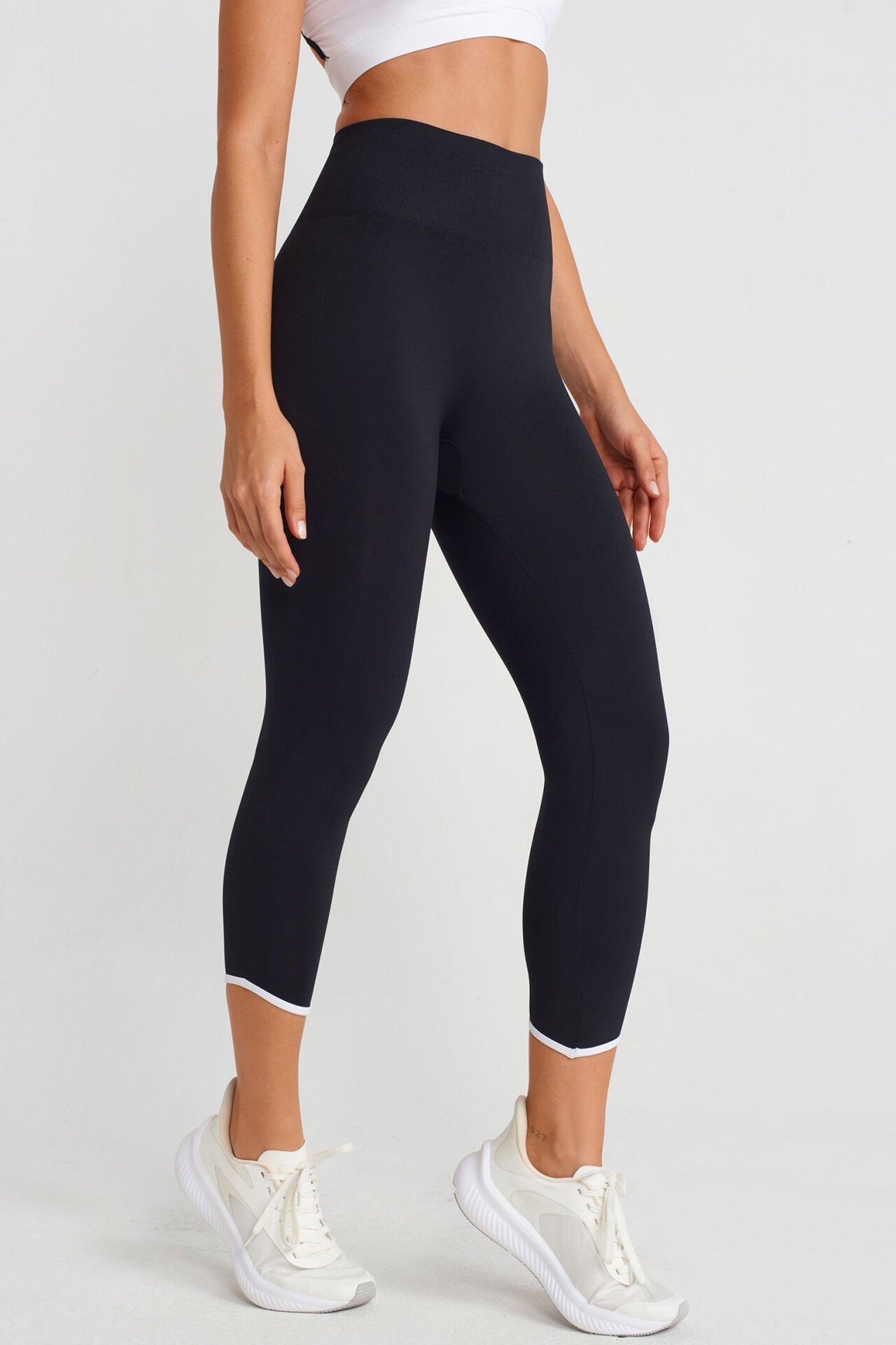 Siyah kumaş üzerinde beyaz biyeleri bulunan bilek üstü crop boy tayt, toparlayıcı kumaşı ile fit ve şık bir görünüm elde etmenizi sağlar.