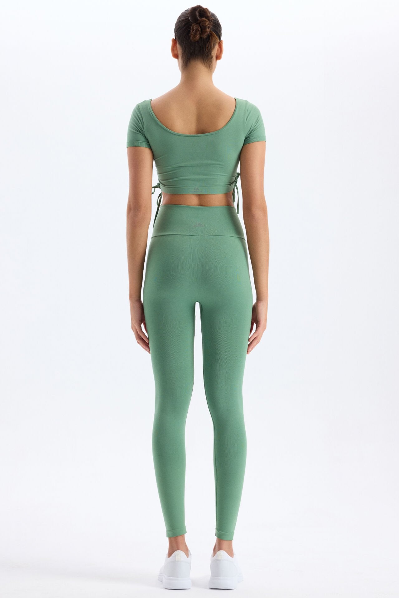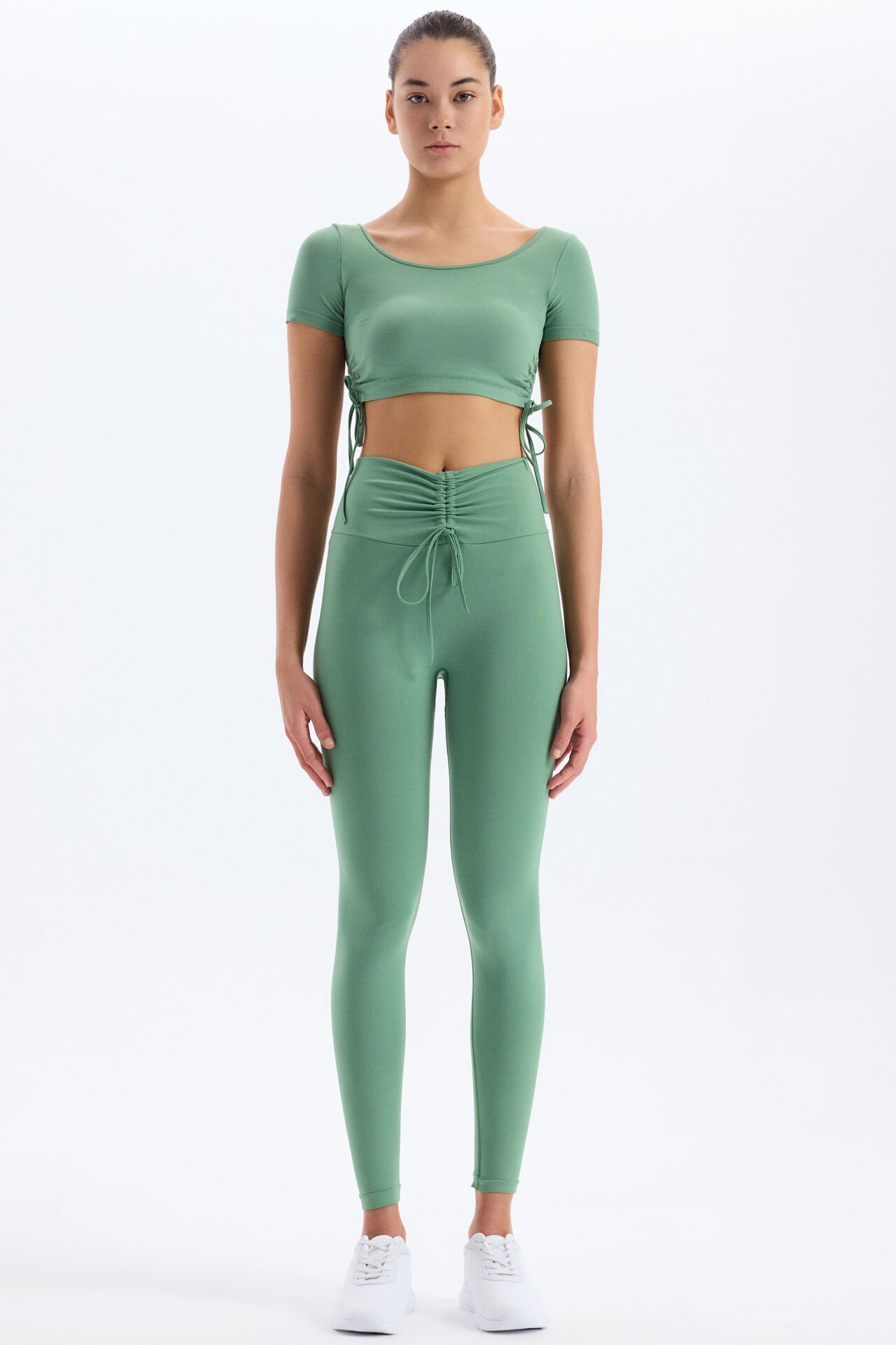 Zarif ve rahat bir tasarıma sahip çağla renk spor tayt, hem spor yaparken hem de günlük kullanımda maksimum konfor sunar. Beli büzgü bağlamalı tayt tasarımı, vücuda mükemmel uyum sağlayarak modern bir görünüm kazandırır.