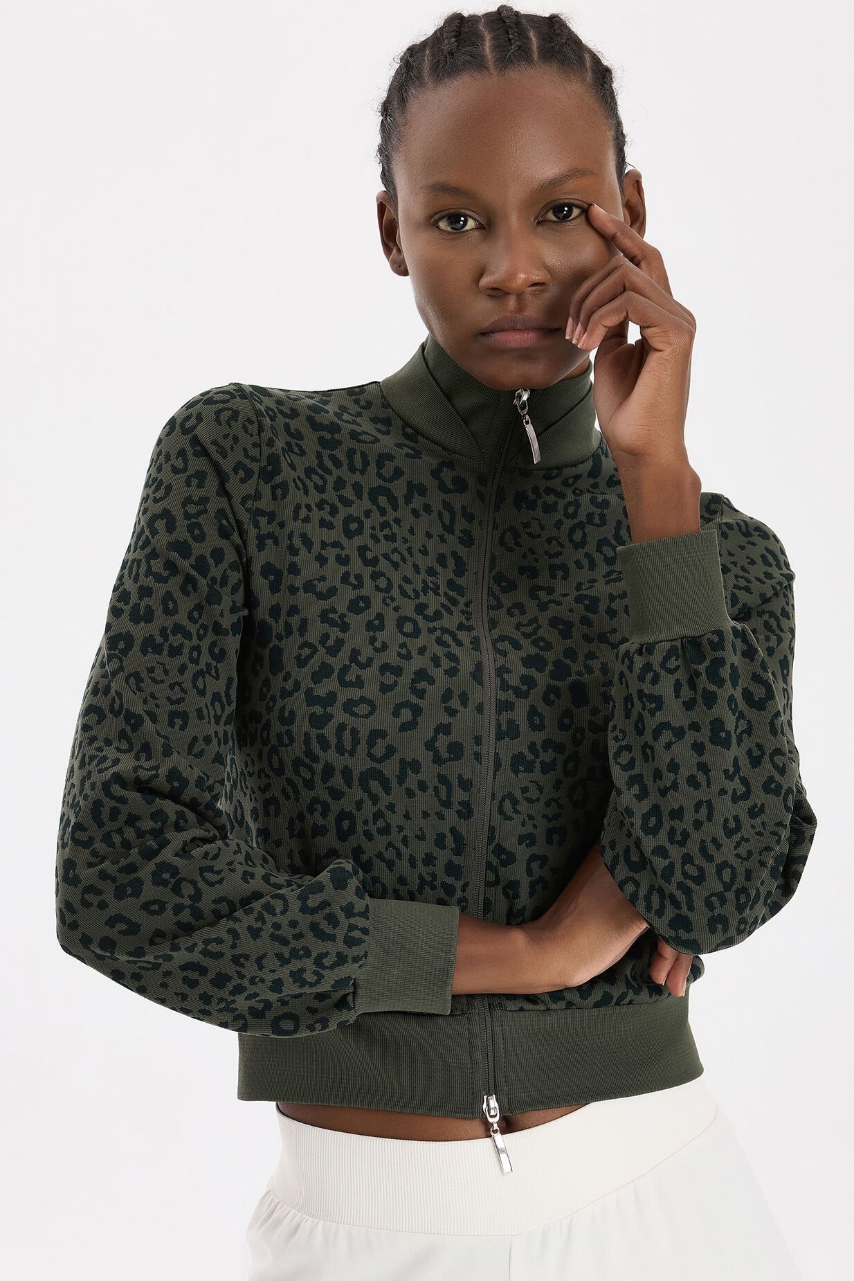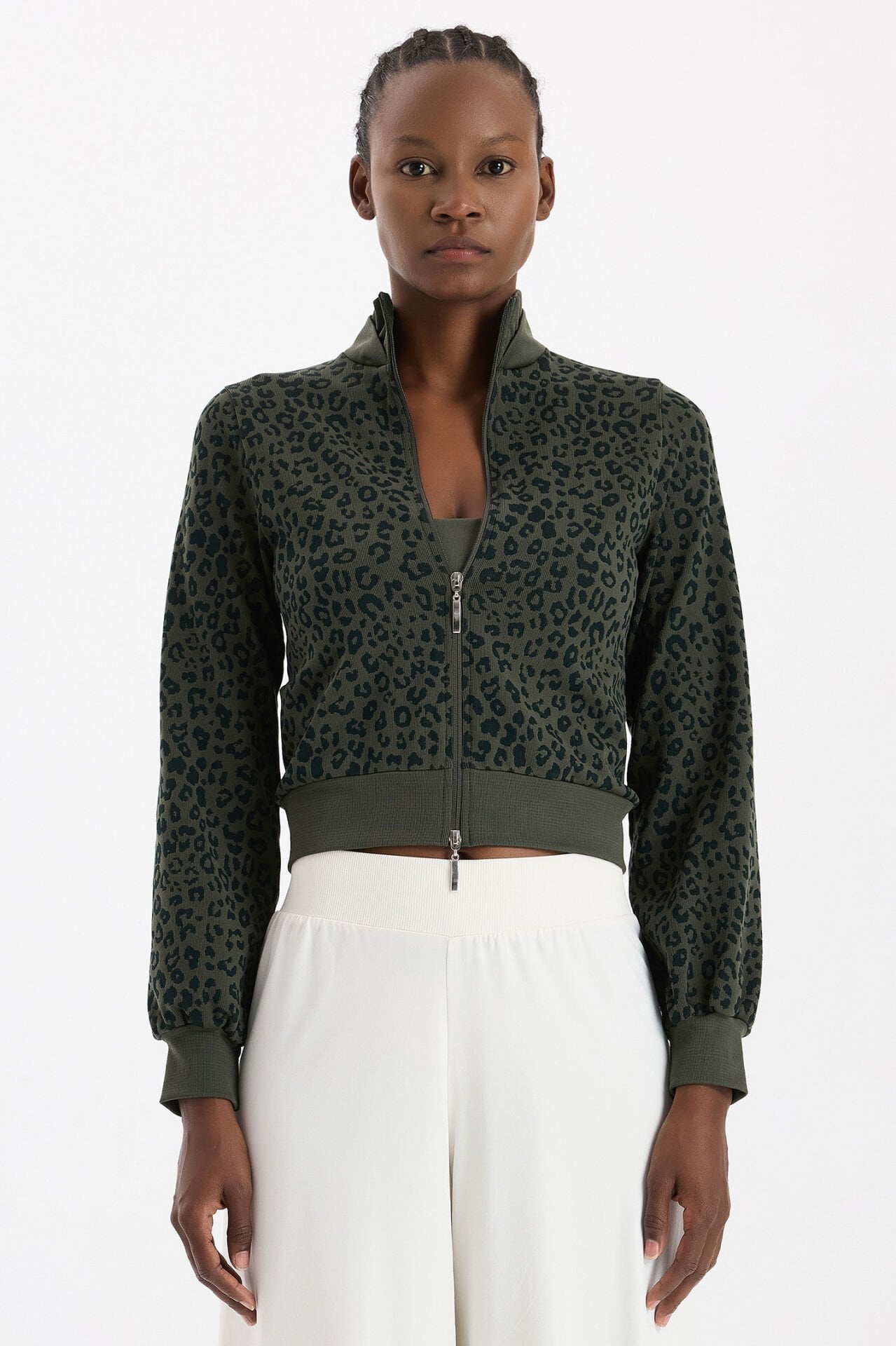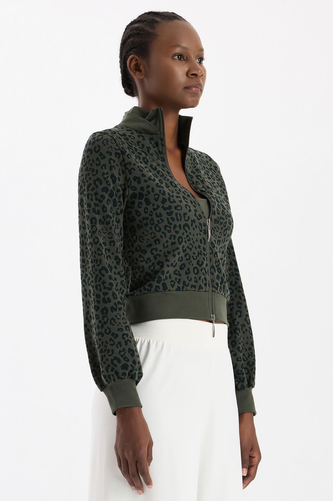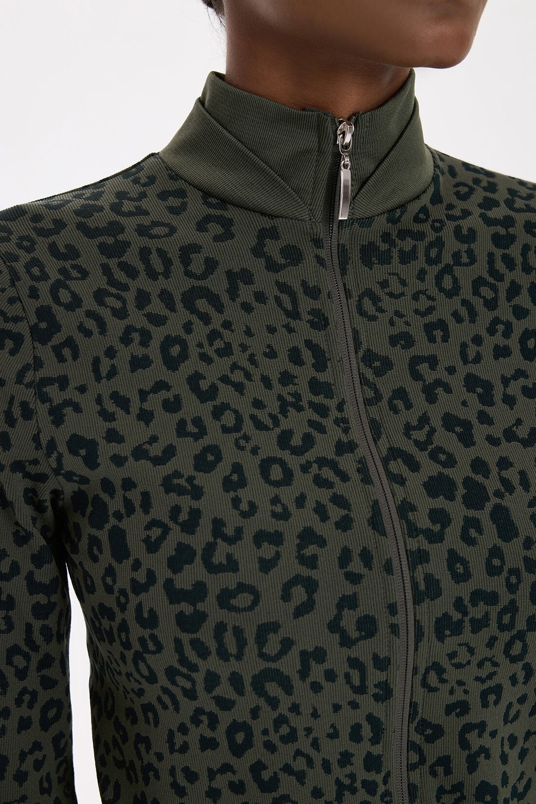 66791 Leopar Desenli Bomber Ceket, koyu yaprak yeşilinin doğal zarafetini leopar desenin modern yorumu ile buluşturuyor. Dikişsiz giyim teknolojisiyle üretilen bu model, yumuşacık dokusuyla rahatlık sağlarken güçlü bir stil ortaya koyar.
