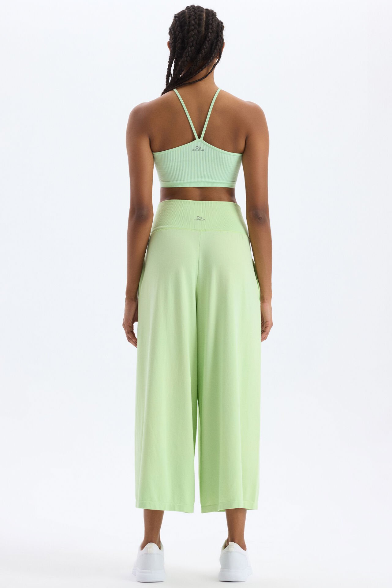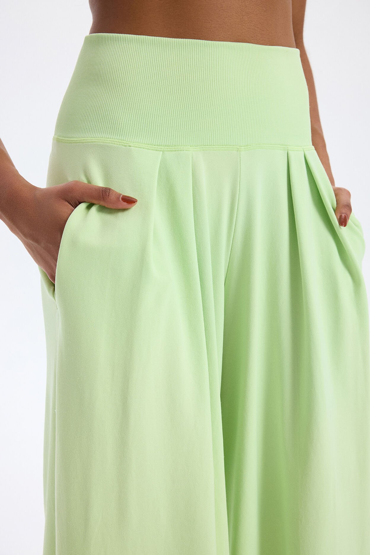 Yüksek belli ve geniş paçalı kesimiyle güçlü bir siluet oluşturur, pile detayları ise bel kısmına zarif bir hareket katar. Cepli tasarımı sayesinde kullanım kolaylığı sağlarken, dikişsiz ve esnek kumaşı ile vücudu doğal bir şekilde sarar. Her adımda özgür hissetmen için tasarlandı.