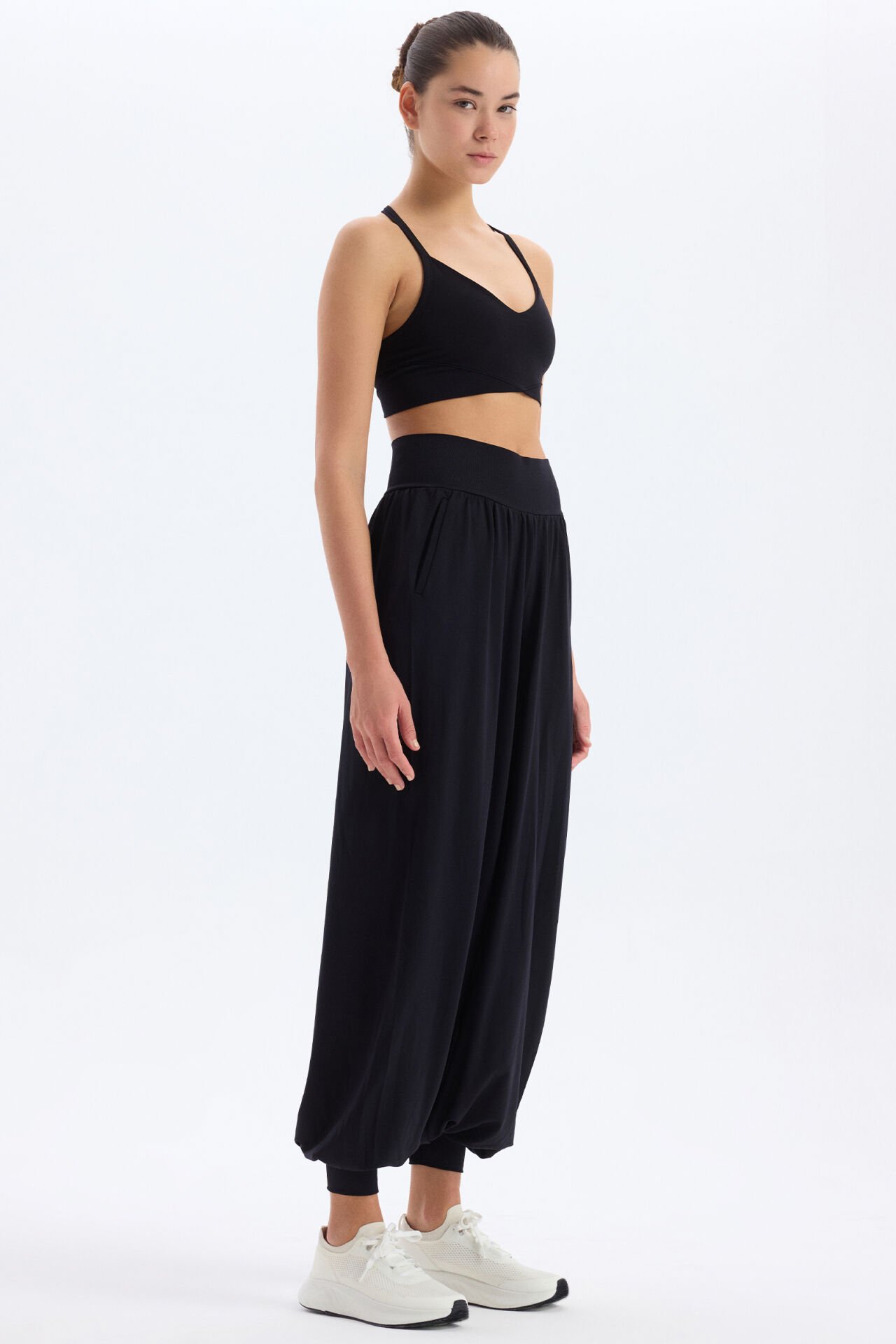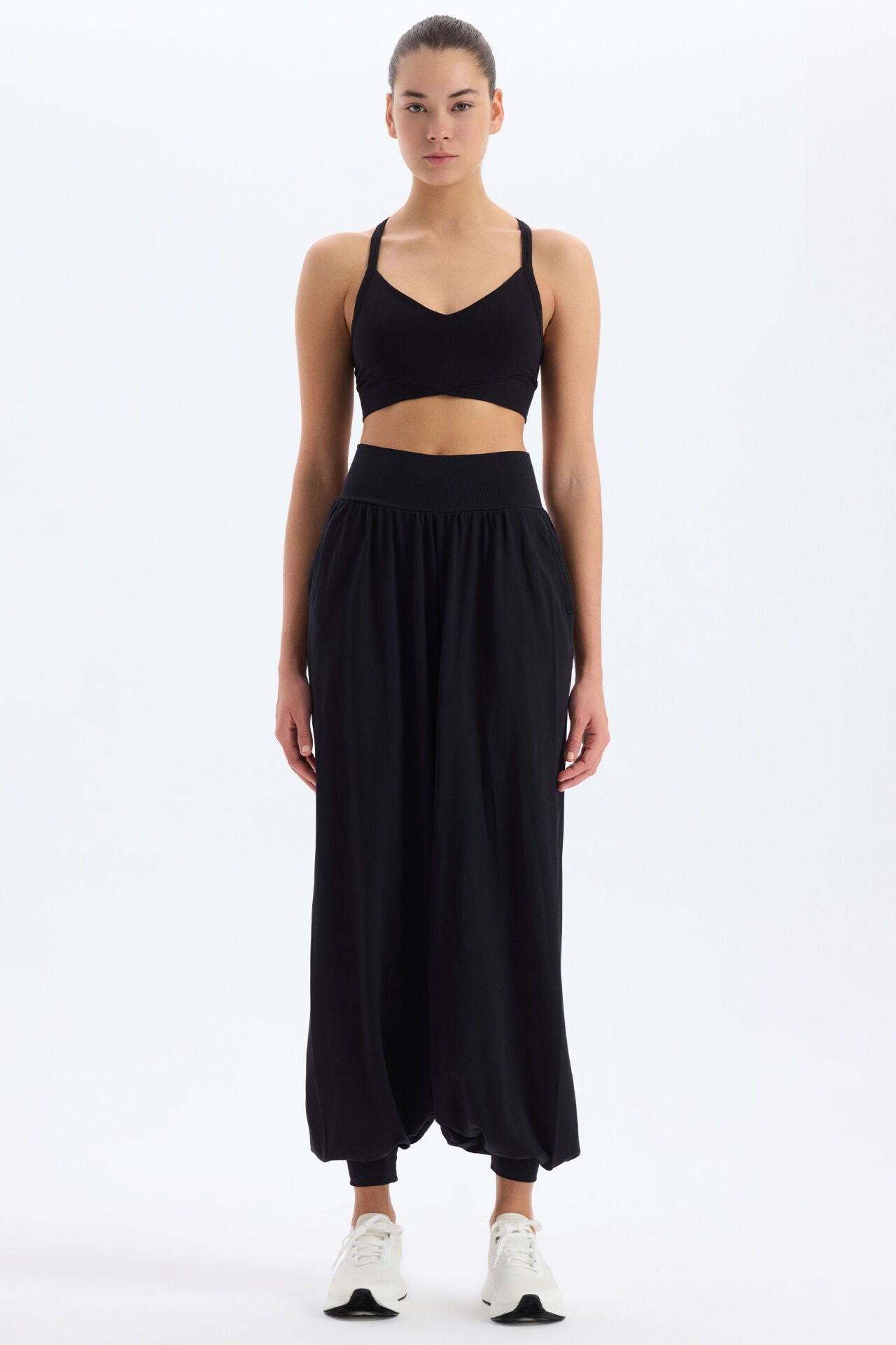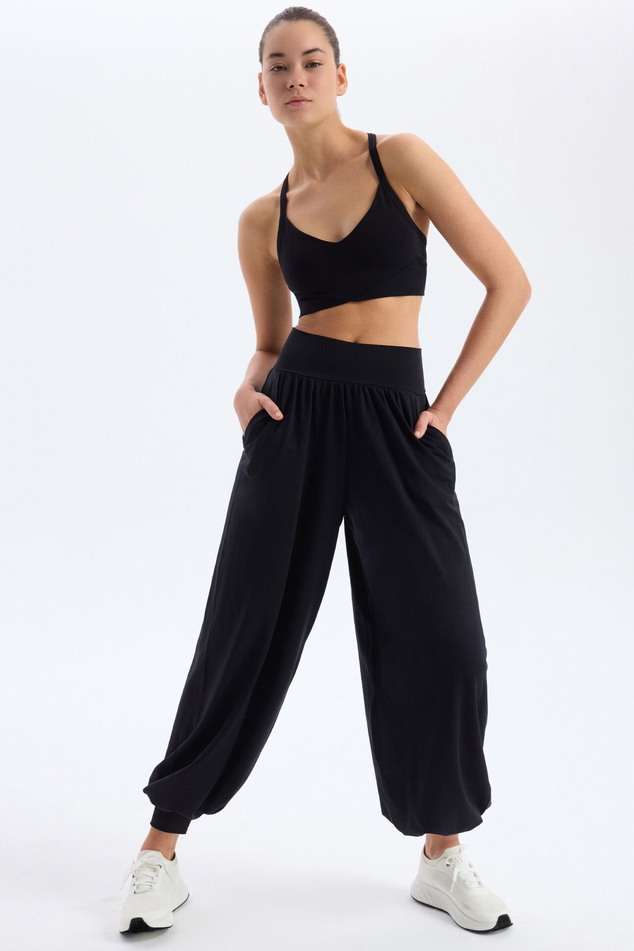 Şalvar pantolon, sade ama şık görünümüyle hem spor kombinlerinde hem de günlük tarzında kolayca kullanılabilir. Üst düzey konfor ve estetik tasarımı bir araya getiren yapısıyla dolabının vazgeçilmez parçalarından biri olacak.