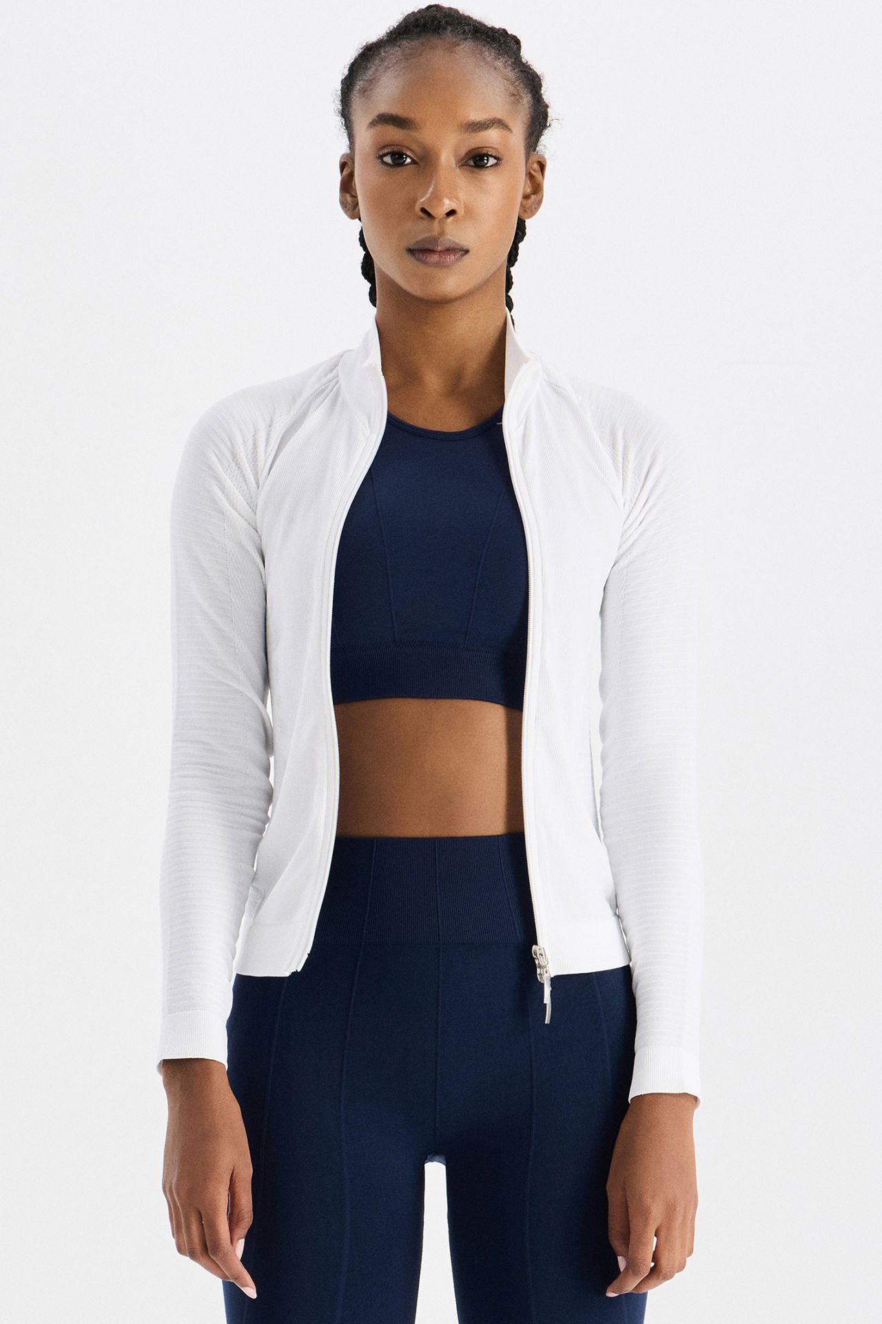 Beyaz spor ceket, kusursuz görünümü ve işlevselliği bir araya getirerek her anına zahmetsiz şık bir görünüm katıyor. Dikişsiz tasarımı, vücuduna mükemmel şekilde oturmasını sağlarken, fermuarlı detayı modern bir hava sunar. Spor ceketin fitil ve jakar detayları, enerjini de ön plana çıkarıyor.