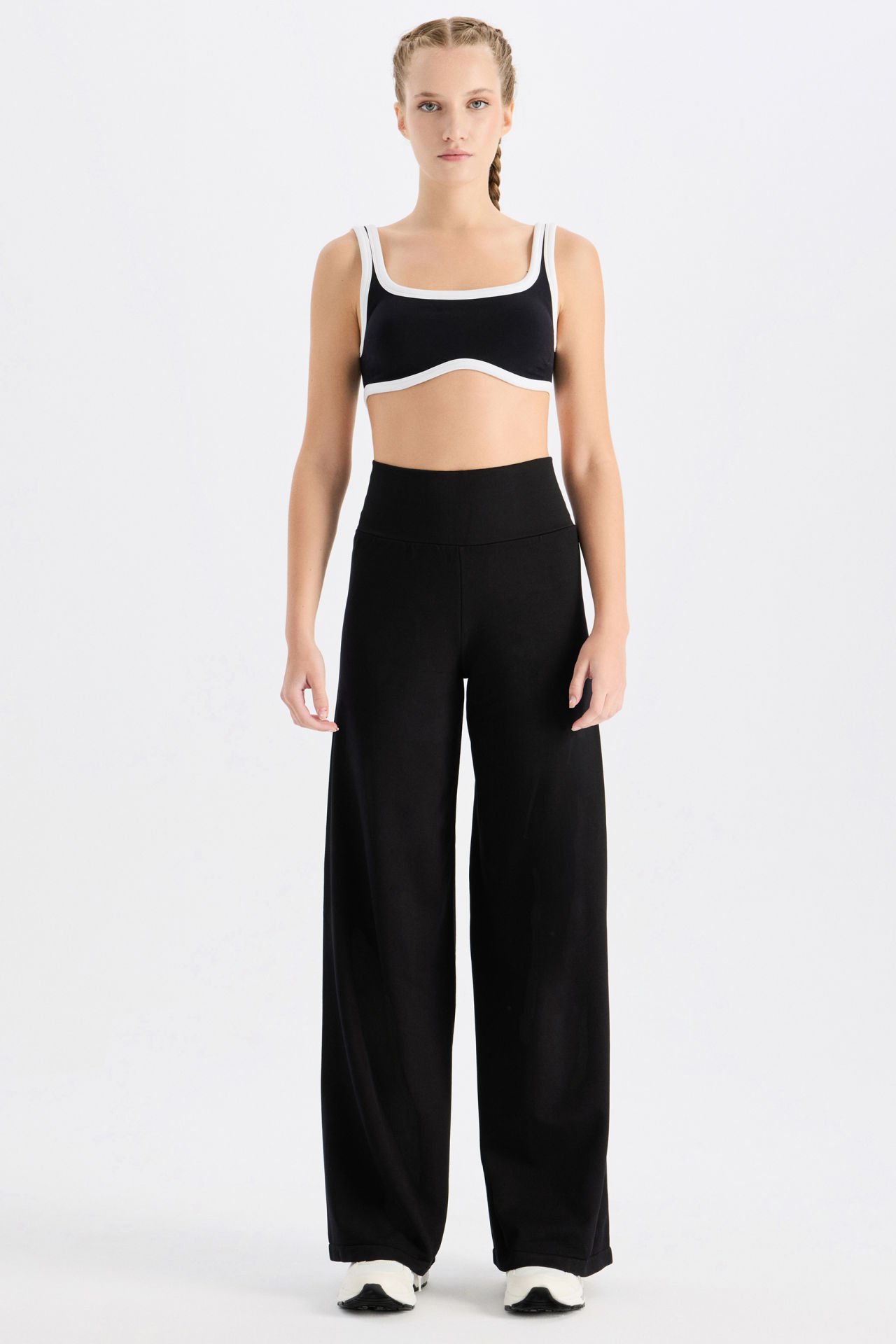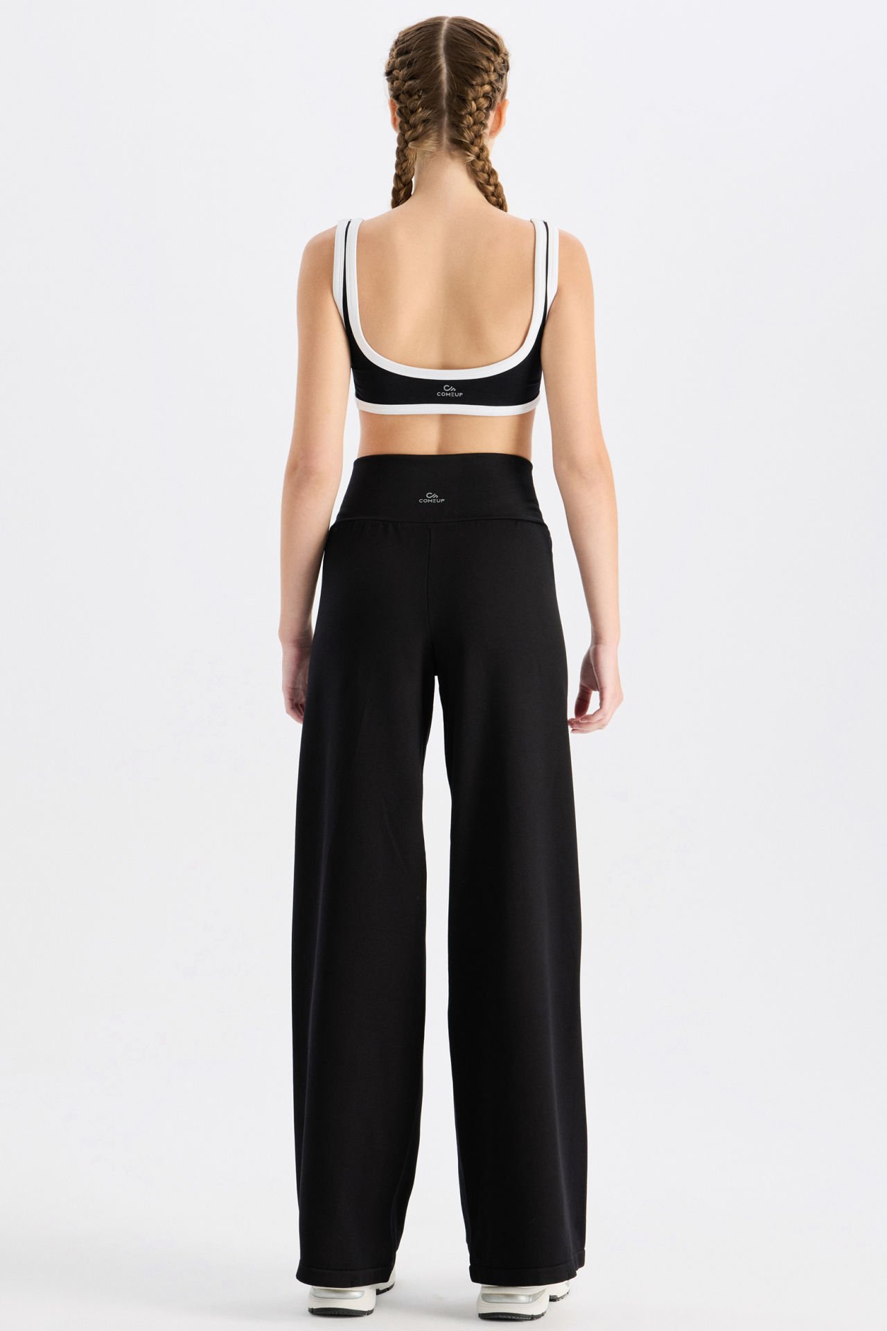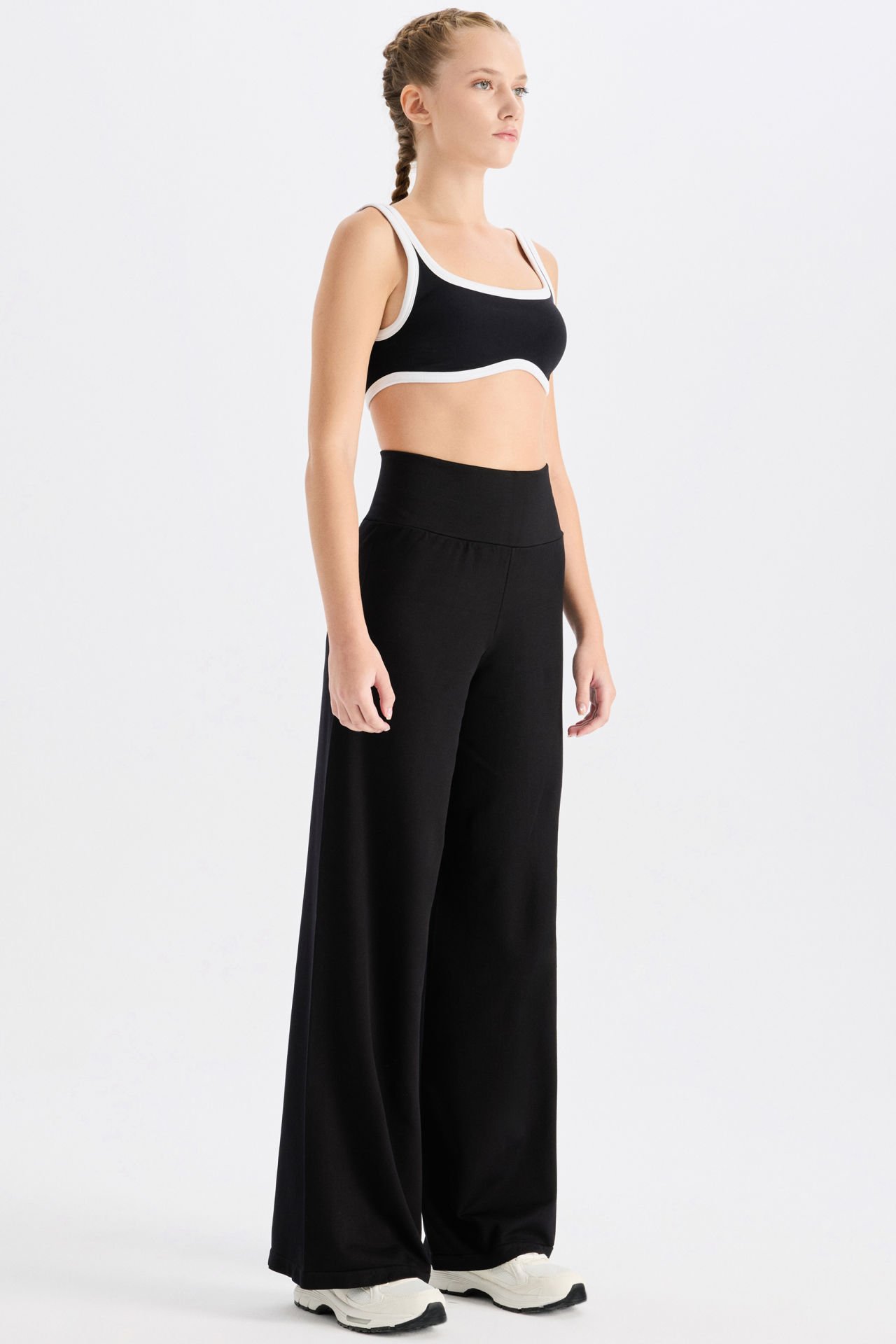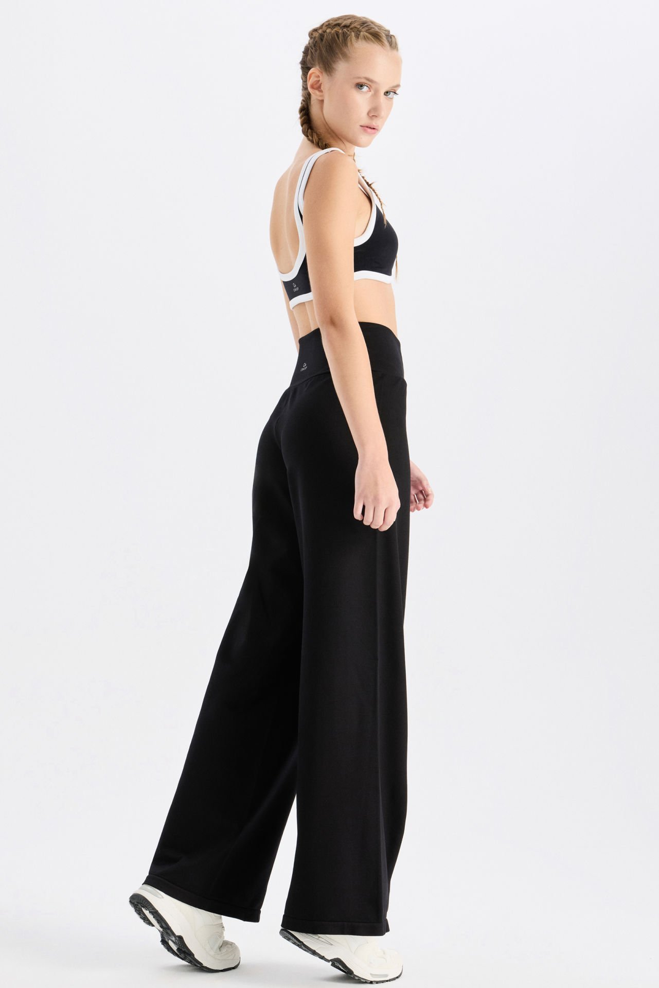 Siyah düz kesim pantolon, dikişsiz kumaş teknolojisi ile tasarlanmış, tamamen rahat hissettiren esnek bir yapıya sahiptir. Yumuşak dokuya sahip pantolonun yüksek bel tasarımı, görünümüne modern bir dokunuş katıyor.