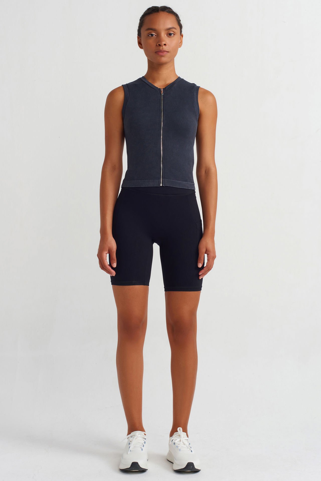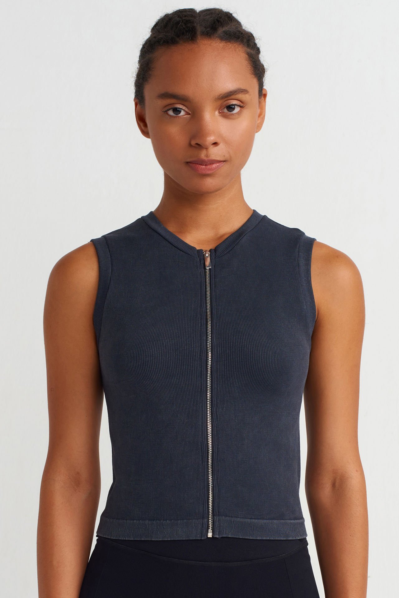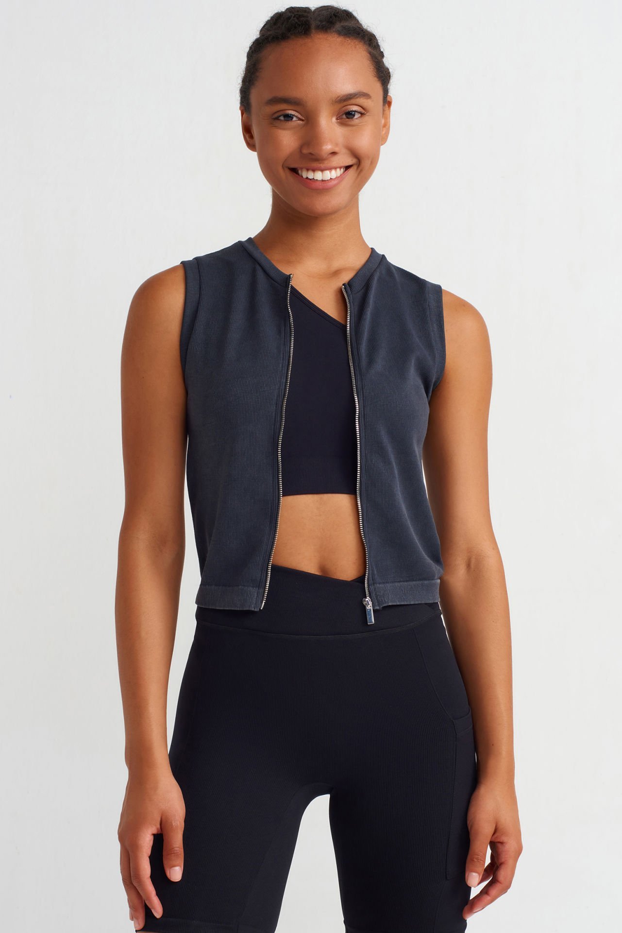 Fermuarlı Asit Yıkamalı İnce Fitilli Spor Yelek Siyah