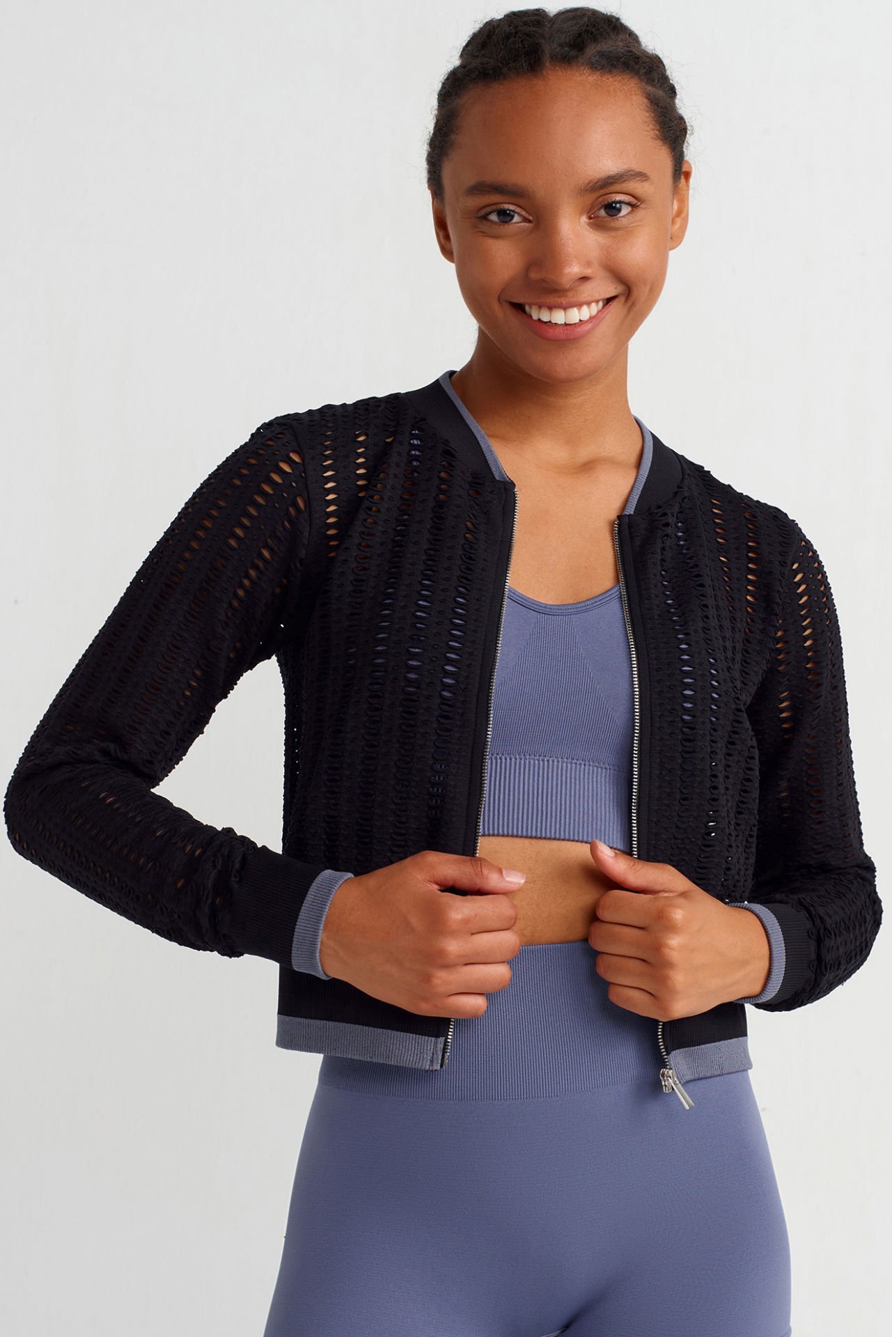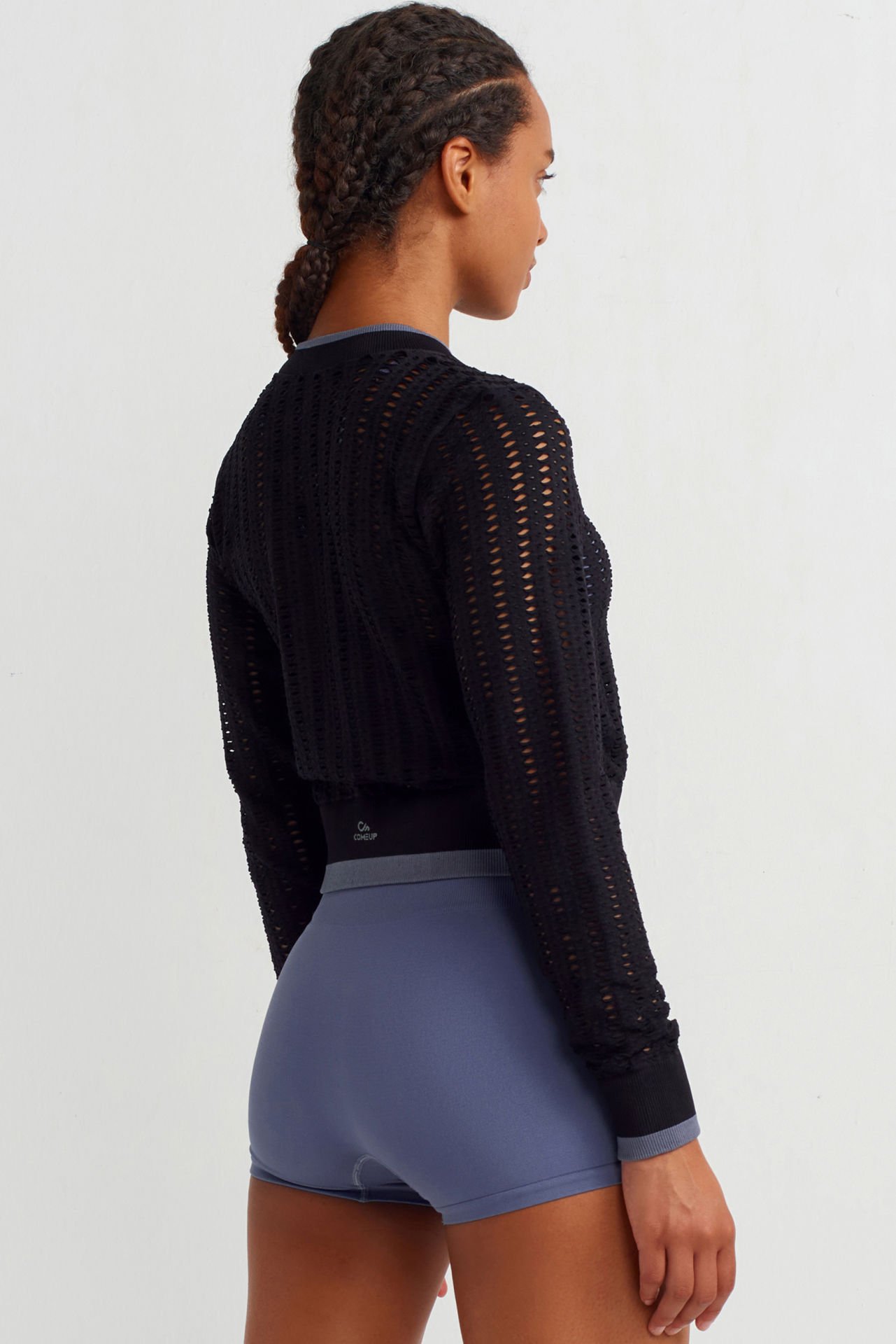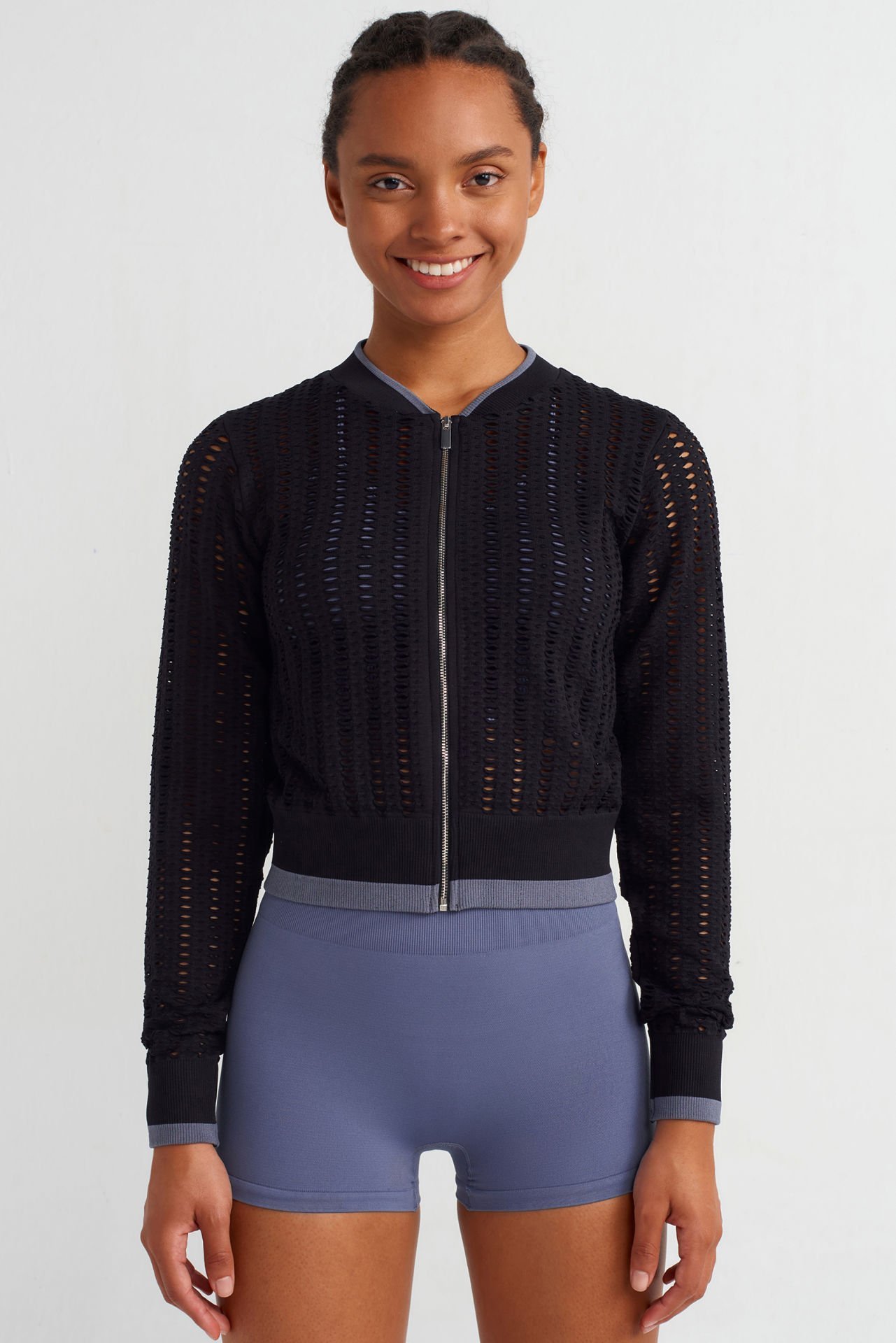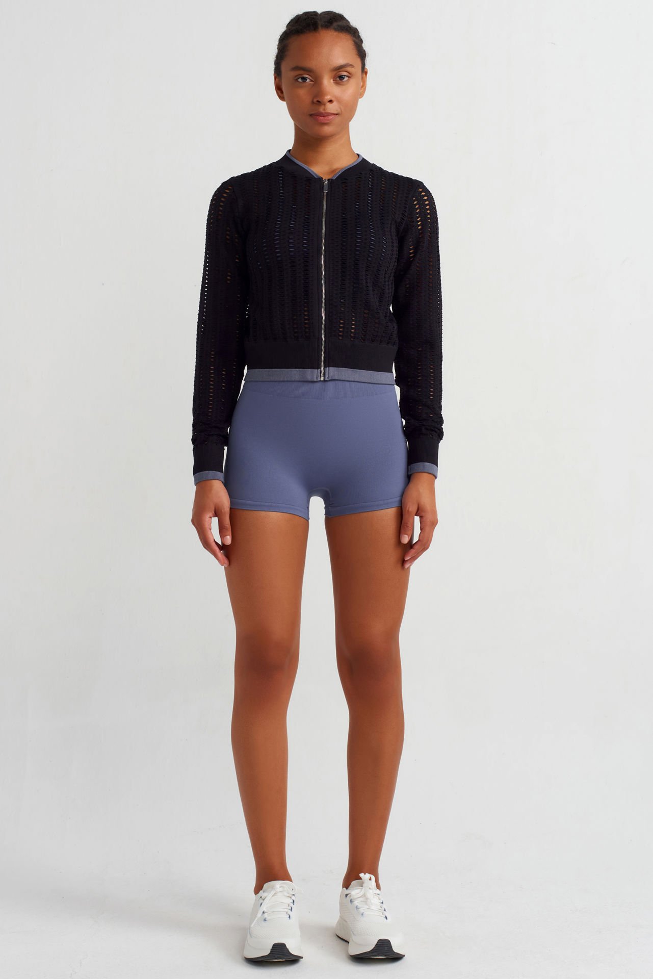 File detaylı spor ceket, beden siyah ve etek ucu kılıçbalığı mavi renkleri ile modern bir görünüm kazandırıyor.