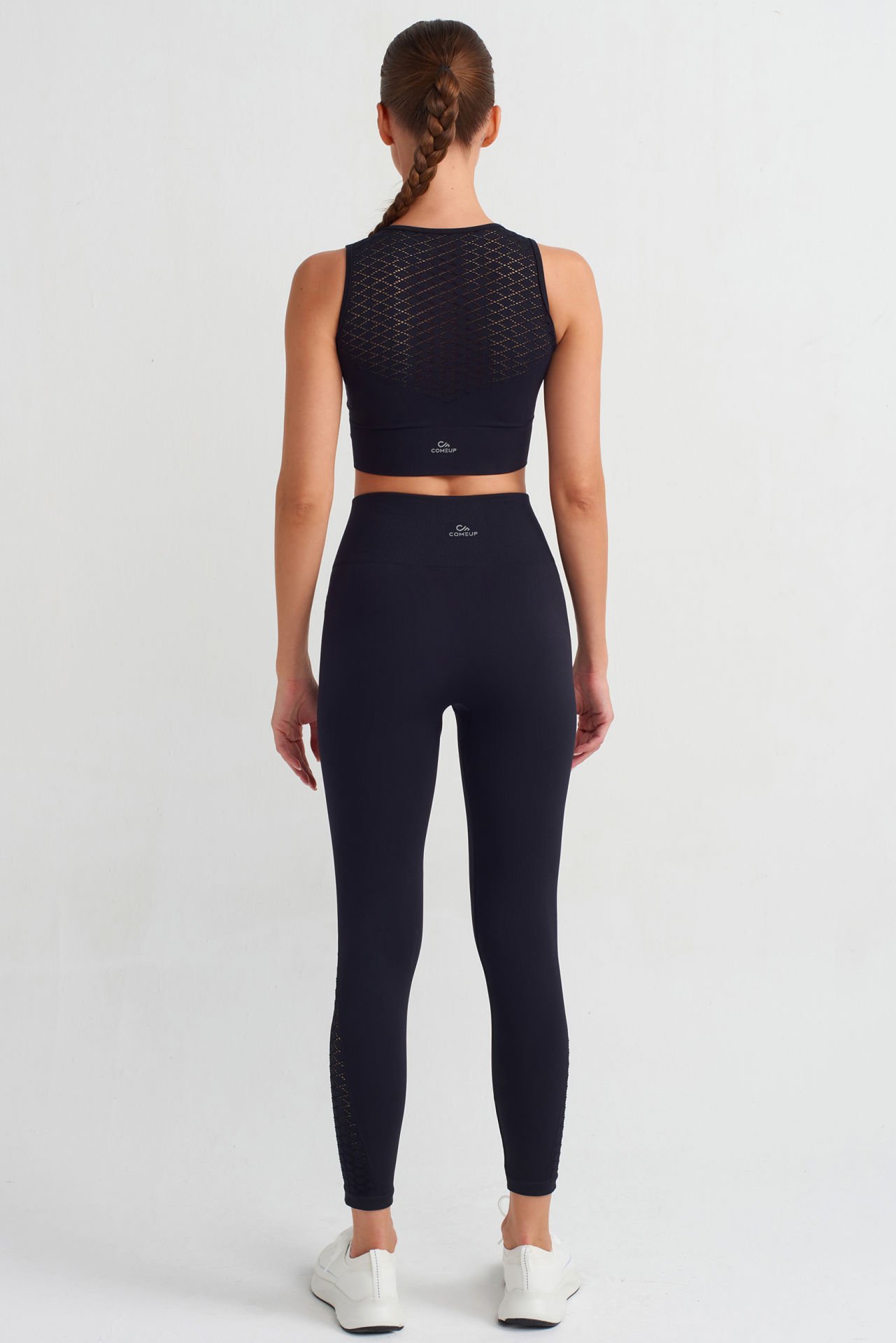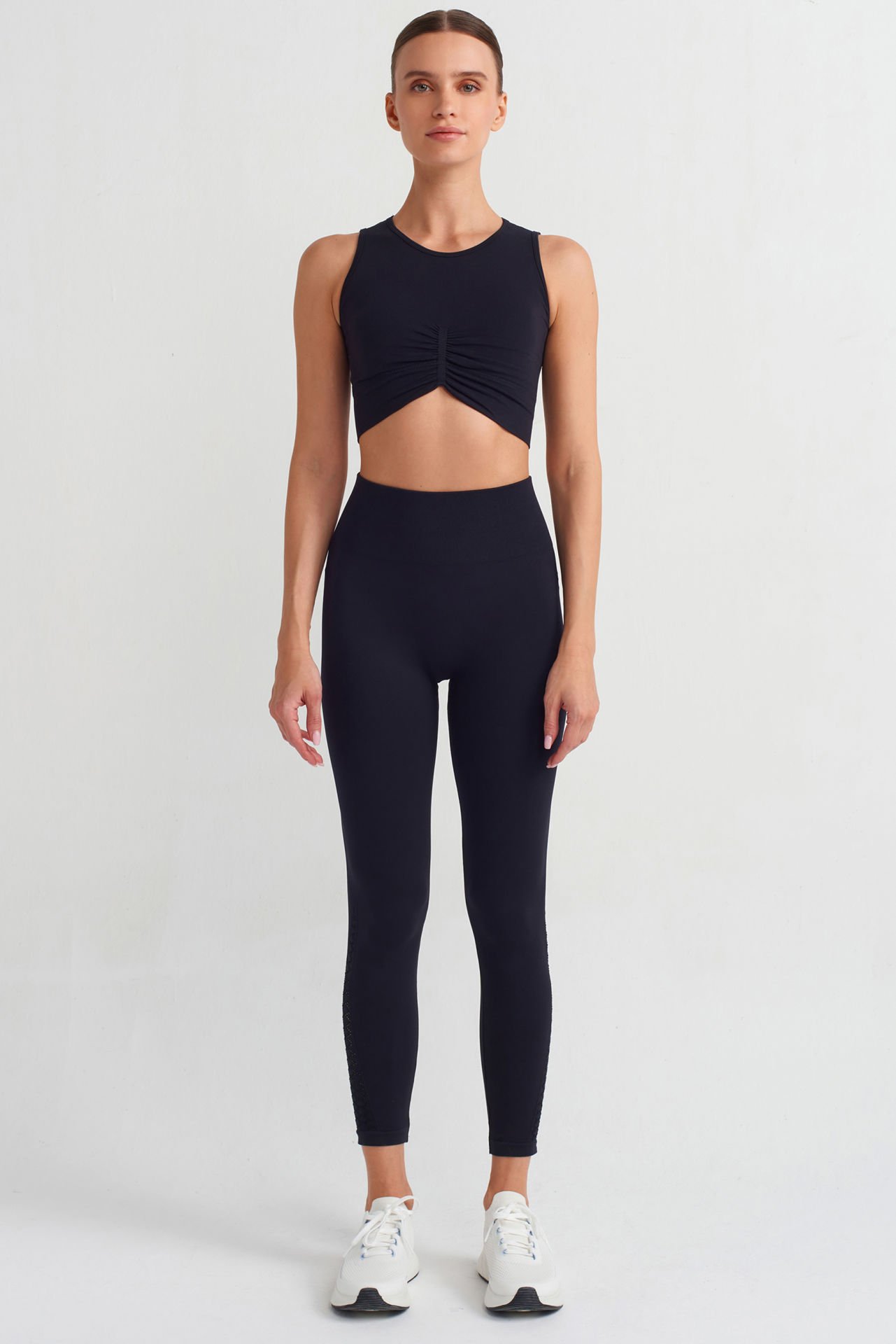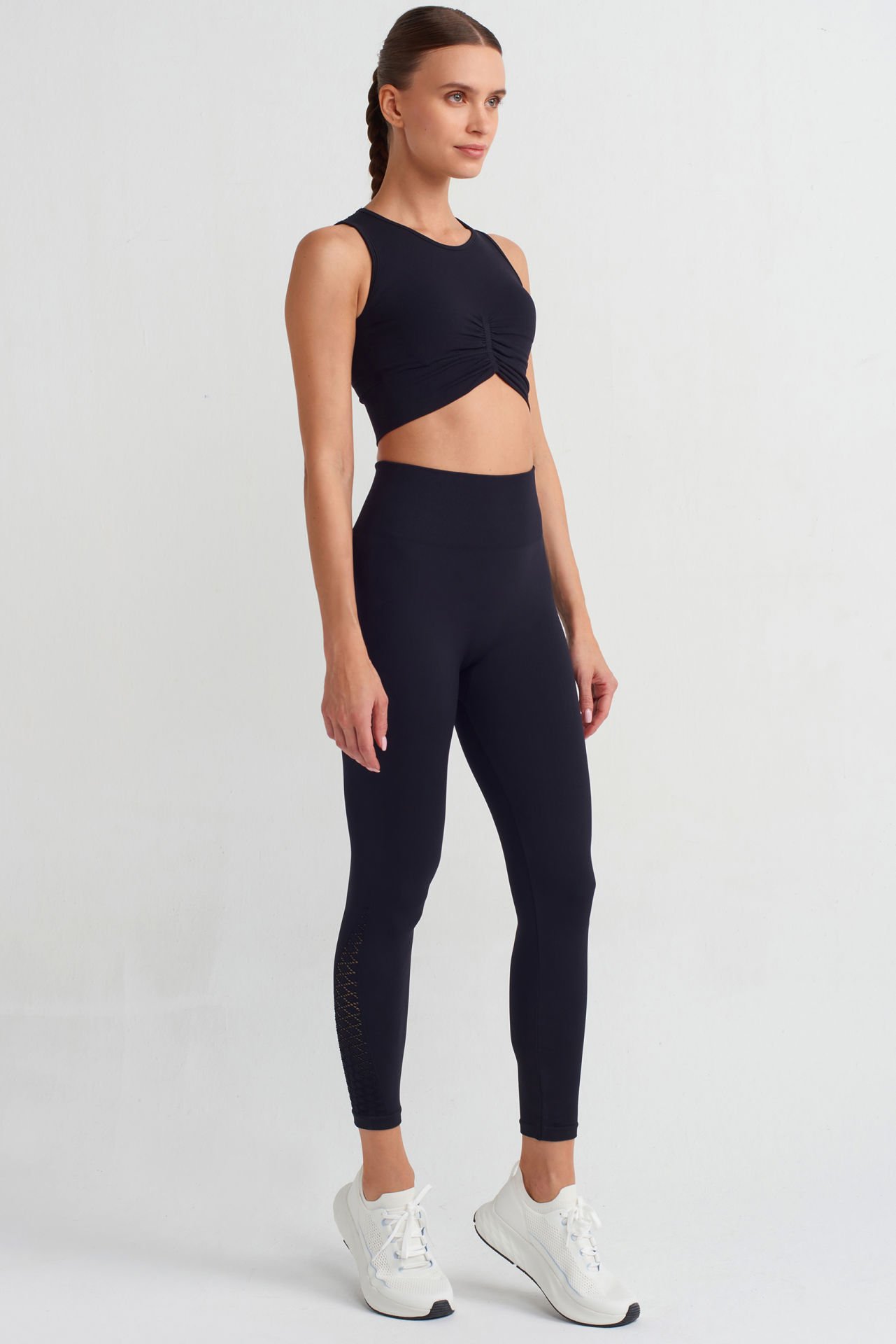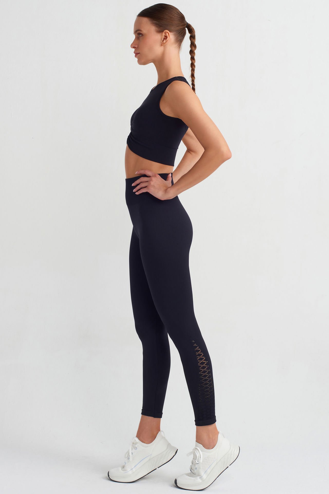 Yanlarda file detayları ile süslenen yüksek belli spor taytın bilekte biten formu, fit bir görünüm sunar.