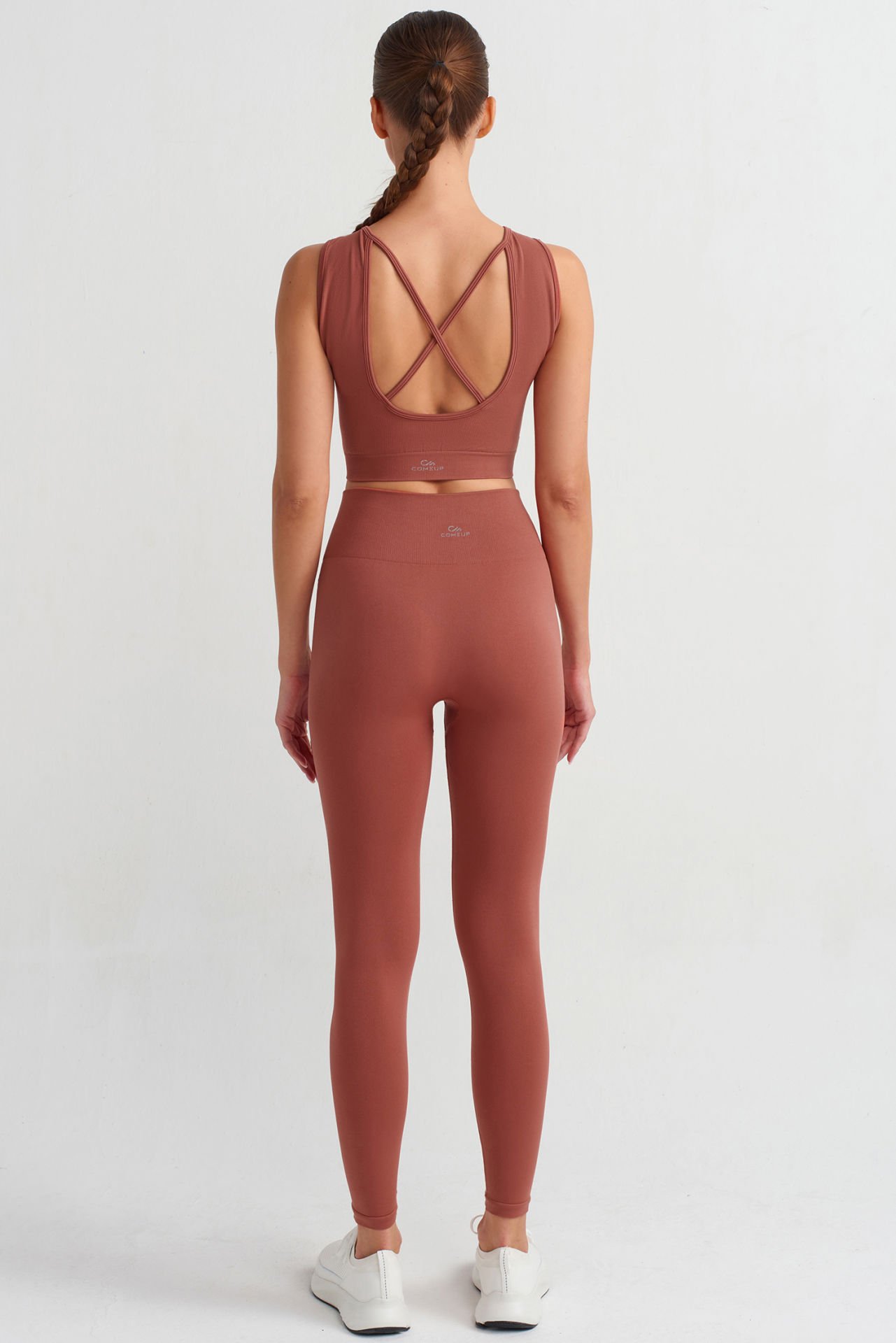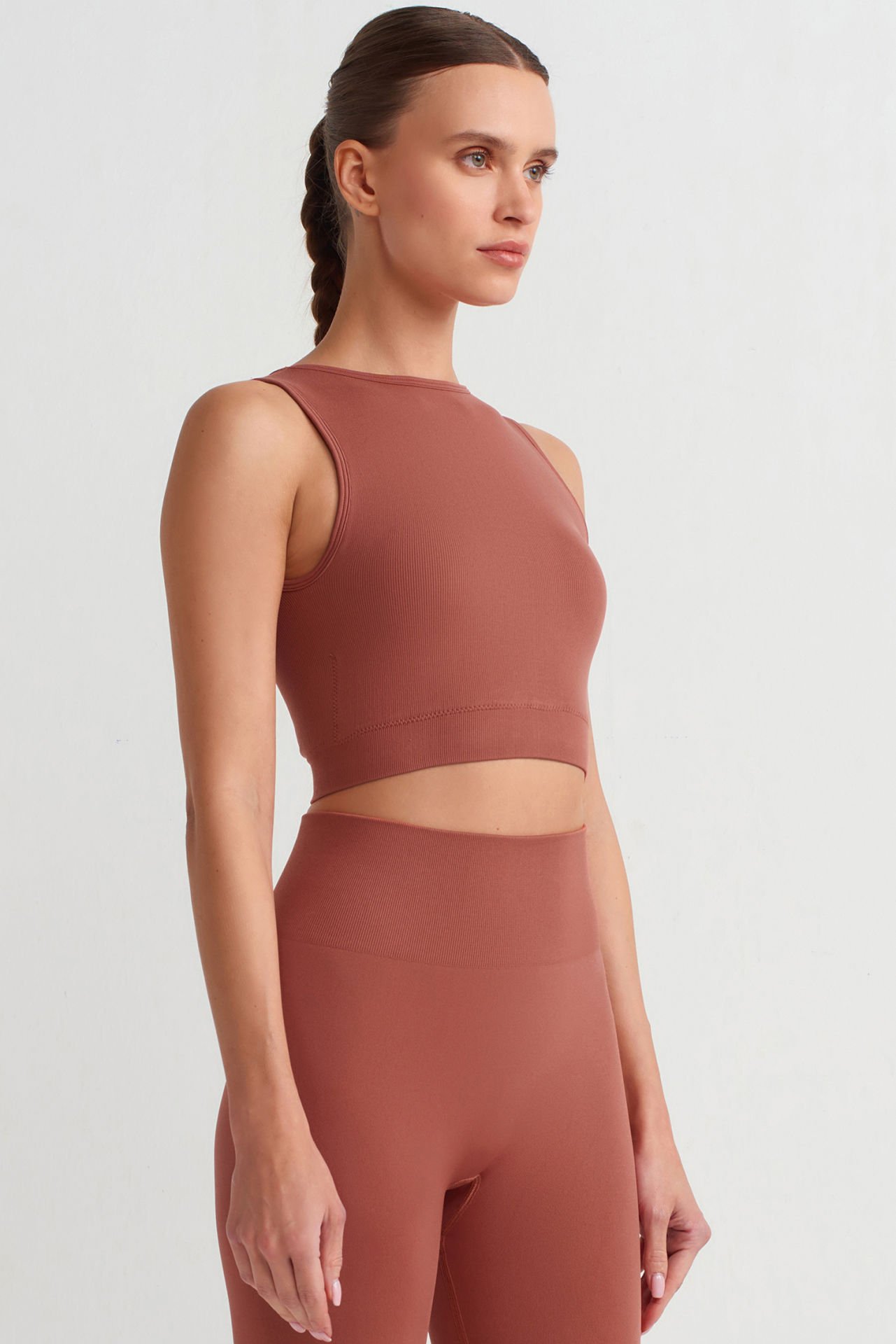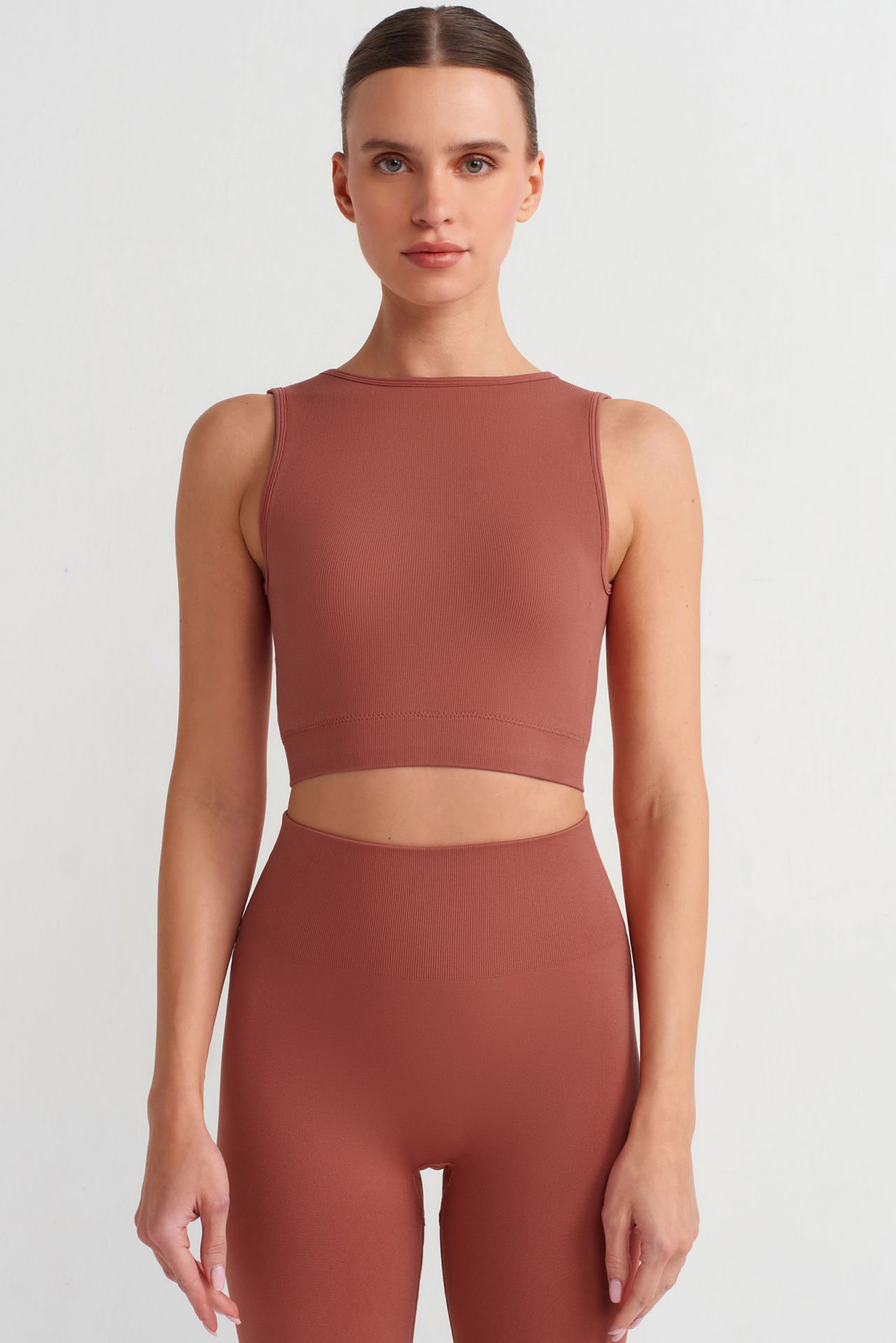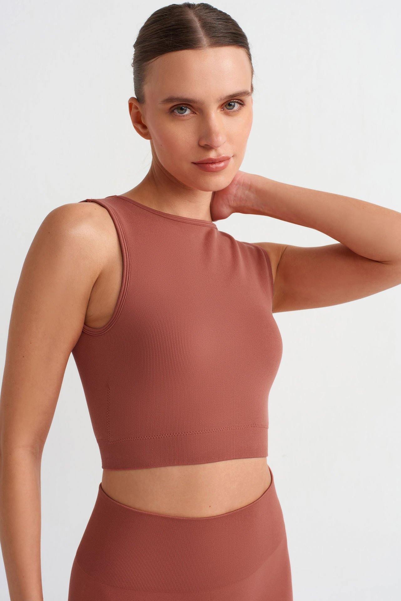Göğüs Pedli Rib Dokulu Sırtı Çapraz Crop Top Kil Kırmızısı