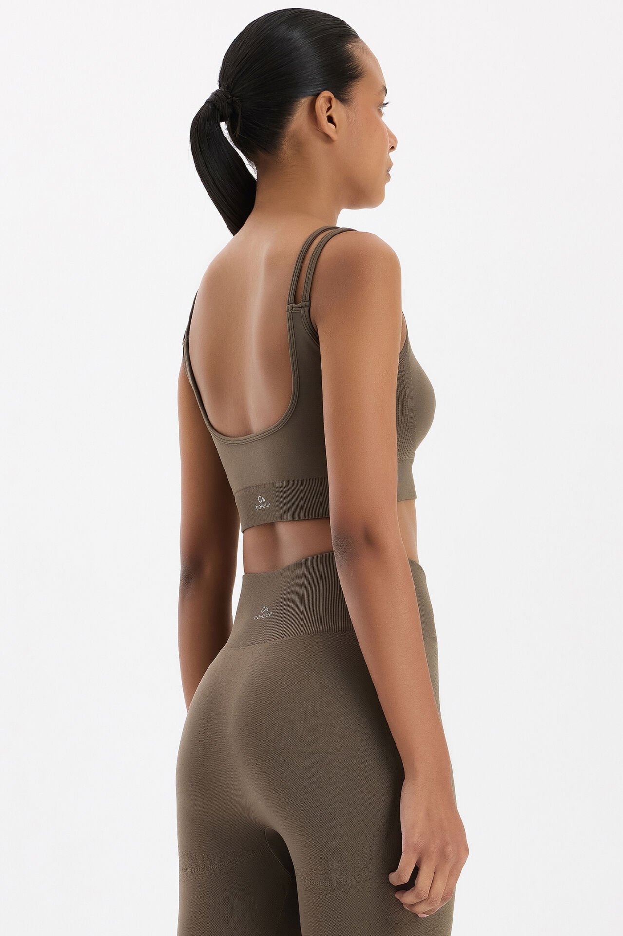 Çift omuz askısı, klasik sporcu sütyenlerine göre daha zarif ve moda odaklı bir görünüm yaratırken, hareket sırasında askıların yerinde kalmasına yardımcı olur. Dikişsiz pedli yapısı göğüsleri sıkmadan kavrar, antrenman esnasında güvenli ve rahat hissettirir. Koku oluşumunu önlemeye yardımcı, çabuk kuruyan kumaş ise terle geçen yoğun anlarda bile ferahlık hissini destekler.