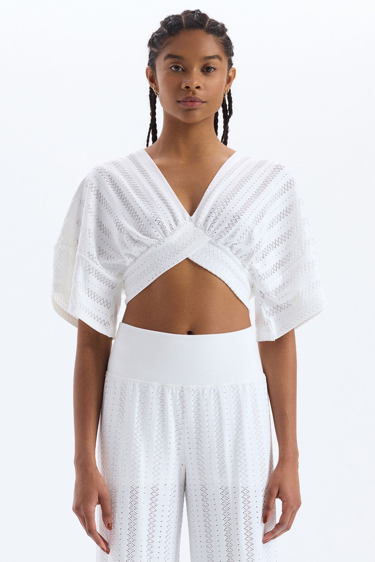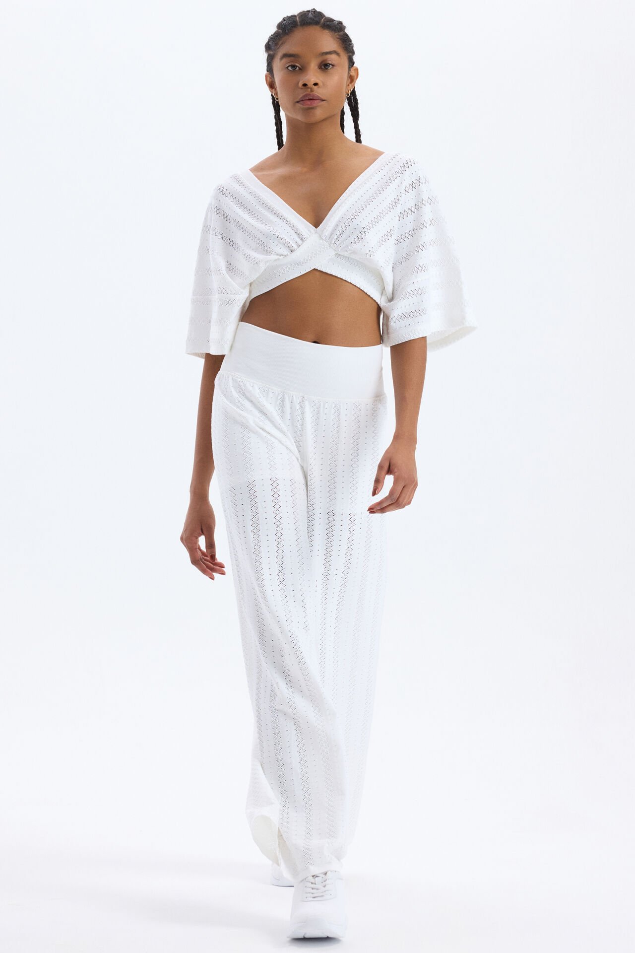 Jakarlı Delik Desenli Yarasa Kol Crop Top Beyaz