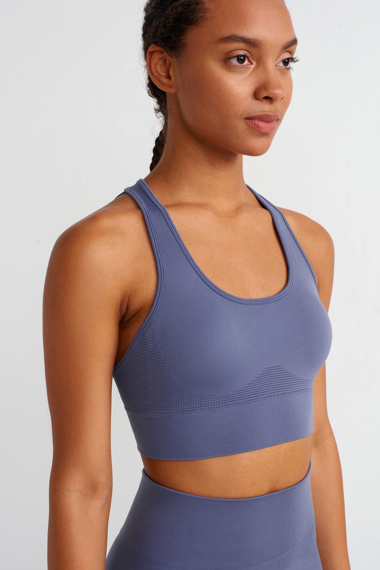 Dikişsiz kumaş teknolojisi ile üretilen spor sütyenin jakar desenleri dinamik bir dokunuş katarken, mavinin enerjik tonu canlı hissetmeni sağlar. Spor sütyenin esnek kumaşı, destekleyici yapısı ve göğüs altı lastiği spor aktivitelerinde güven ve maksimum konfor hissettirir. Takıp çıkarılabilir pedlere sahip spor sütyen, fonksiyonel bir kullanım sunar.