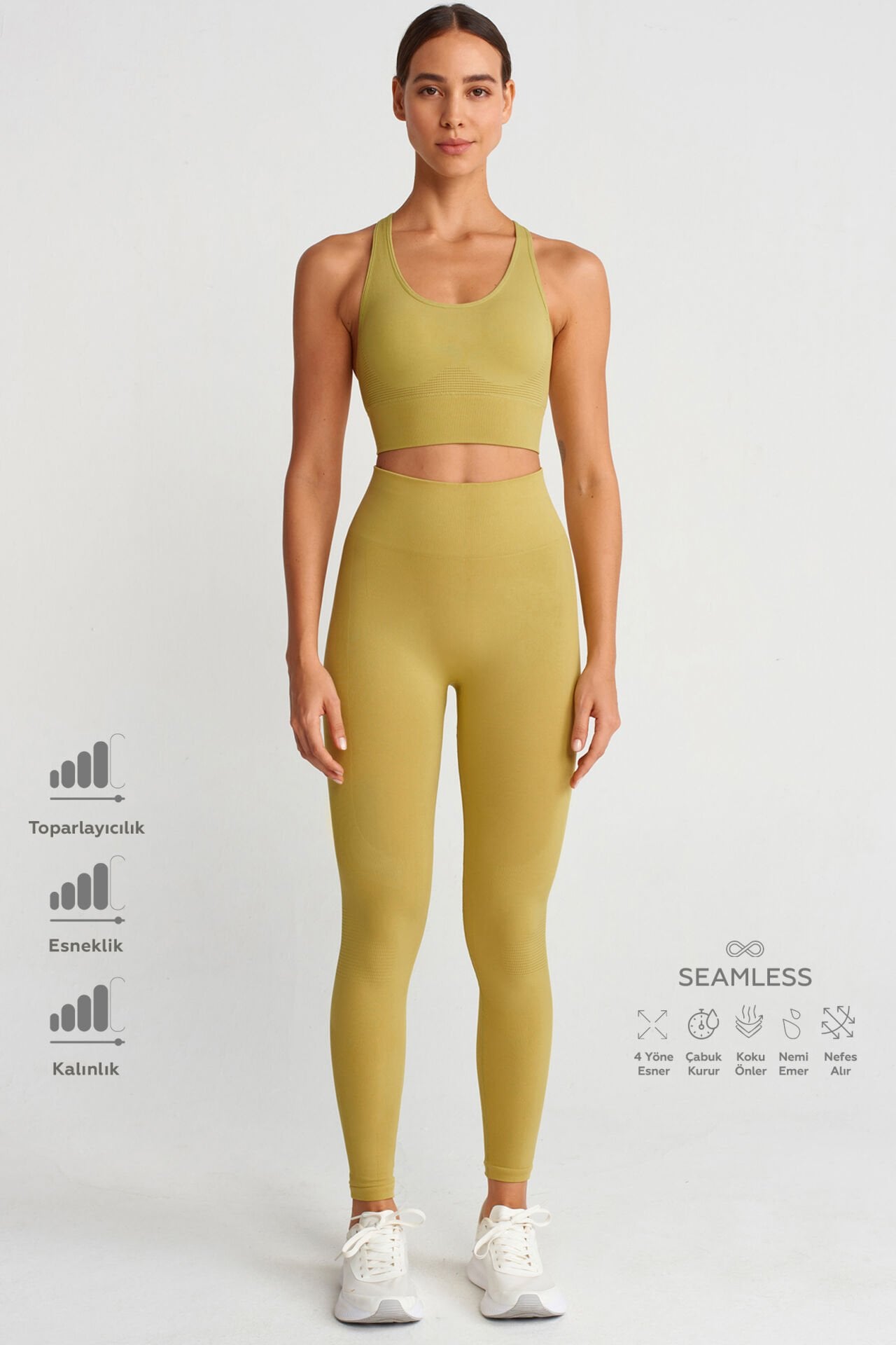 Lime push up tayt, stratejik noktalarda kullanılan özel örgü detayları ile ekstra toparlanma ve kusursuz görünüm sağlar. Teknik detaylarla donatılan spor tayt dikişsiz teknolojisi sayesinde cilt tahrişlerini azaltır, ek ağ ve esnek kumaşı en zorlu antrenmanlarda bile hareket özgürlüğü sağlar.