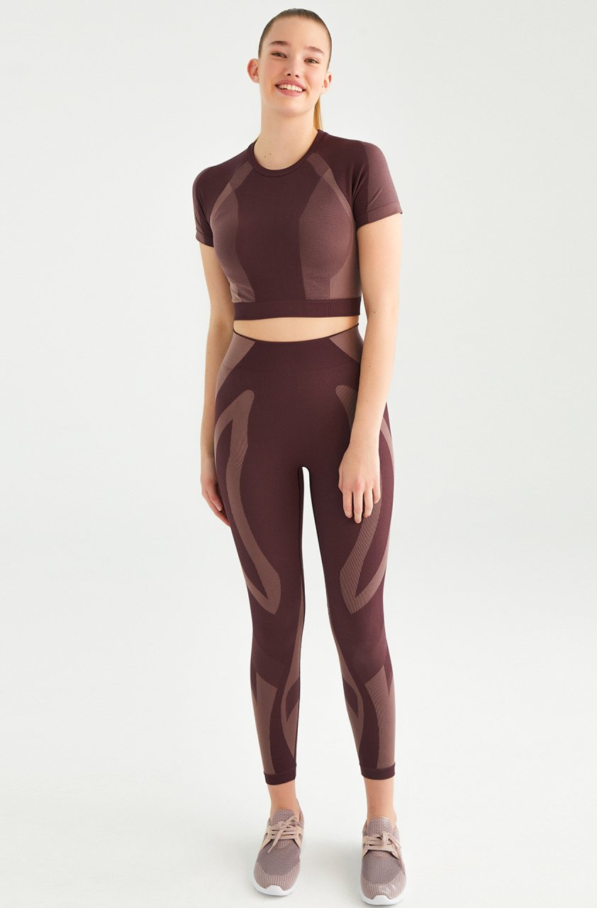 Grafik tasarıma sahip kısa kollu crop top egzersiz sırasında hızlı kuruma özelliğine sahip teknik kumaş ile tasarlanmıştır.