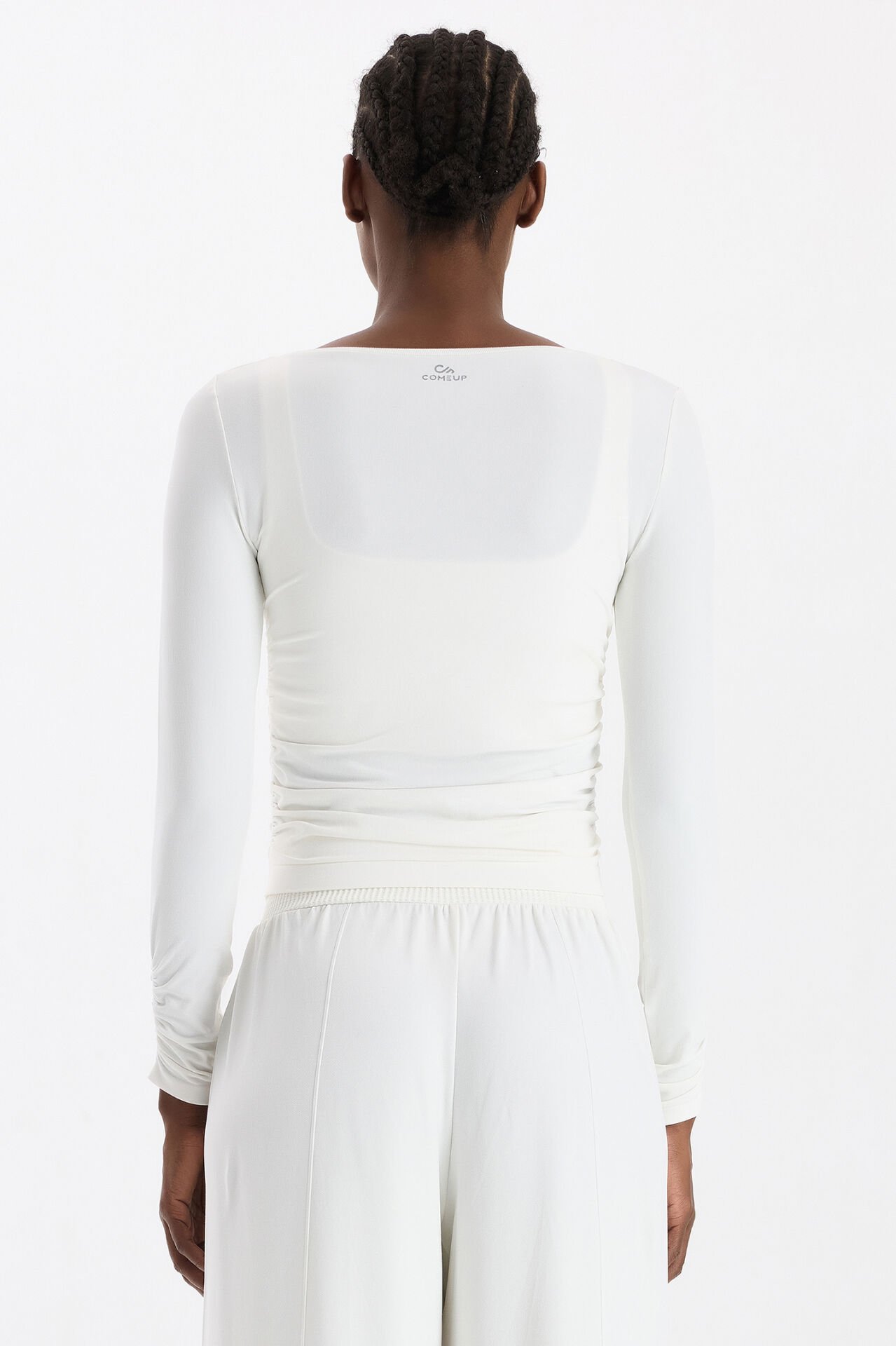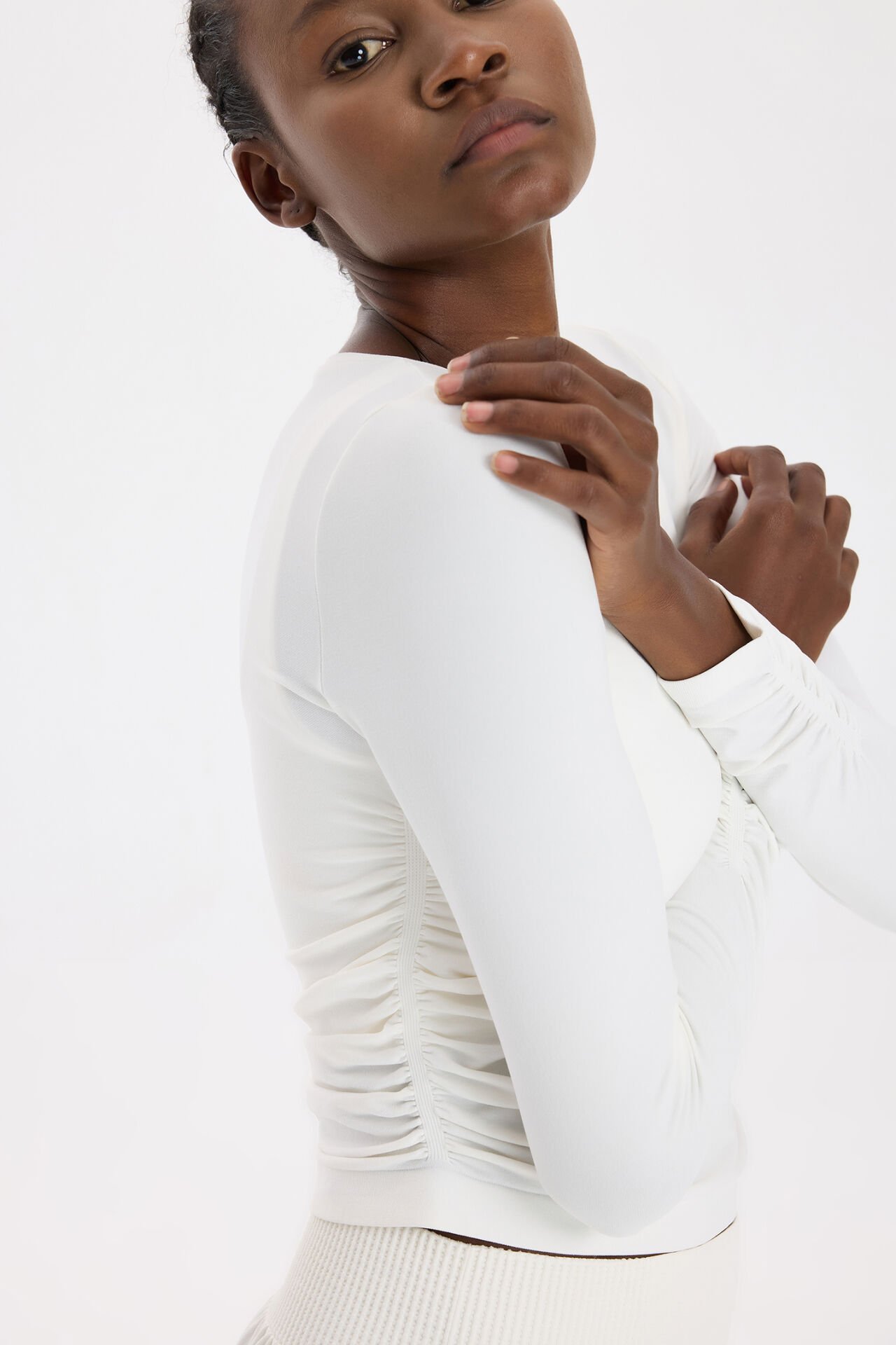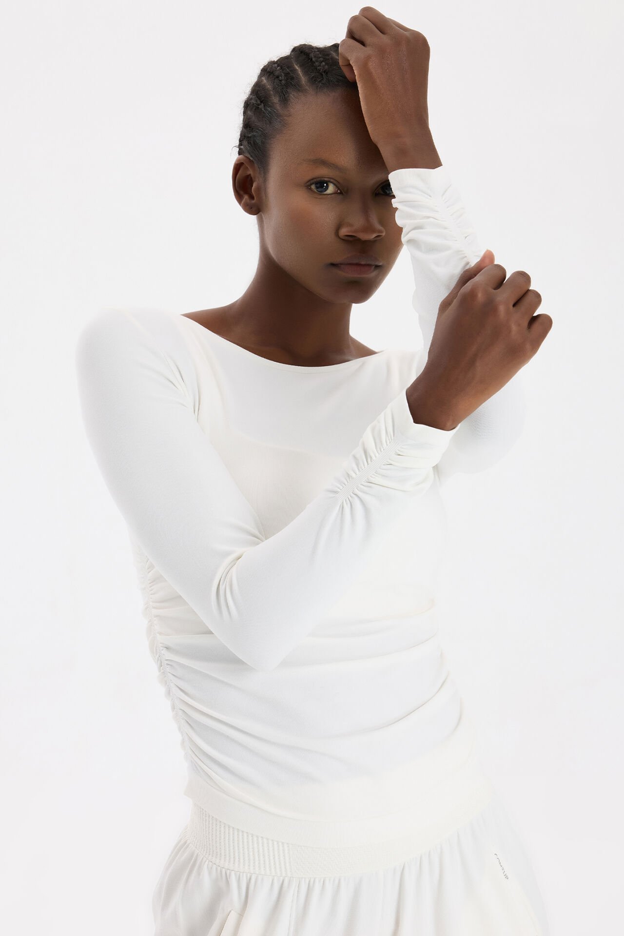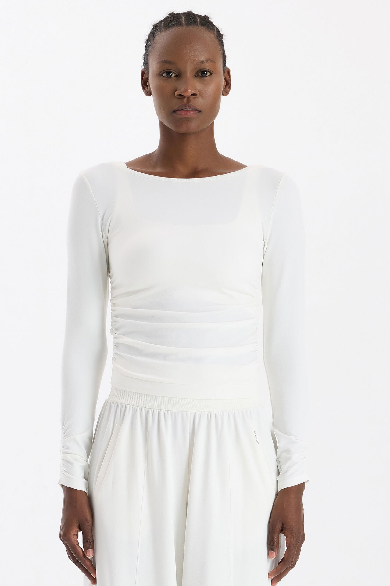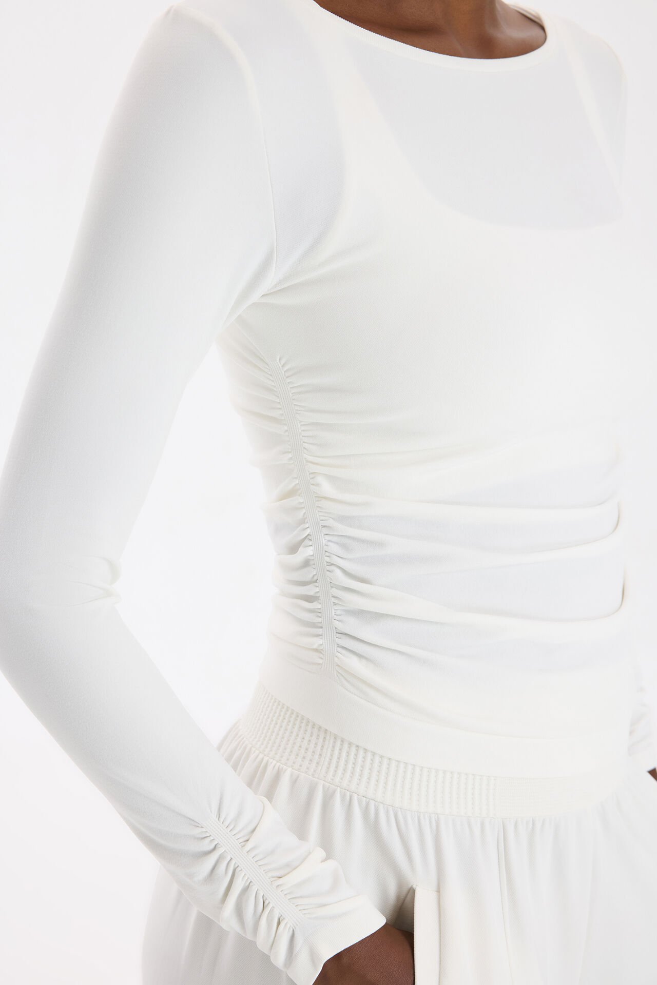 Kolları ve Yanları Büzgülü Uzun Kollu Spor Üst Kırık Beyaz