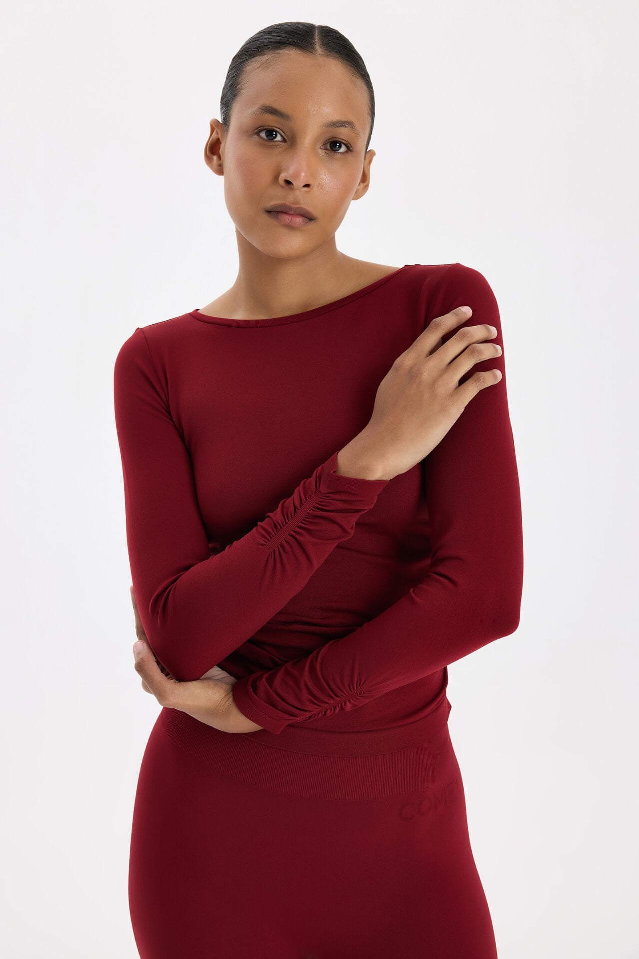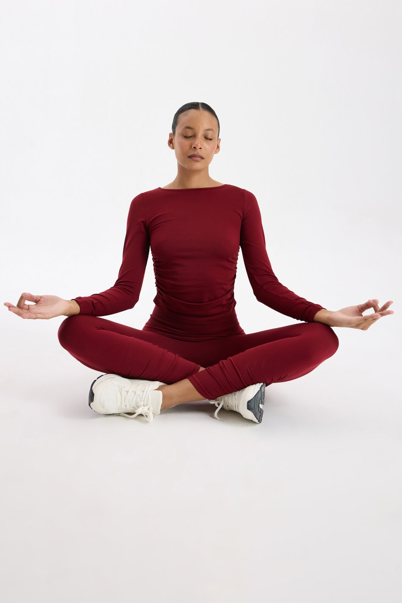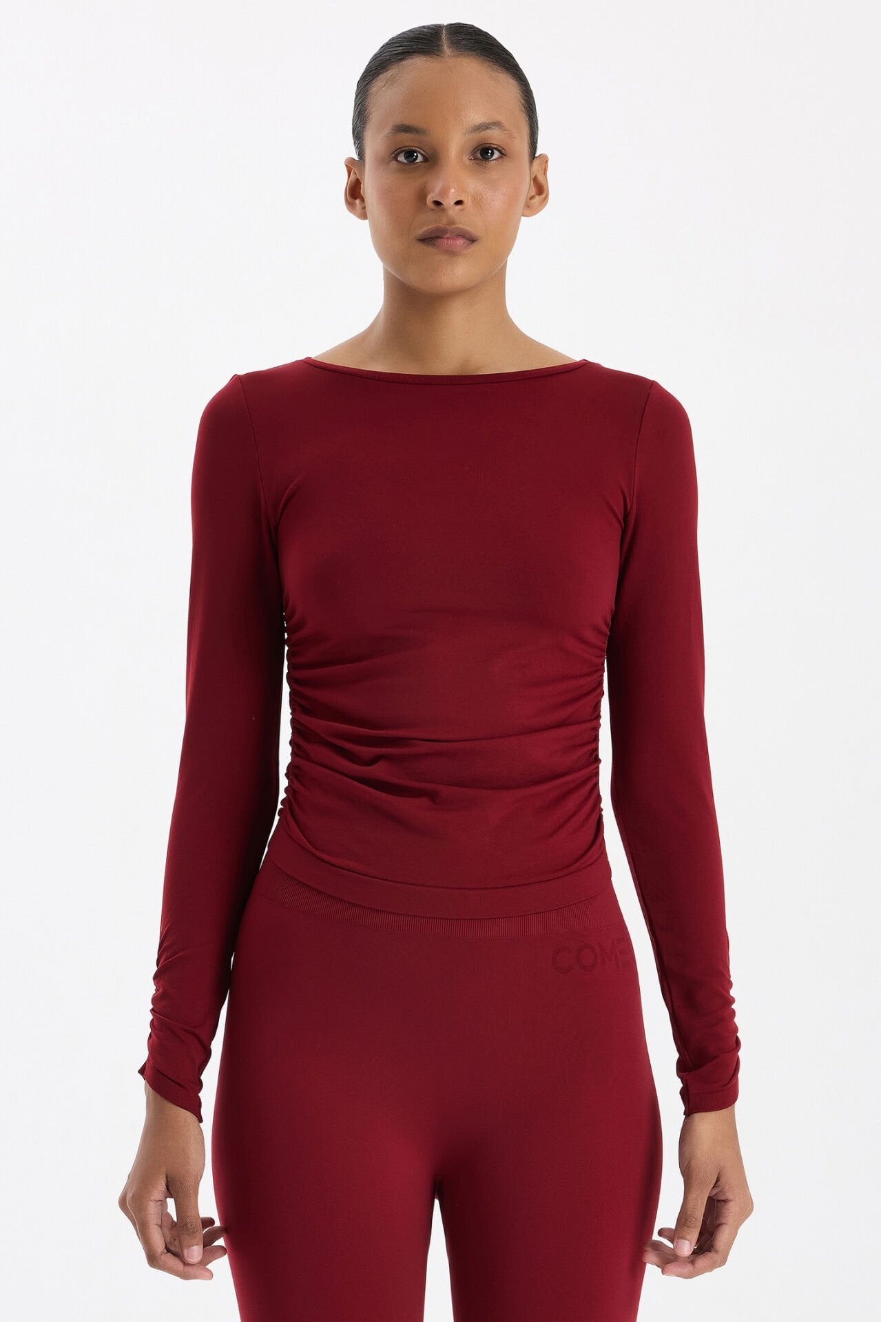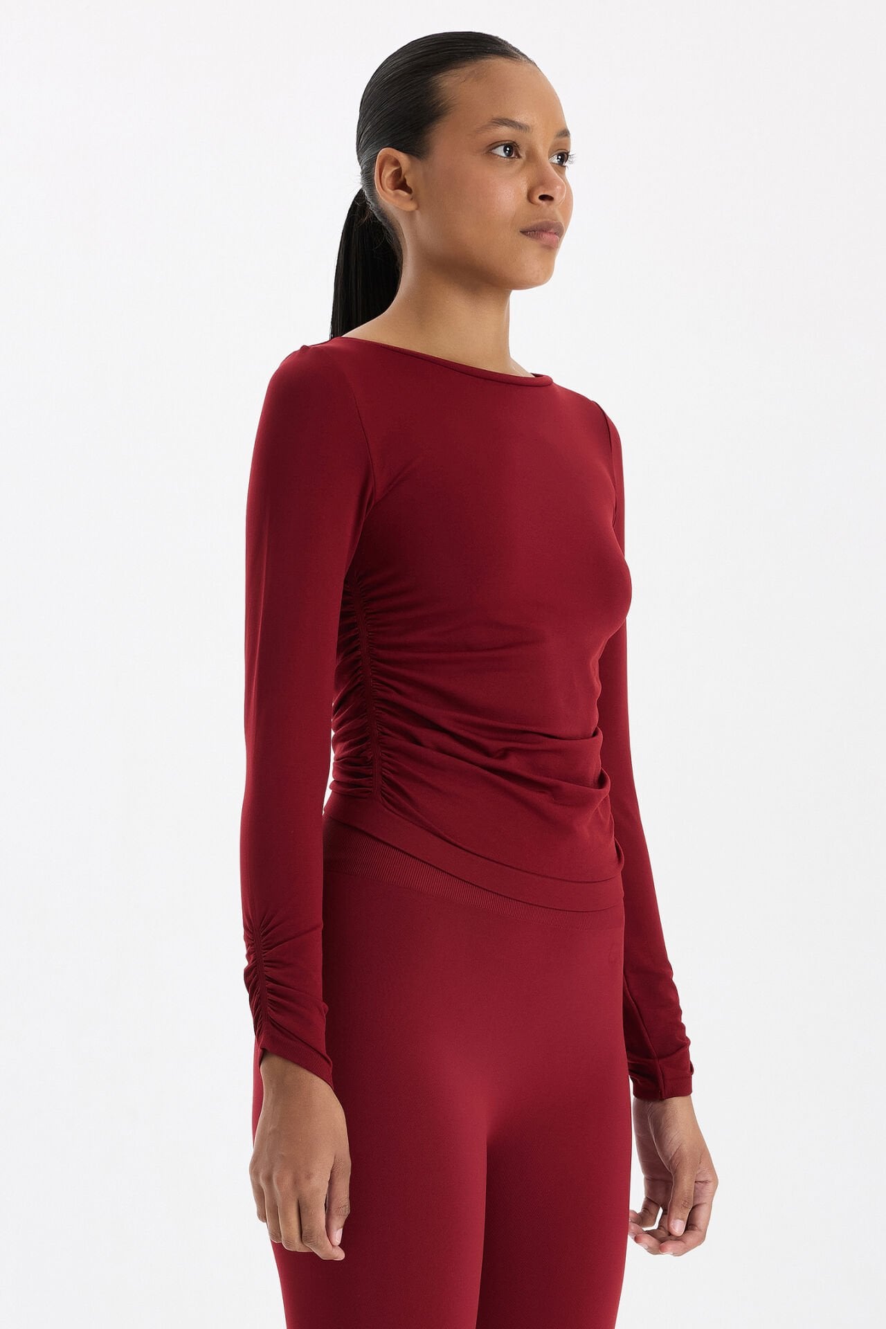 Kolları ve Yanları Büzgülü Uzun Kollu Spor Üst Scarlet Kırmızı, enerjik rengiyle cesur bir tarz sunar. Yumuşak, nefes alabilir kumaşı, vücudu nazikçe sararak konforlu bir kullanım sağlar ve gün boyu ferah kalmanı destekler.
