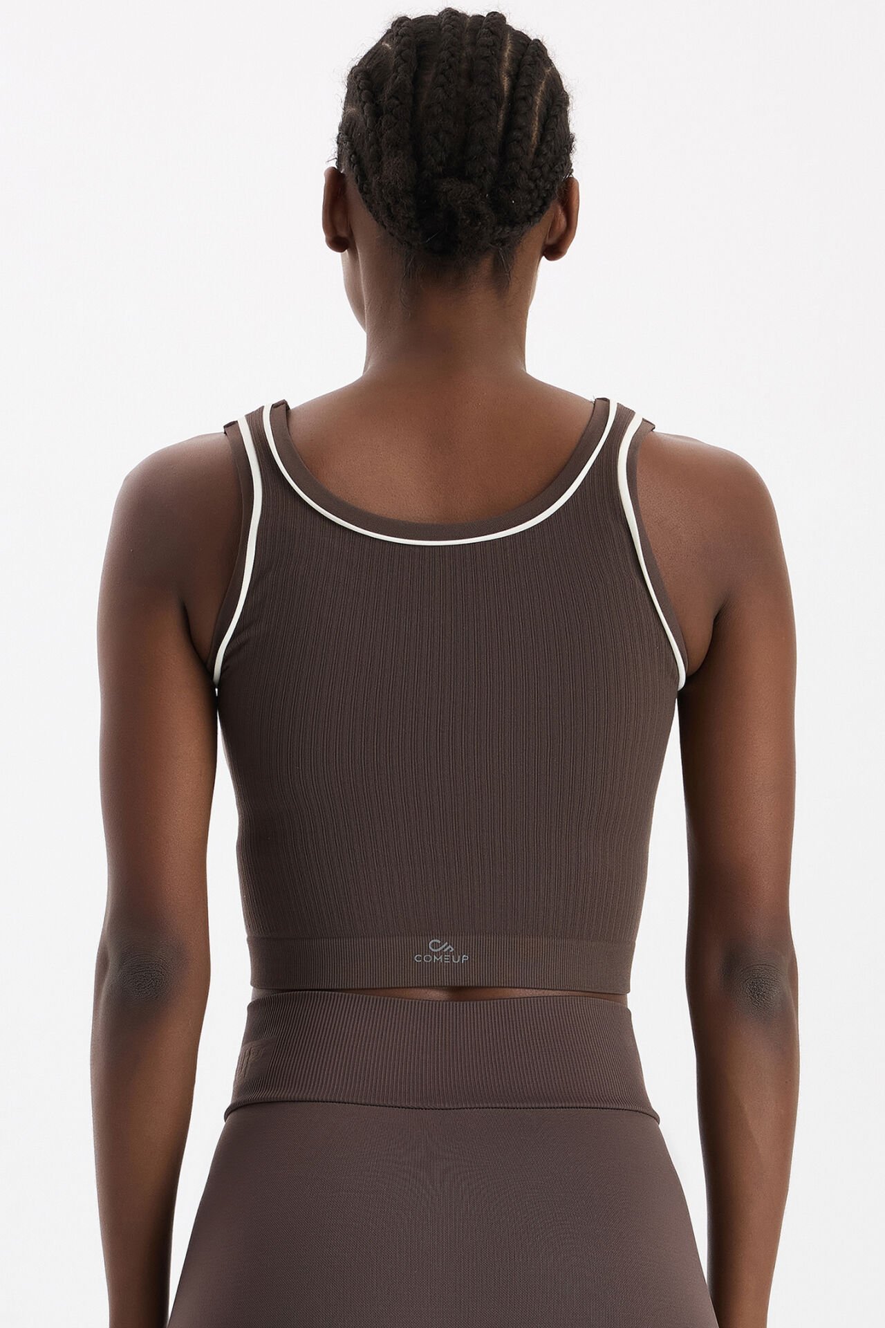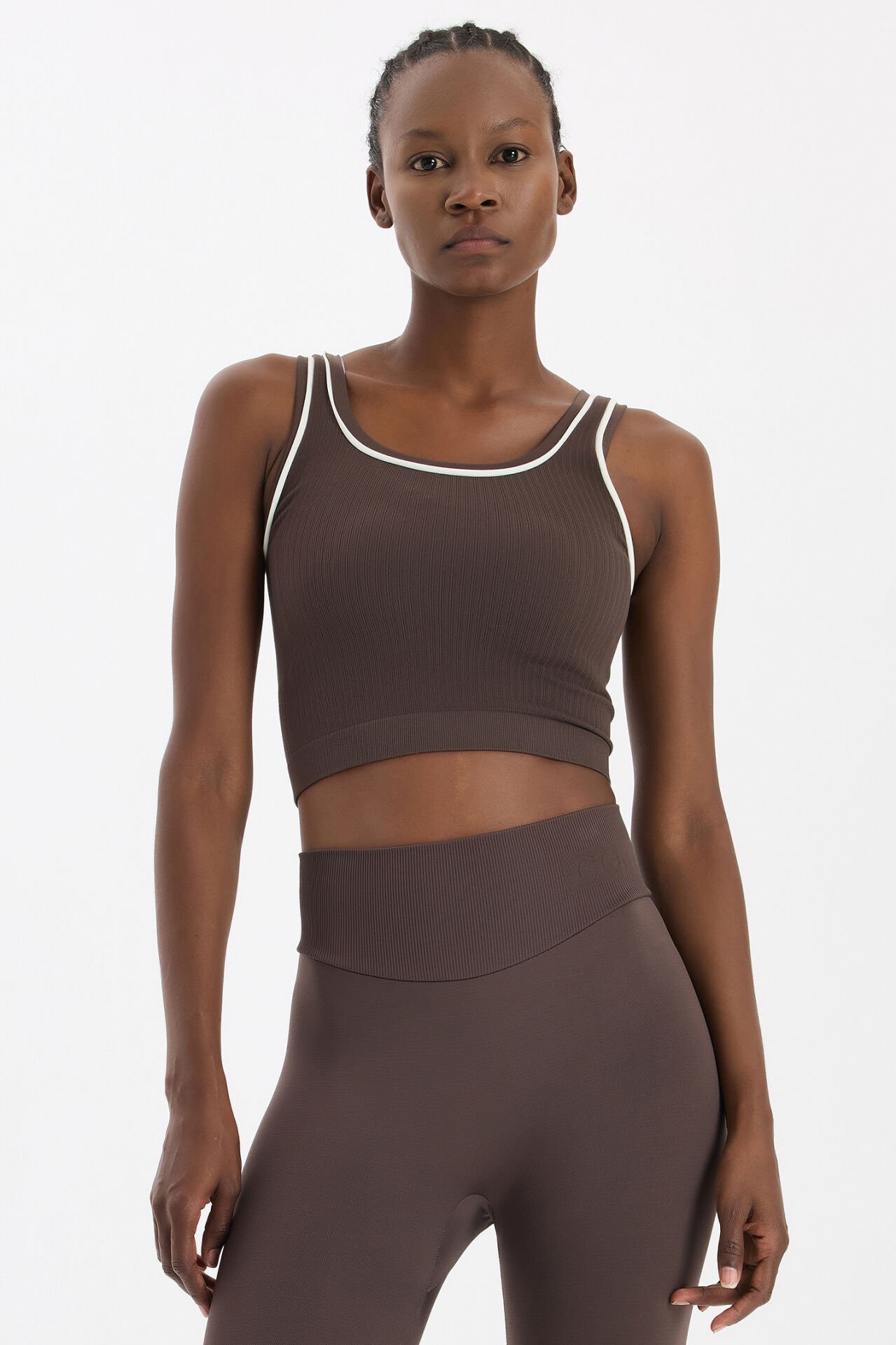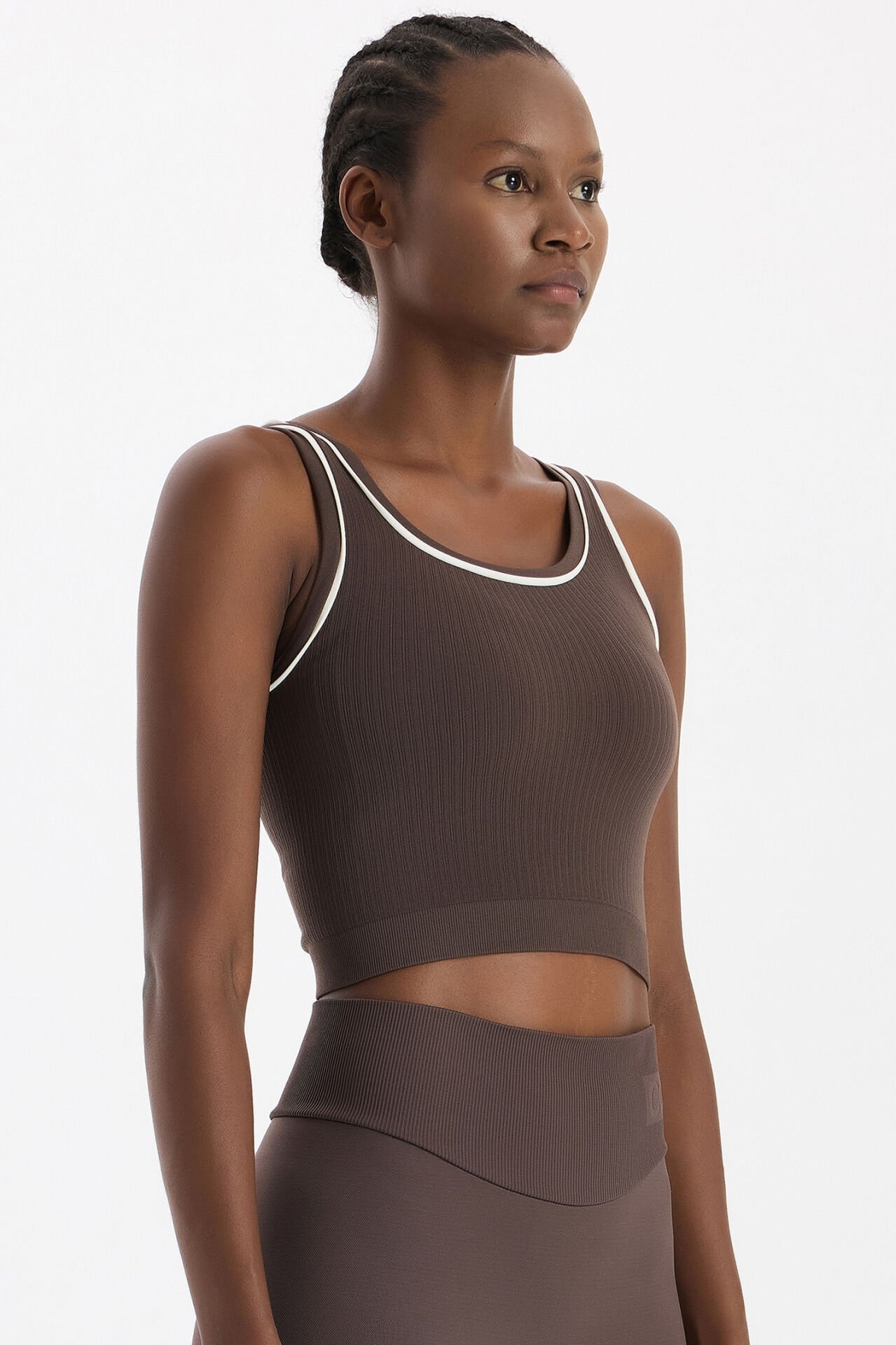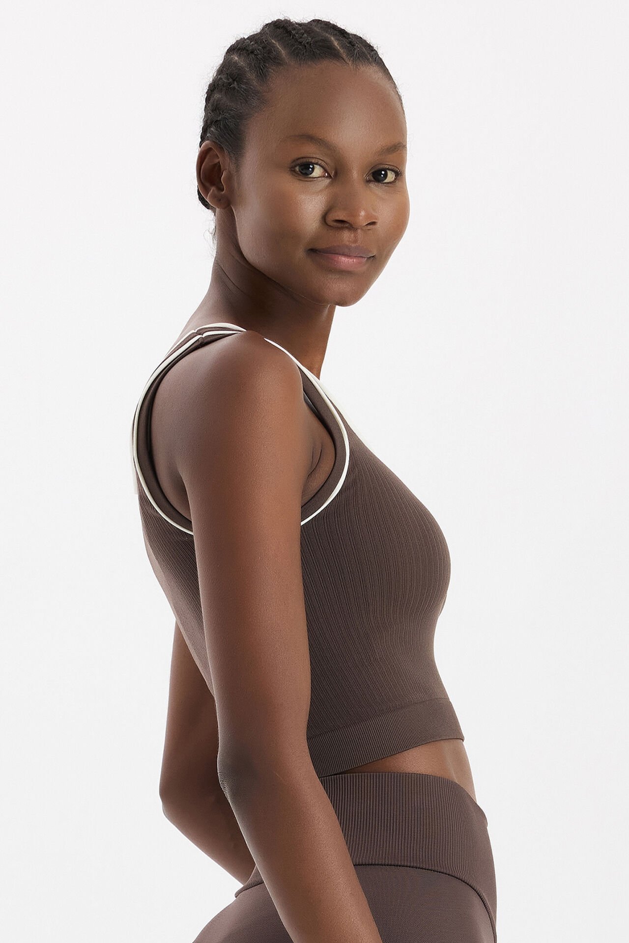 66784 Kontrast Biyeli Fitilli Atlet, kakao dansı tonunun sıcak enerjisini kırık beyaz biyelerin zarif kontrastıyla buluşturuyor. Dikişsiz örgü teknolojisiyle üretilen bu model, fitilli kumaş dokusuyla vücudu nazikçe sarar ve yumuşak bir his sağlar.