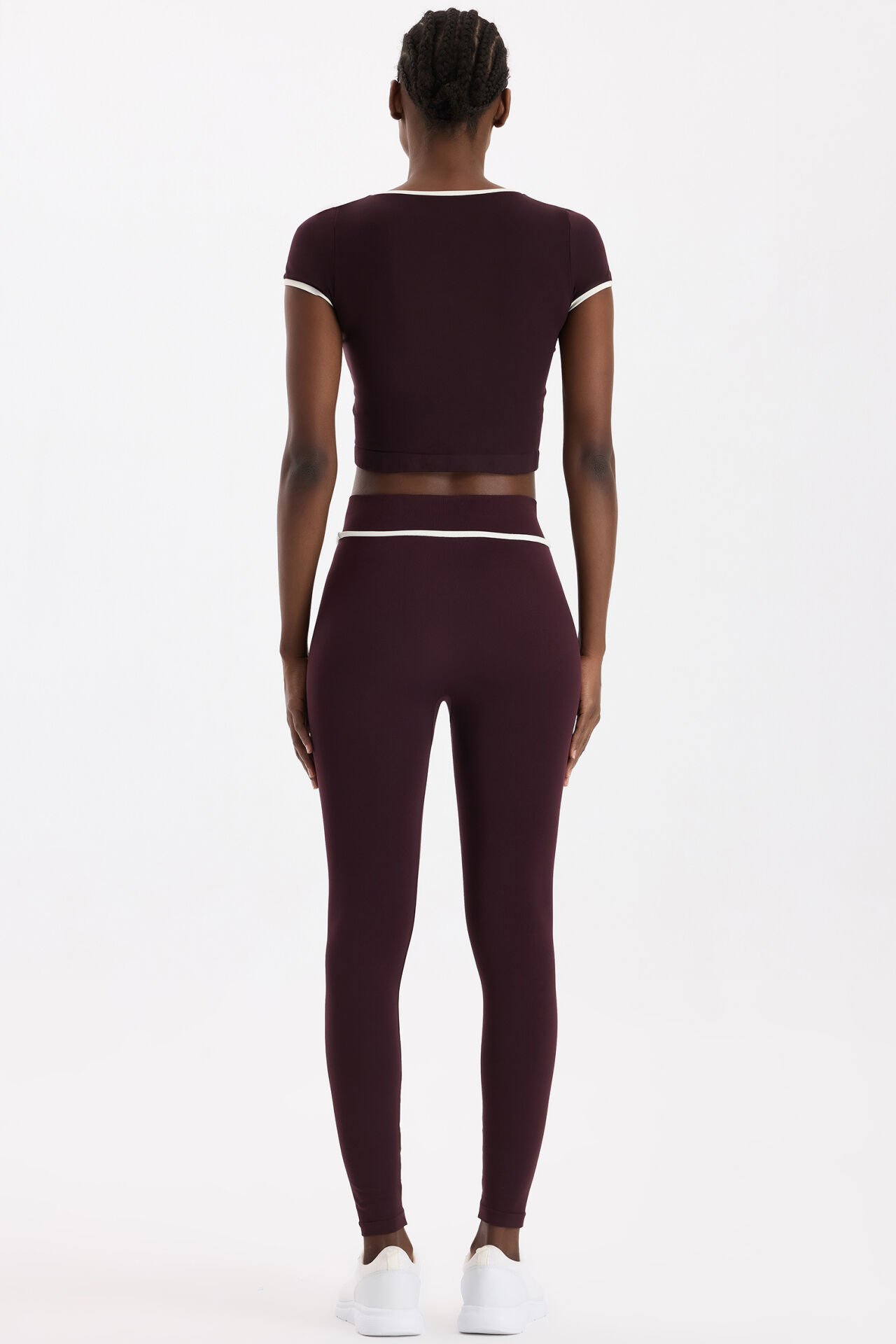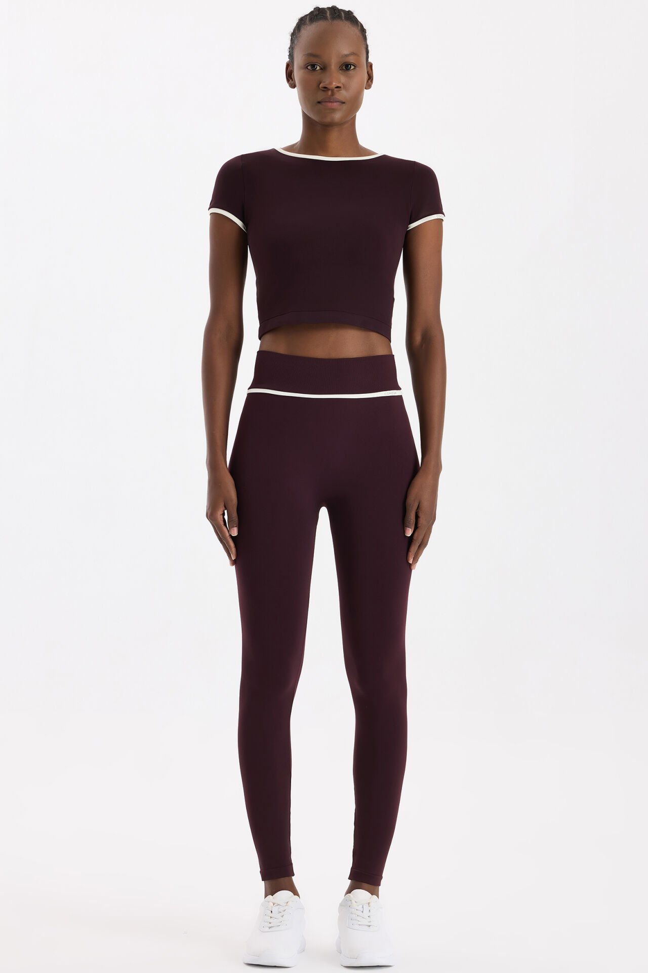 Comeup’ın Burgundy Toparlayıcı Dikişsiz Taytı, sıcak bordo tonunu kontrast kırık beyaz biyesiyle buluşturarak güçlü bir duruş sergiler.