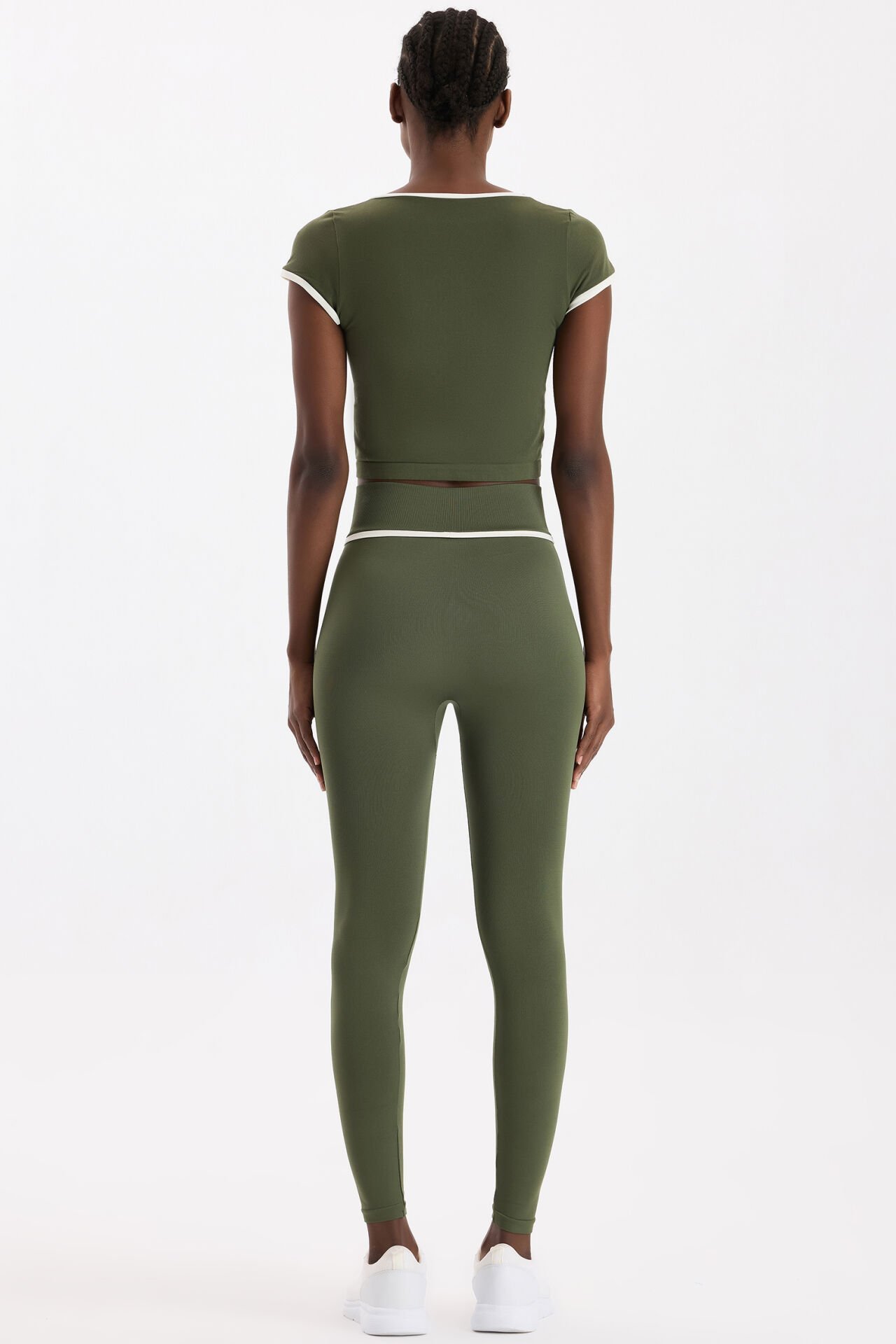 Kontrast Biyeli Spor Tayt Koyu Yaprak Yeşili
