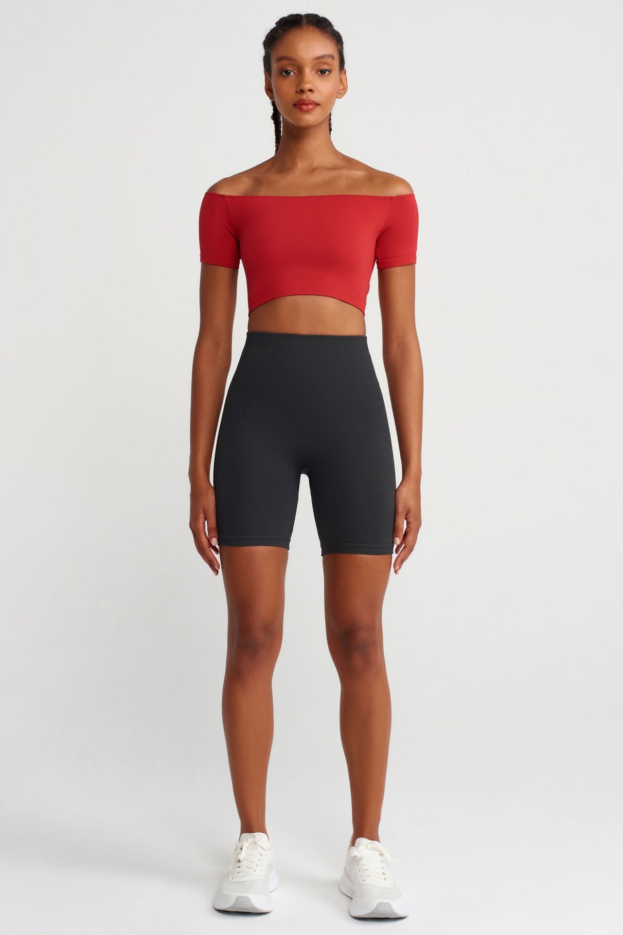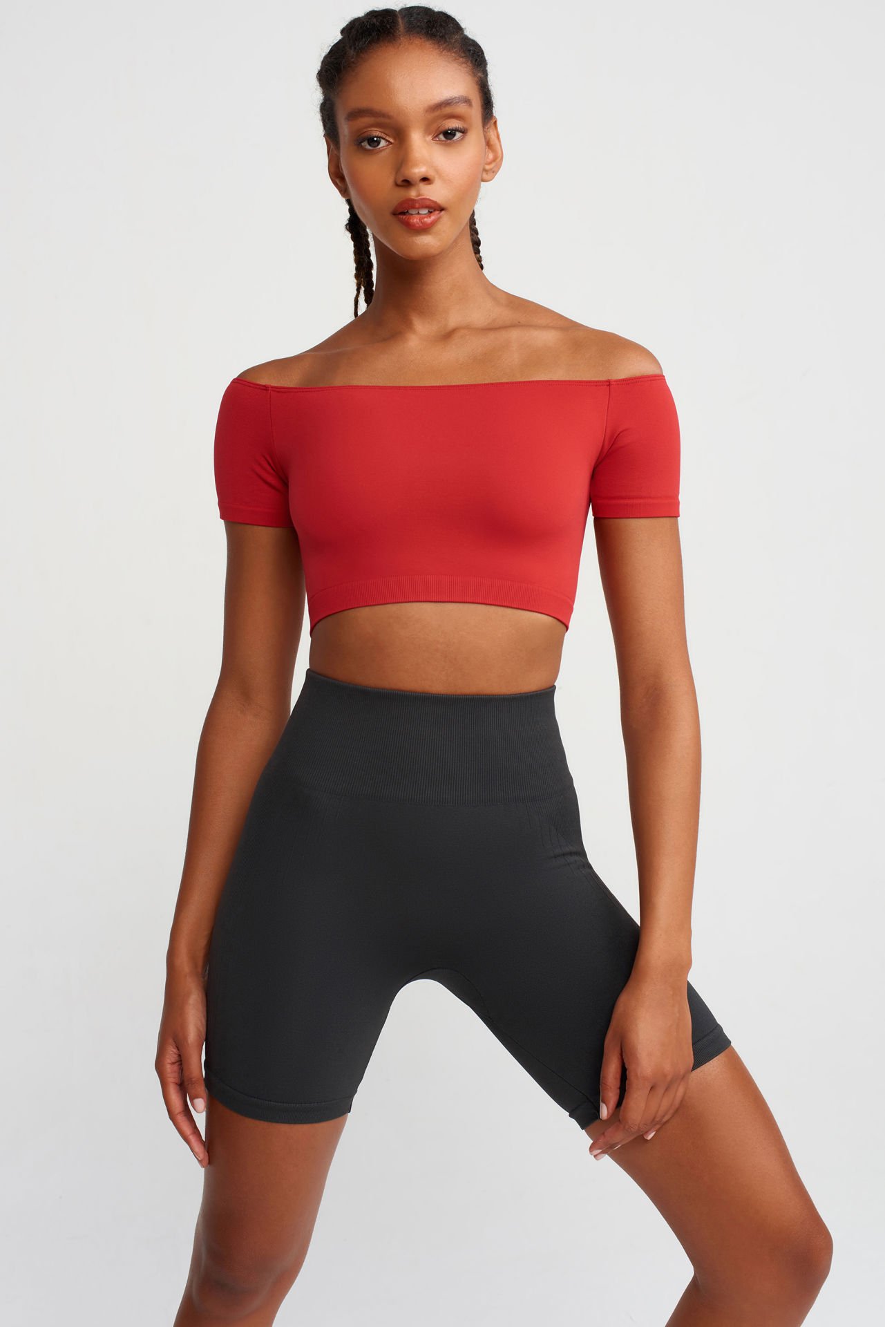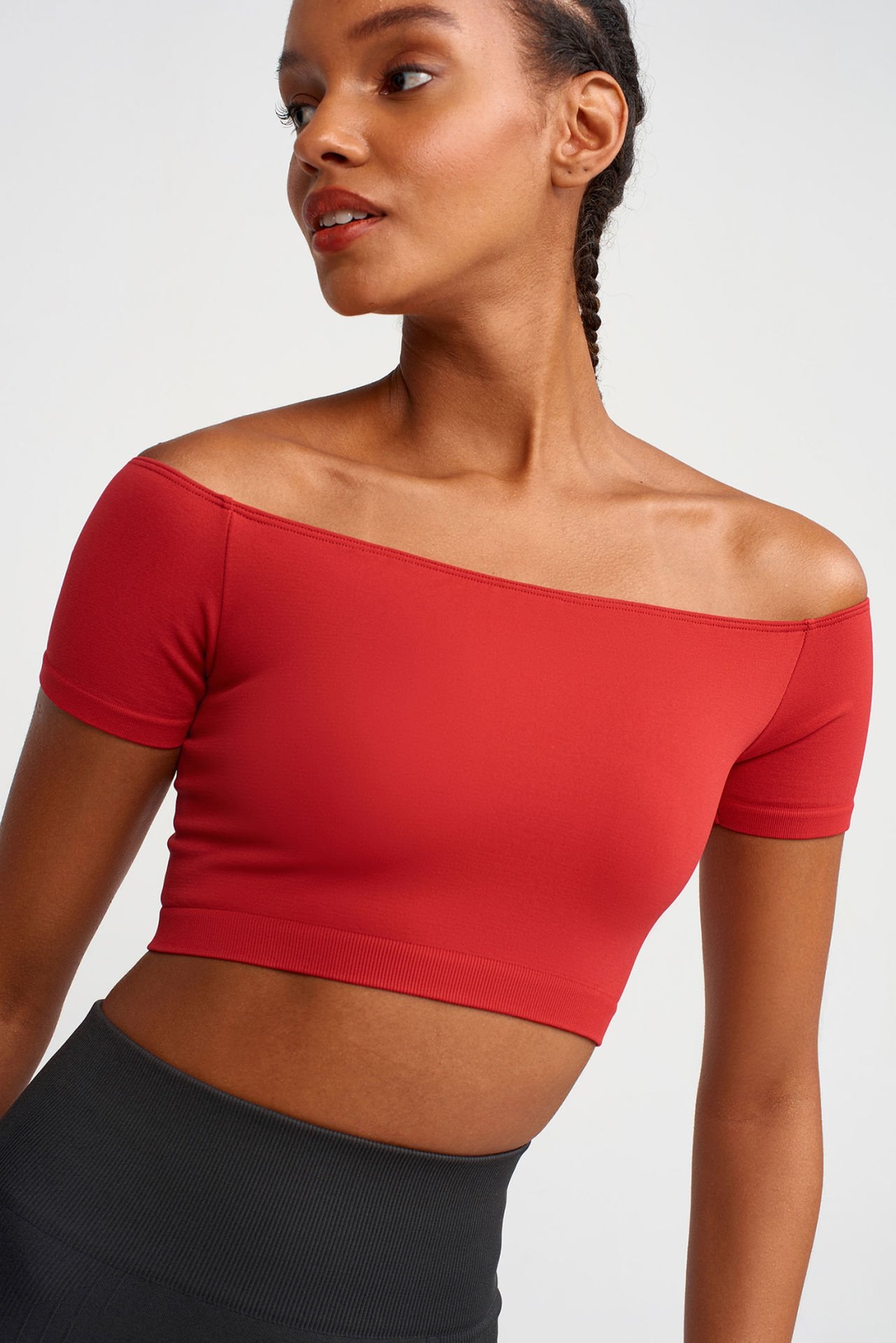 -Omuzu açıkta bırakan crop top.