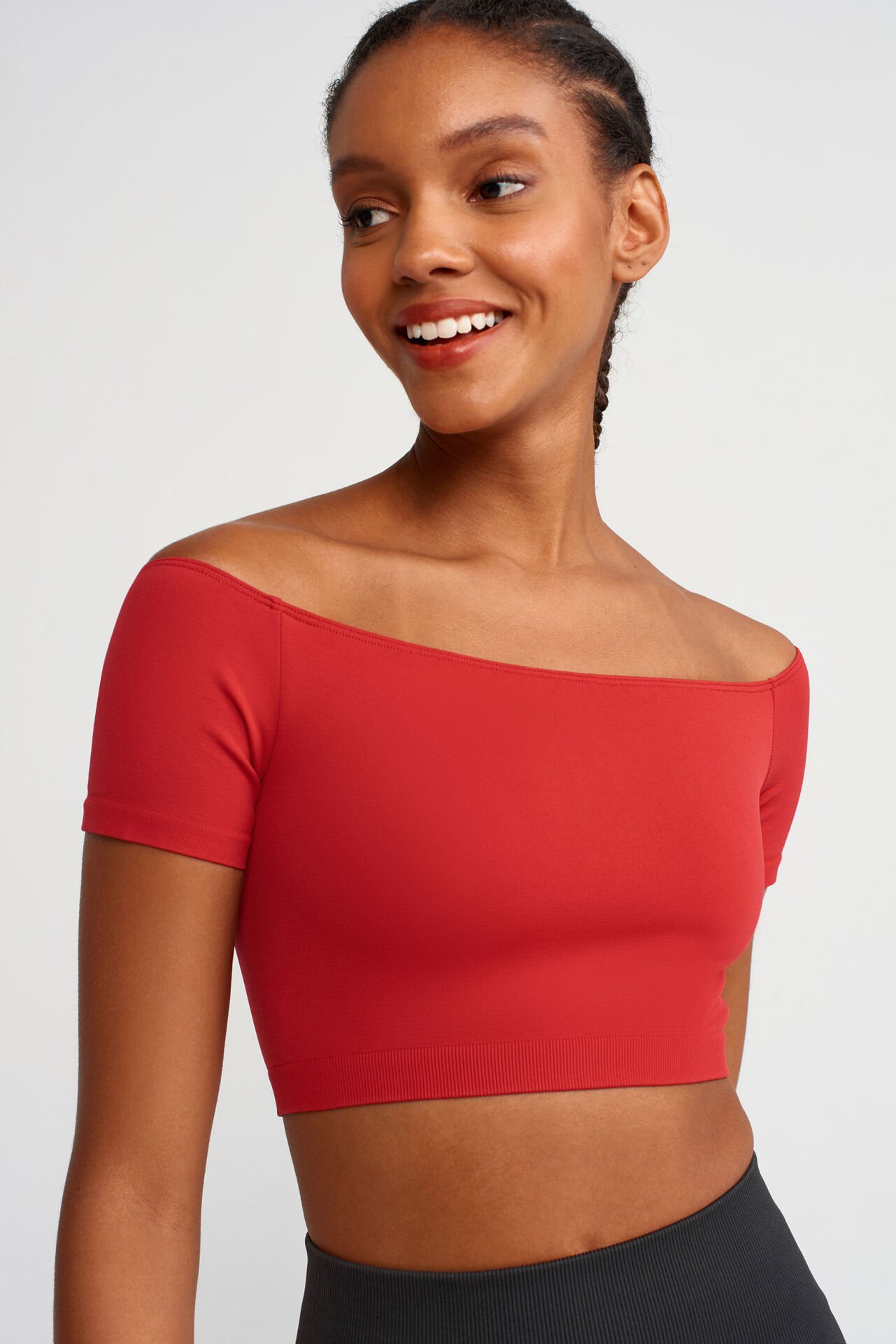 Esnek kumaşa sahip omuzu açık bırakan crop top, şık ve modern bir üsttür. Crop top kesimi sayesinde belinin üstünde son bulur ve omuzları açıkta bırakan feminen bir görünüm sunar. Esnek kumaşı sayesinde vücuduna tam oturur ve hareket özgürlüğü sağlar.