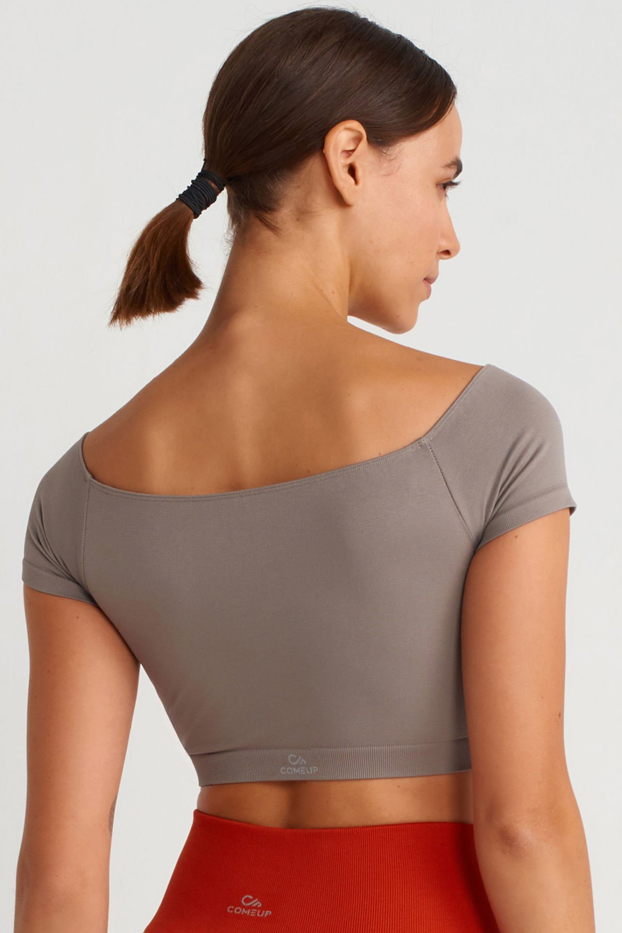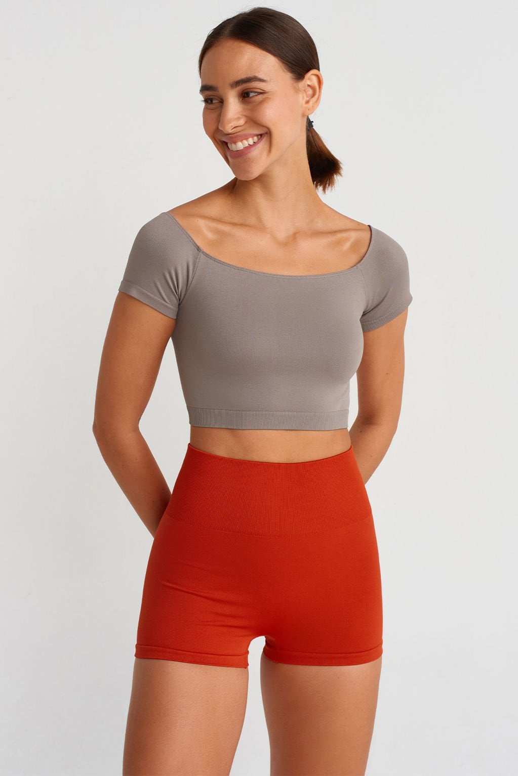 Omzu Açık Kısa Kollu Crop Top Mahlep Tozu