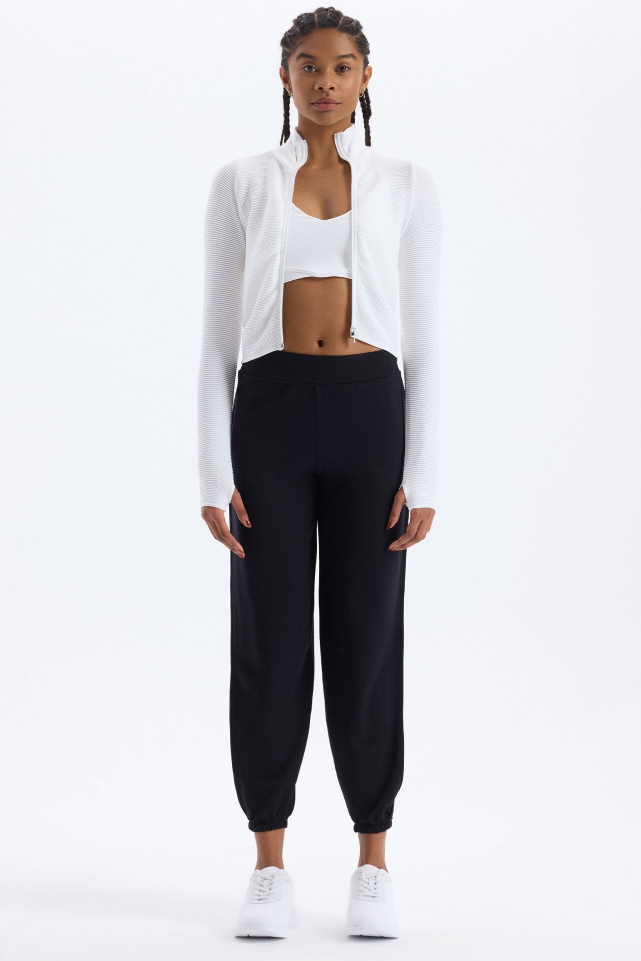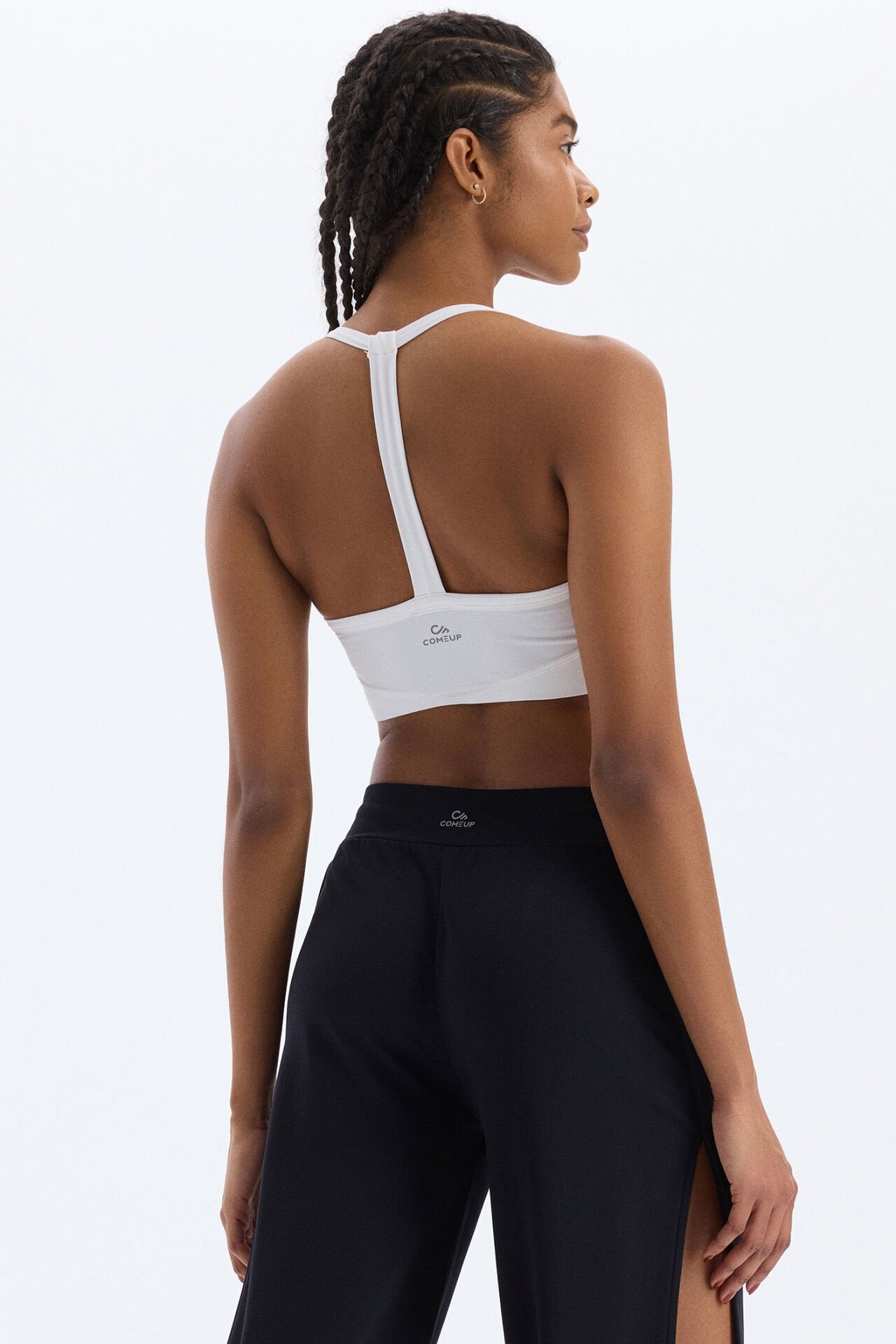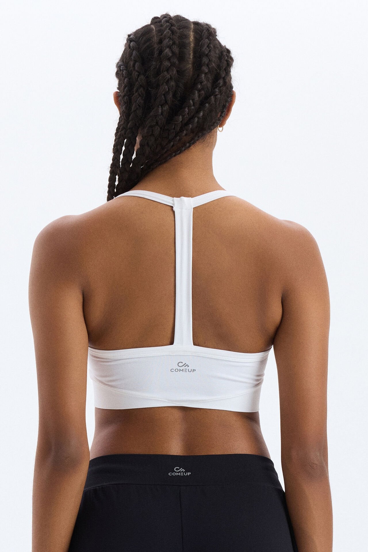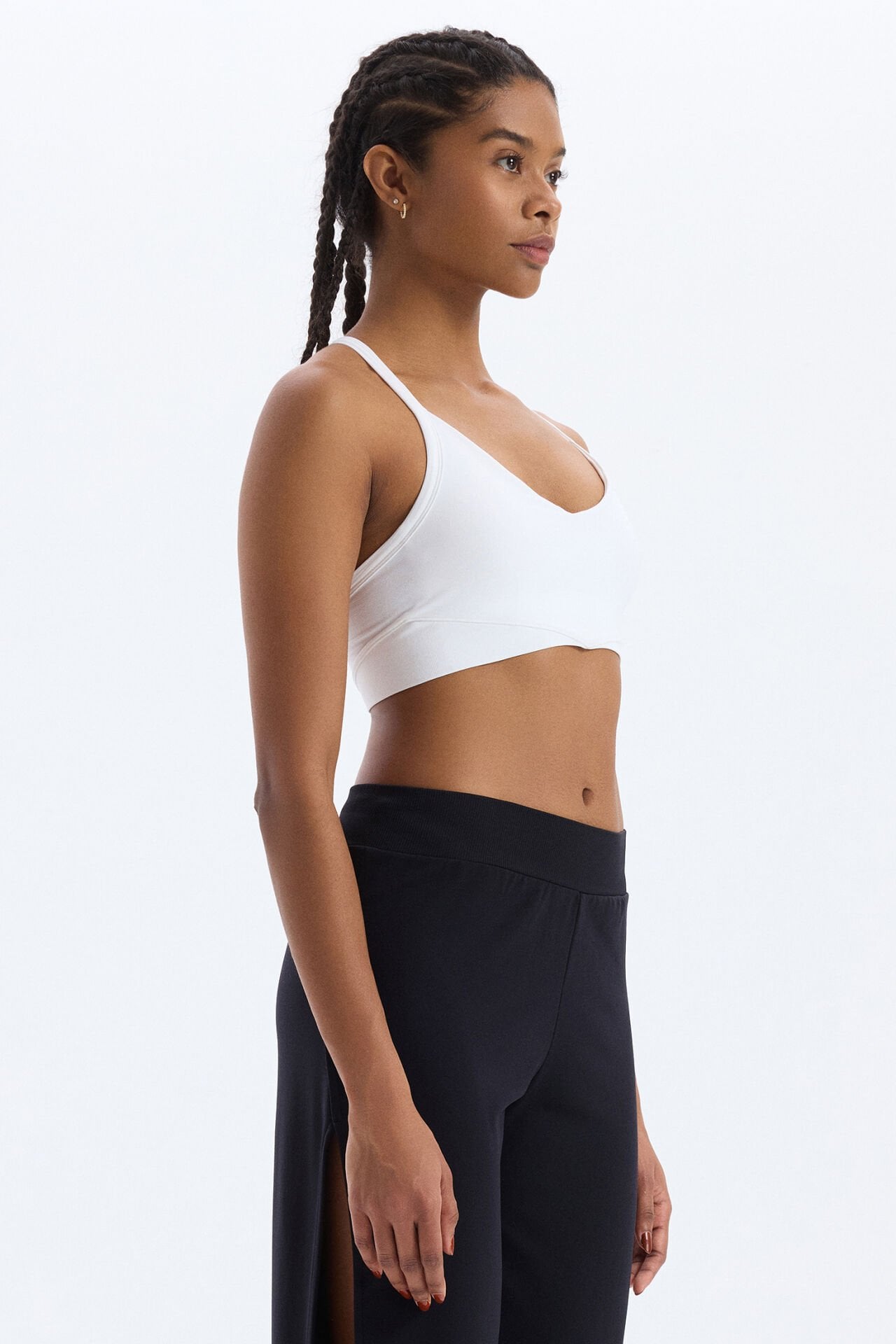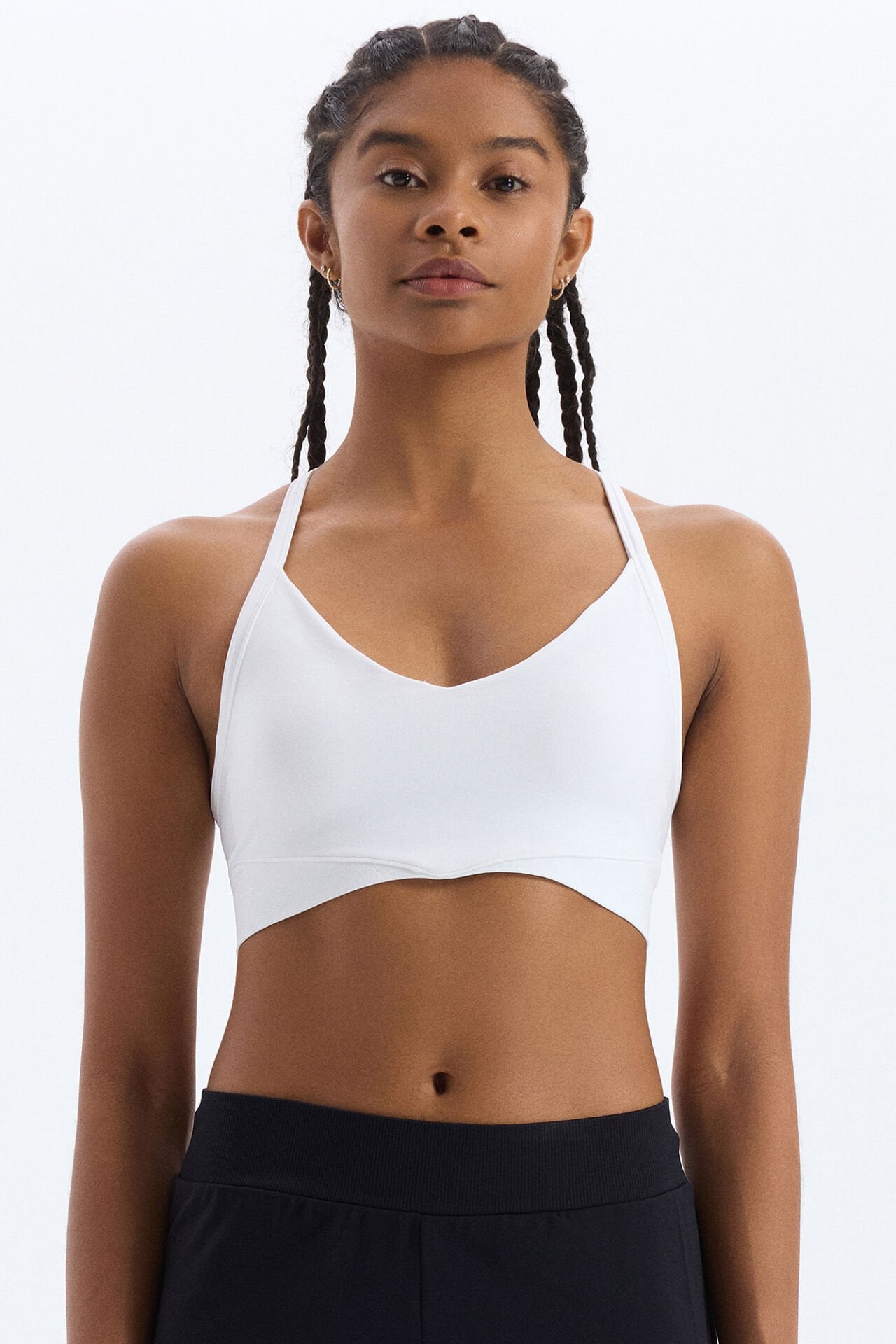 Beyazın tazeliği ve sadeliğiyle tasarlanmış sporcu sütyeni, şıklığı ve rahatlığı bir arada sunar. V yaka formu ve şerit detaylı sırt tasarımıyla modern bir görünüm elde ederken, beyazın saf duruşu tarzını yansıtır.