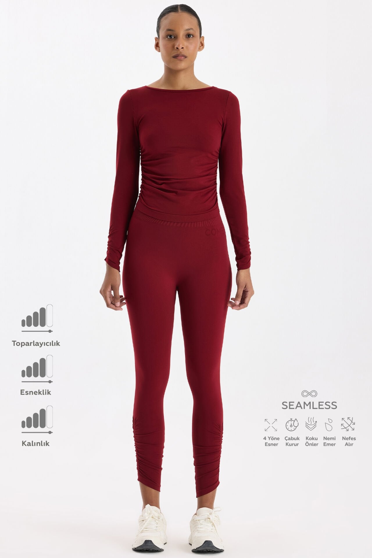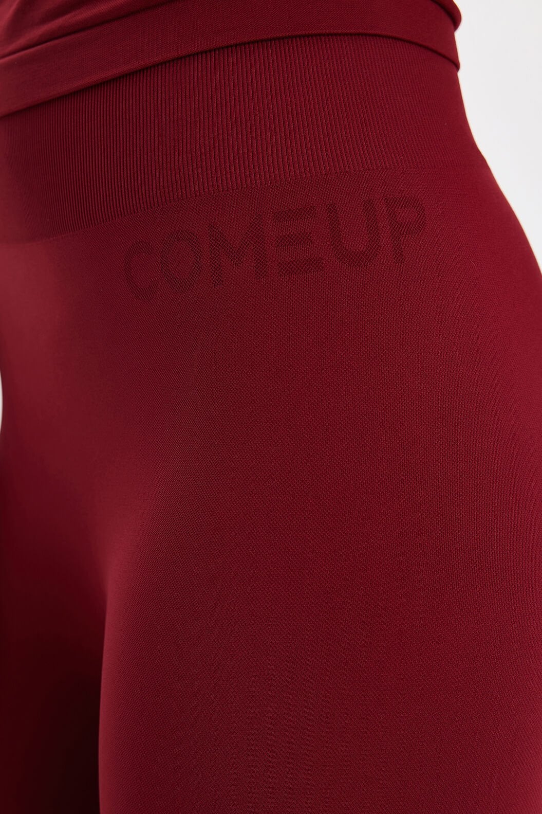 Dikişsiz örme teknolojisiyle üretilen tayt, cilt dostu yapısı sayesinde uzun süreli kullanımlarda bile tahrişi önler. Paça kısmındaki büzgü detayları, hem sportif bir görünüm hem de dinamik bir siluet oluşturur. Bilek üstü boyu ve bel kısmındaki örme COMEUP logosu, tasarıma modern bir dokunuş katar.