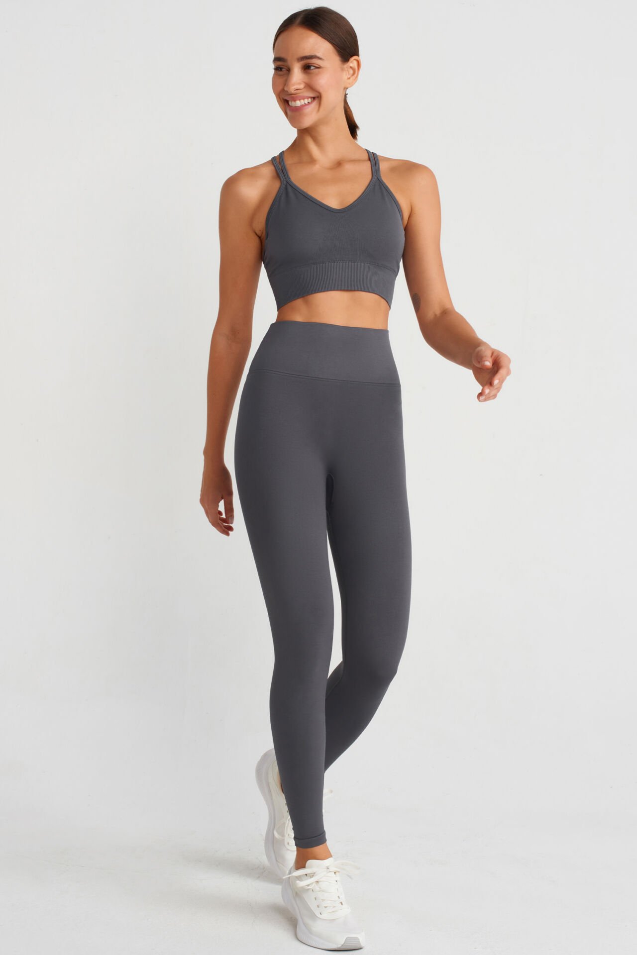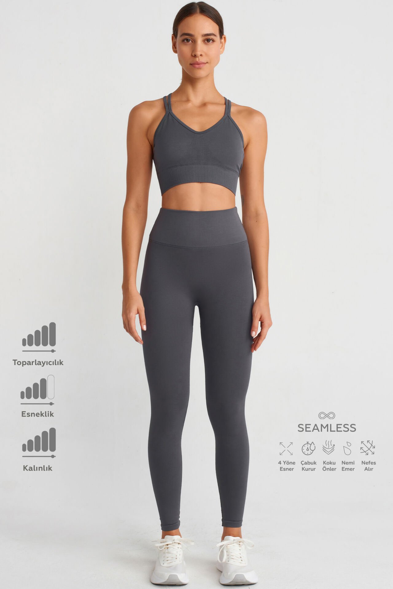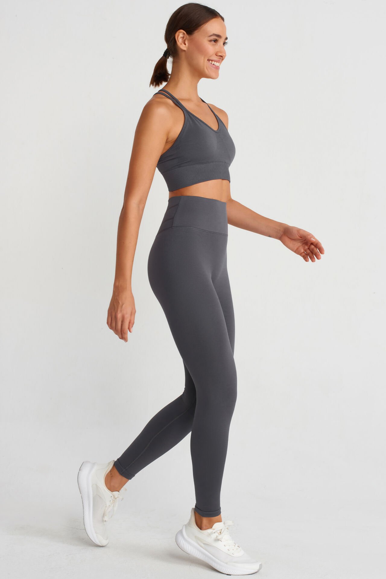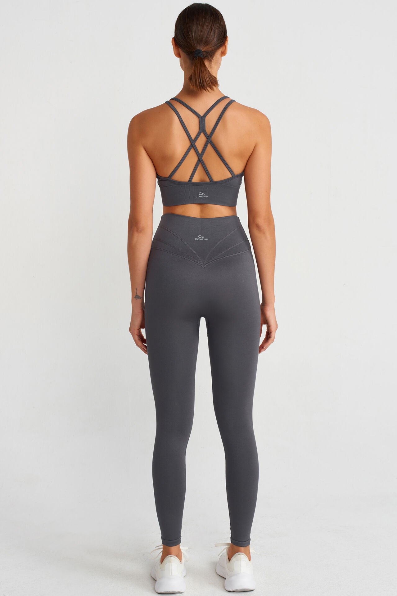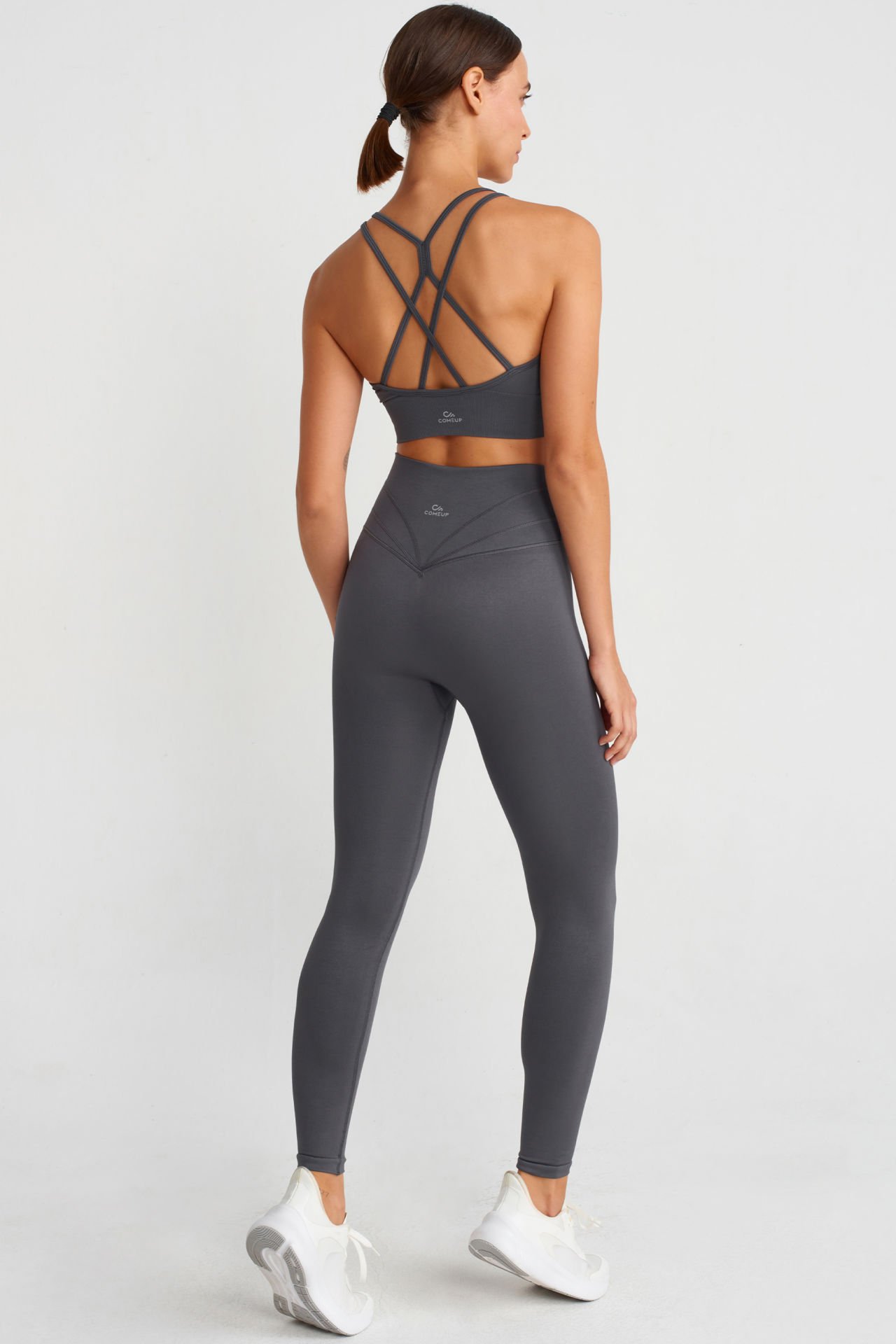 Yüksek belli taytın bel bölgesinde bulunan üçgen dikiş tasarımı ile estetik bir görünüm oluşturur.