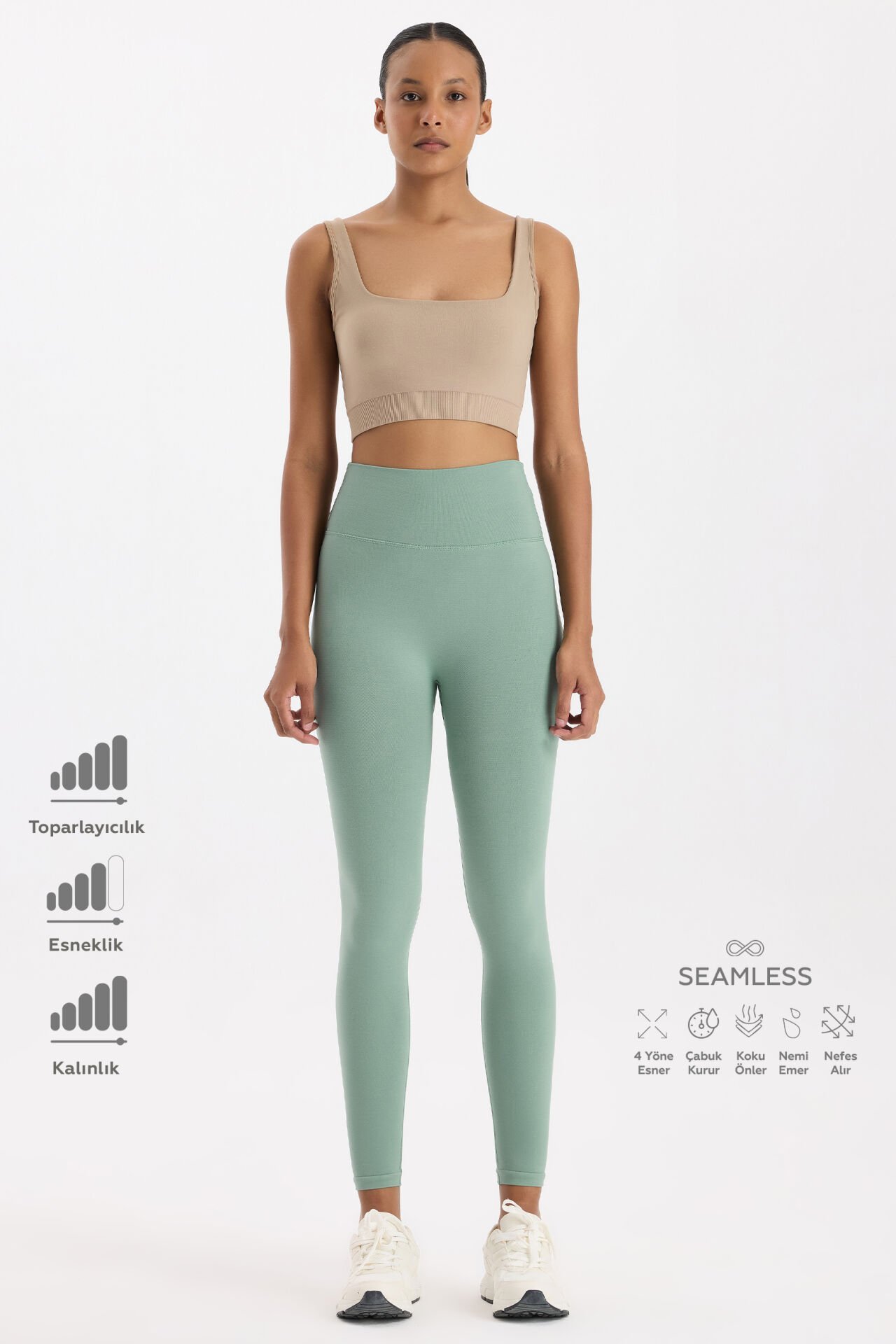 Deniz Köpüğü tonunun ferah ve doğal ışıltısı, sade kombinlerde zarif bir enerji yaratır. Spor salonunda veya şehir stilinde şıklık ve konforu bir araya getiren bu push up tayt, gardırobunun vazgeçilmez parçası olacak.