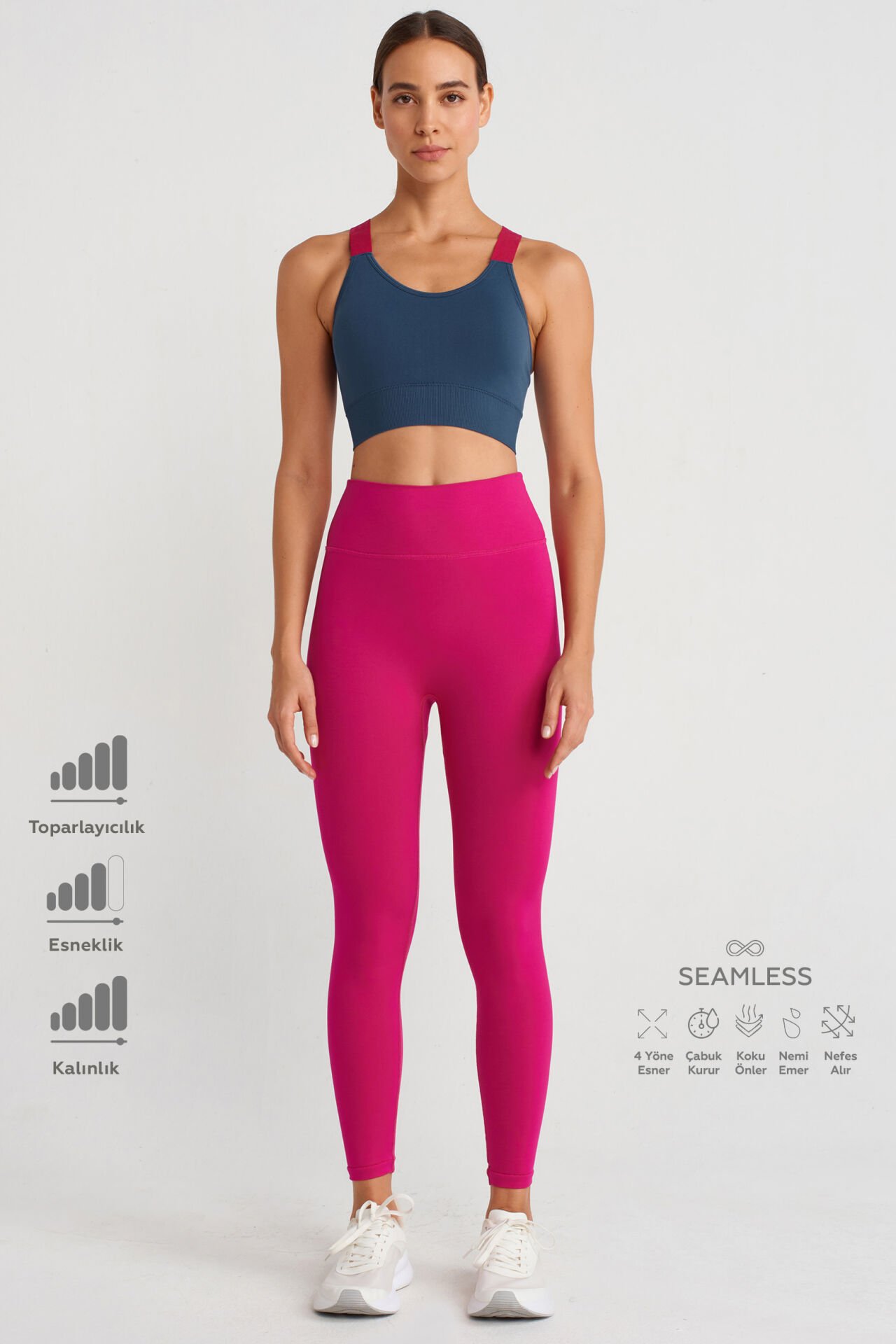 Stil ve konfor bir araya geldi! Hareket özgürlüğü sunan ve aynı zamanda mükemmel bir şekilde vücudu saran Push Up Tayt Fuşya!