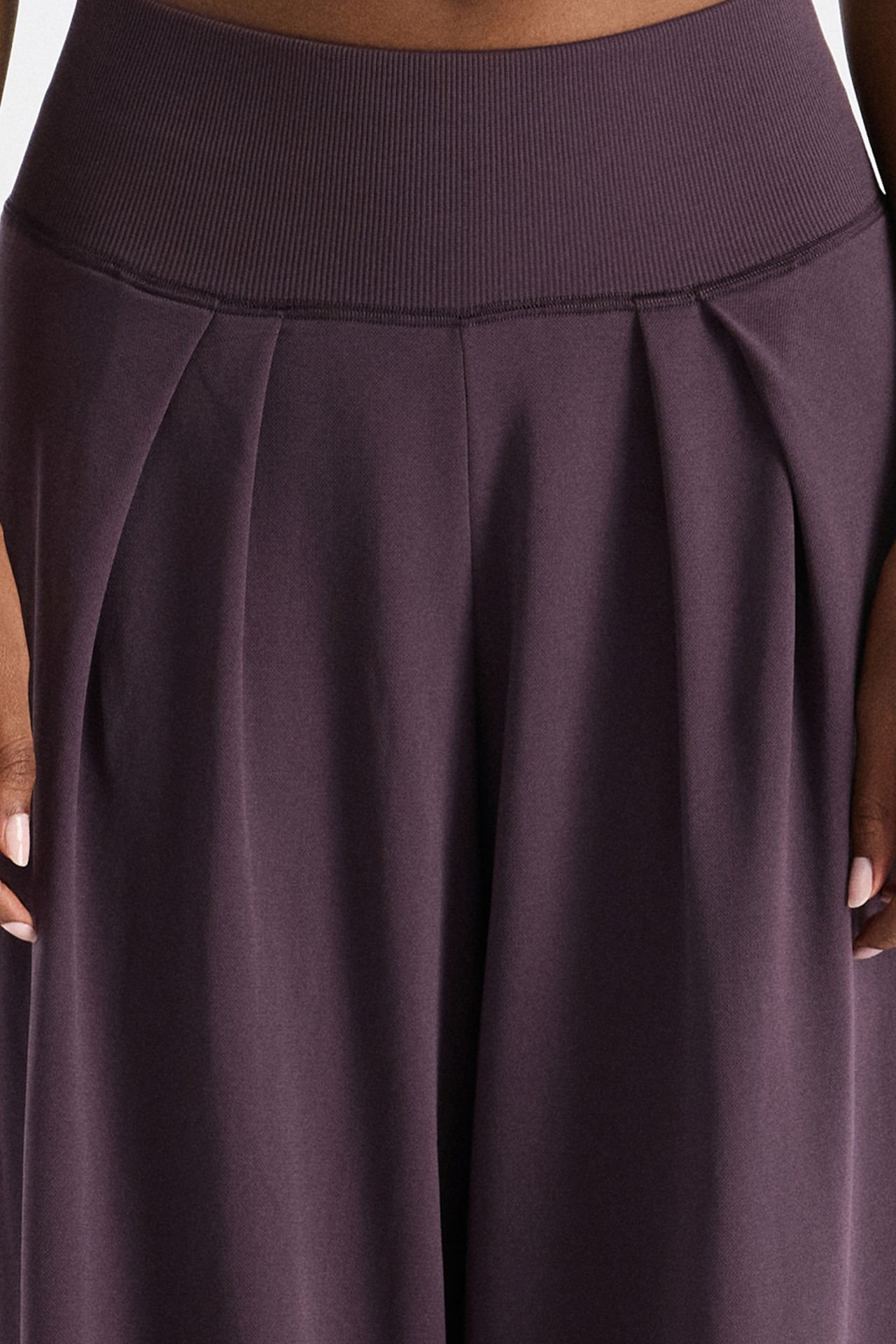 Geniş paça pantolonun bel kısmındaki zarif pile detayları, görünümüne sofistike bir doku ve hareketlilik kazandırır, modern ve şık bir görünüm elde etmeni sağlar.