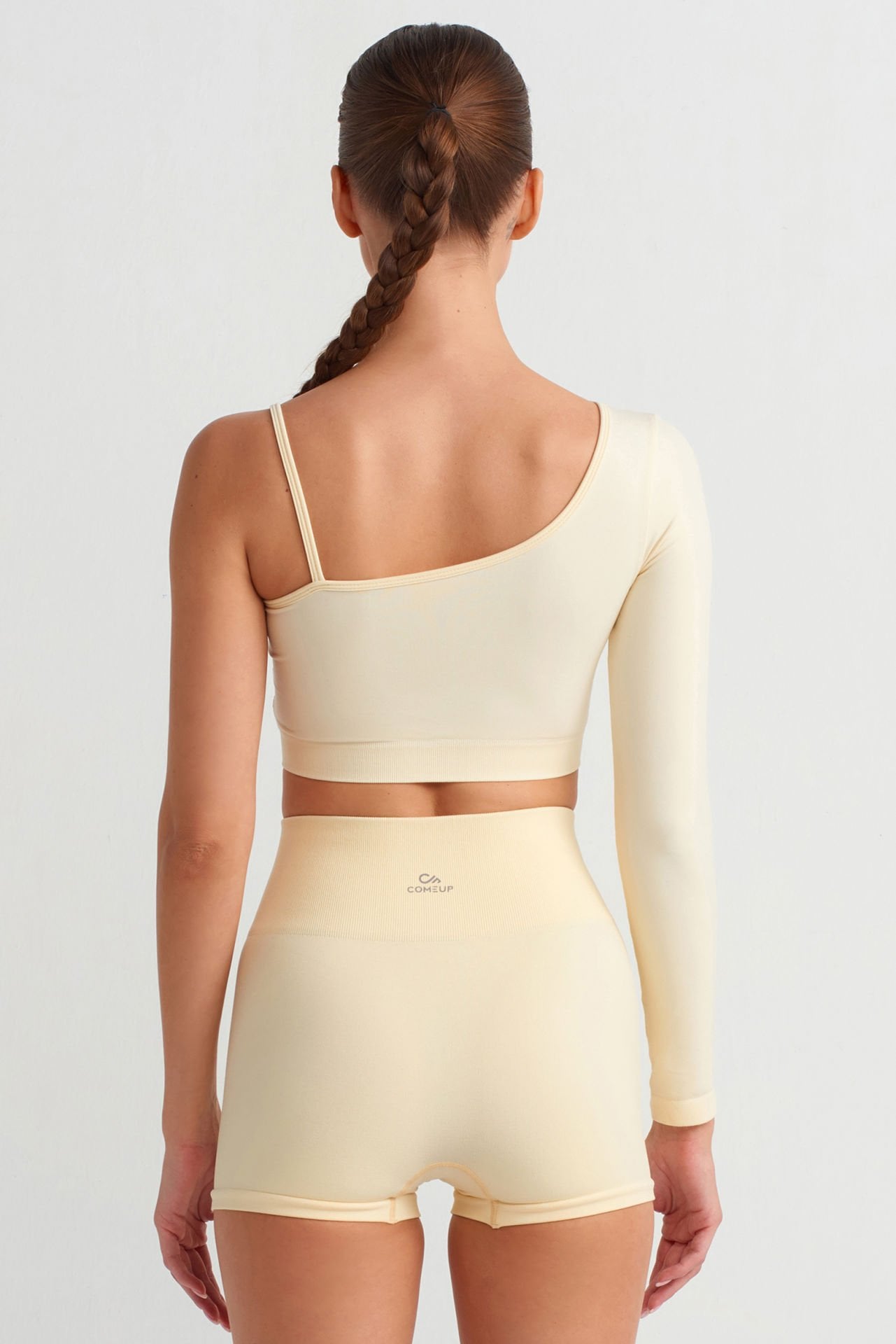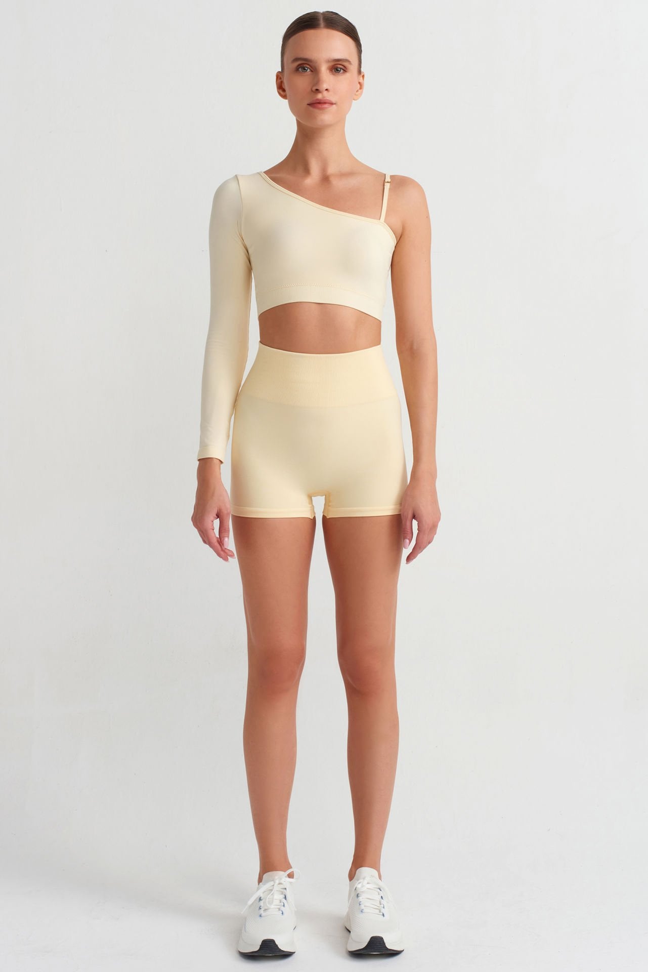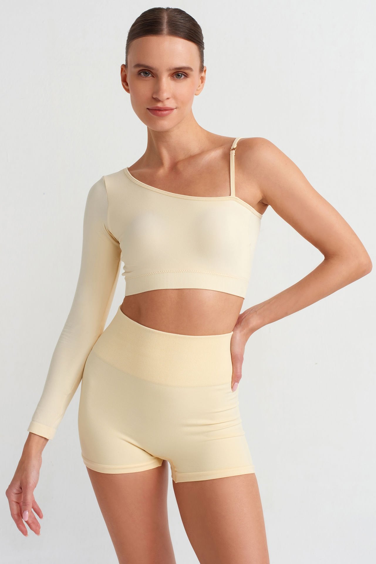 Soft sarı rengi ile dikkat çeken tek kollu crop üst; rengin yumuşak tonu ile dikkat çeker, rahat ve hafif hissiyatı ile öne çıkar.
