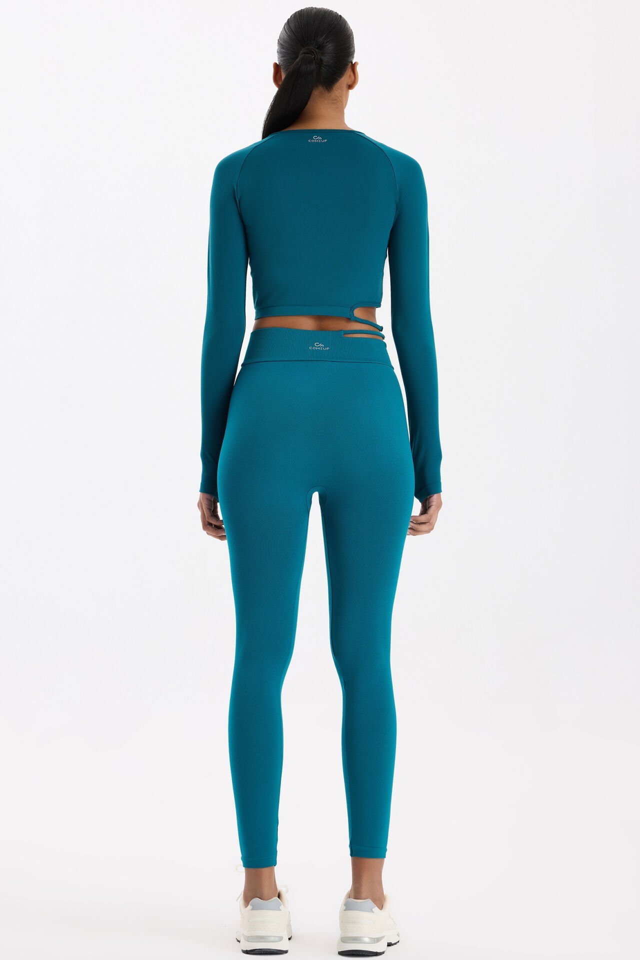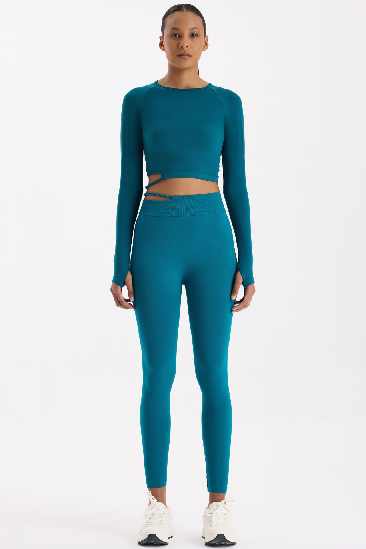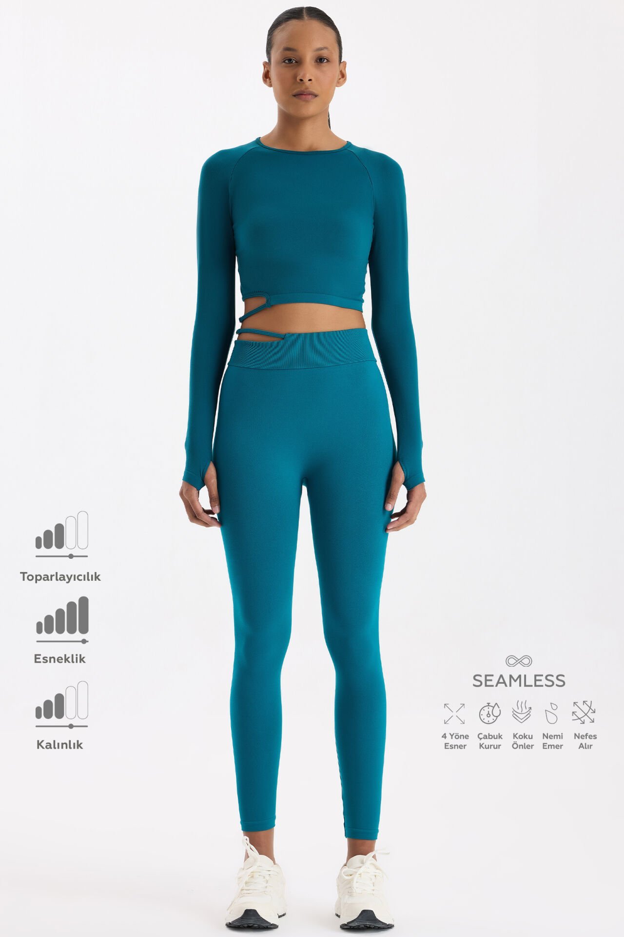Milenyum Yeşili dikişsiz spor tayt, zarif tonuyla tazelik ve dinamizmi bir araya getirir. Yüksek bel formu, vücudu sararak destekleyici bir yapı oluşturur; bel kısmındaki tokalı pencere detayı ise sofistike bir dokunuşla tarzını öne çıkarır.