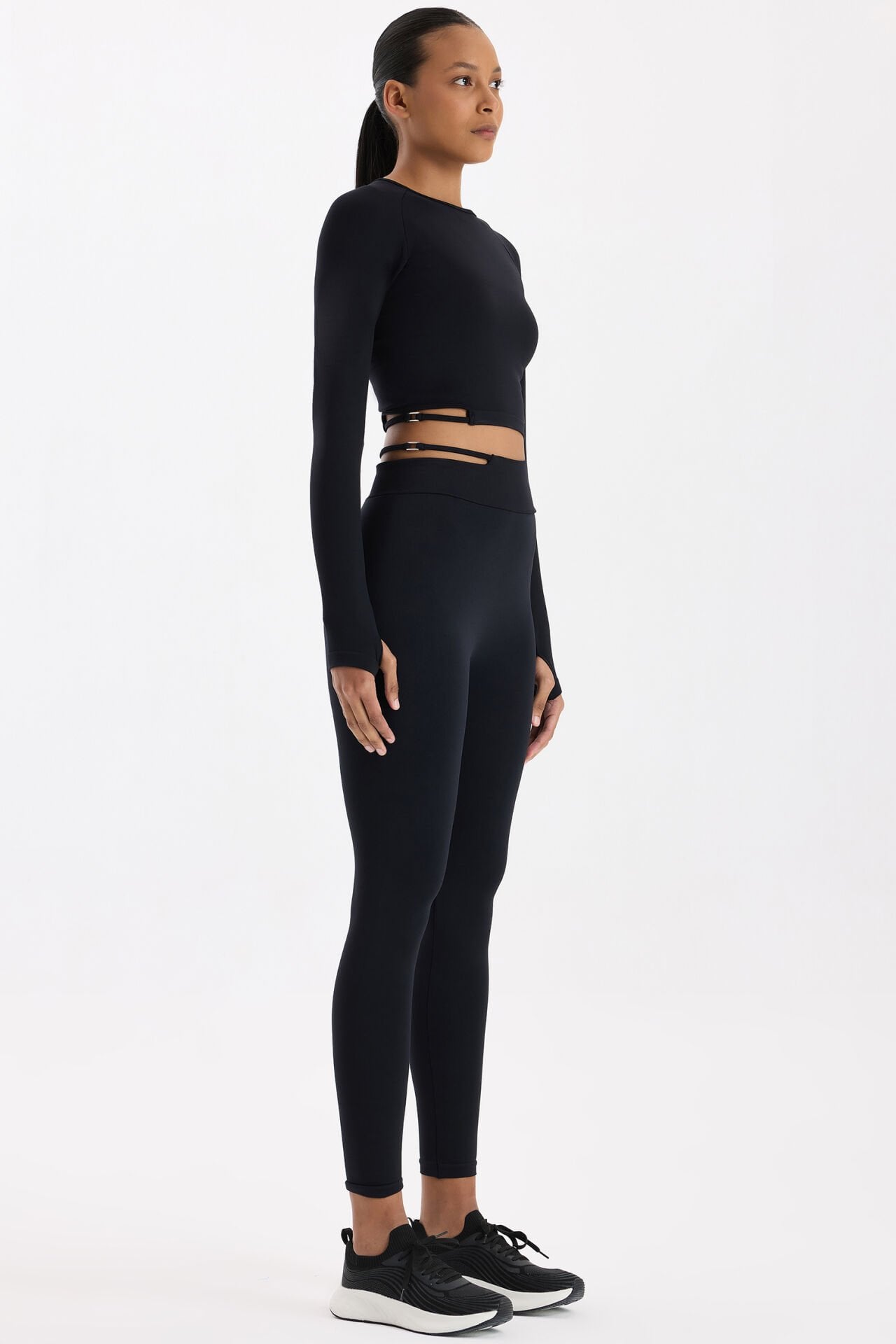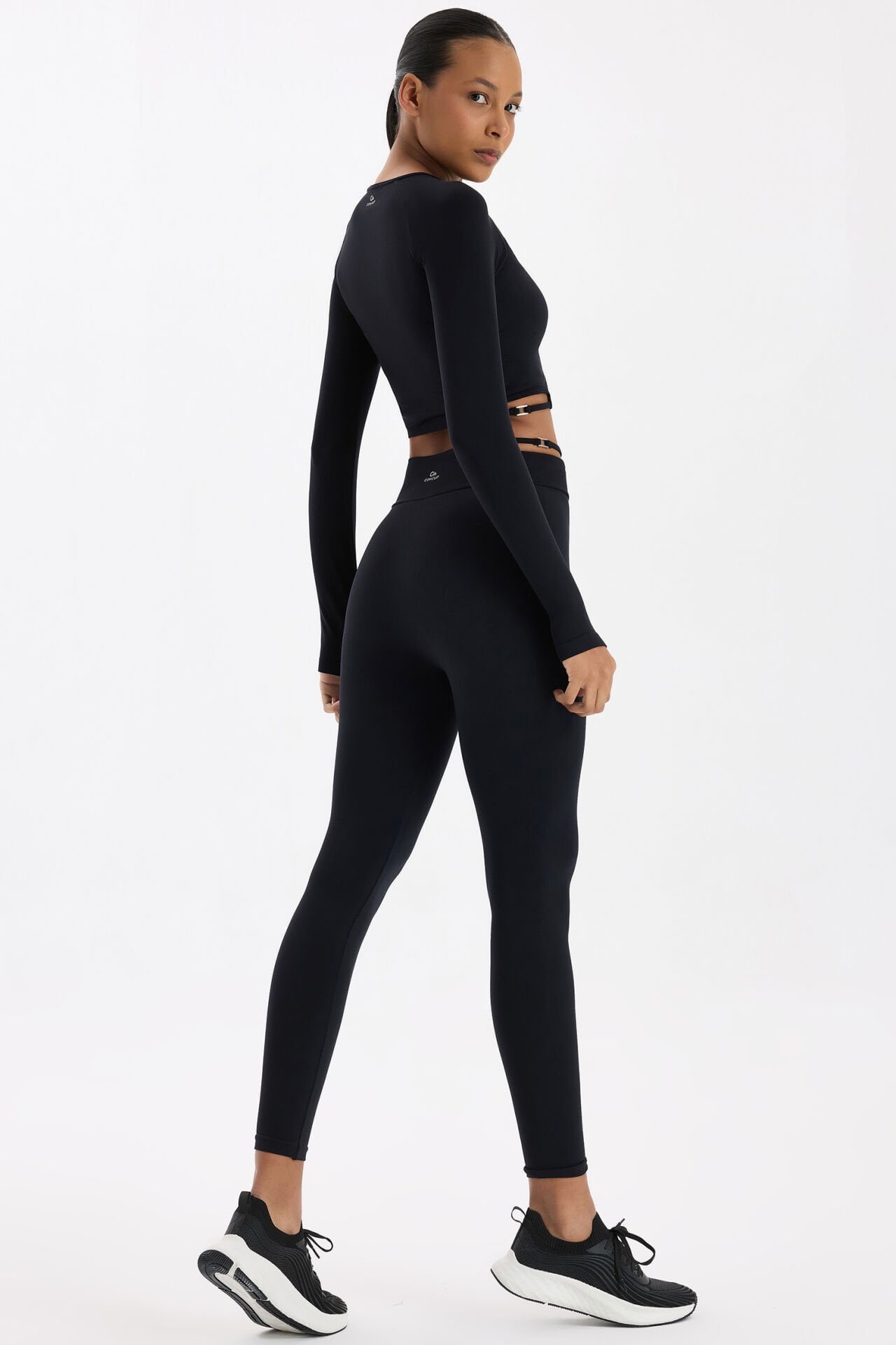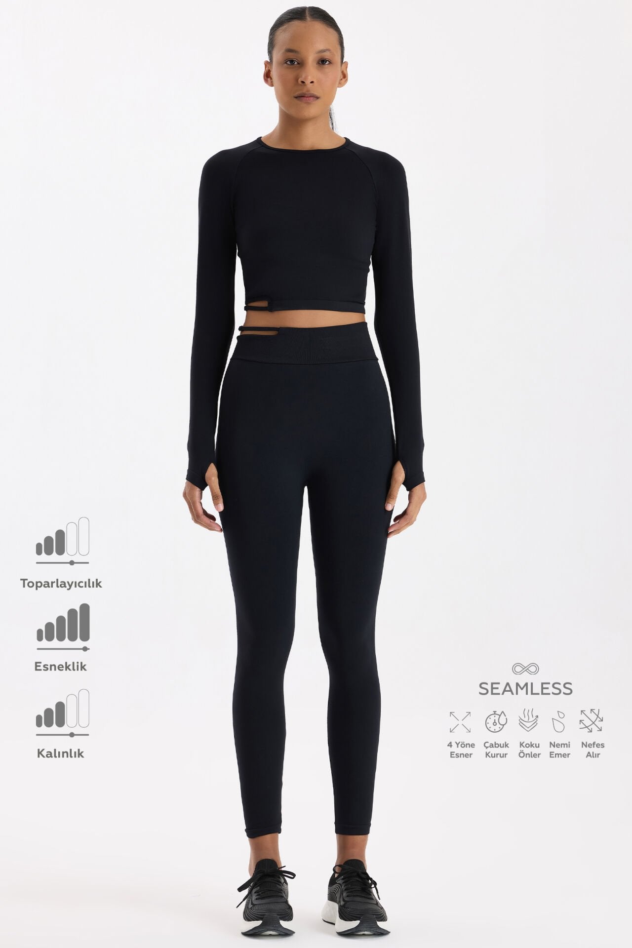 Tokalı beli pencereli dikişsiz spor tayt, teknik detaylarıyla performansını desteklerken zarif bir görünüm sunar. Yüksek bel formu, vücudu toparlayarak güçlü bir siluet oluşturur; belde yer alan tokalı pencere detayı ise modern ve dikkat çekici bir stil yaratır.