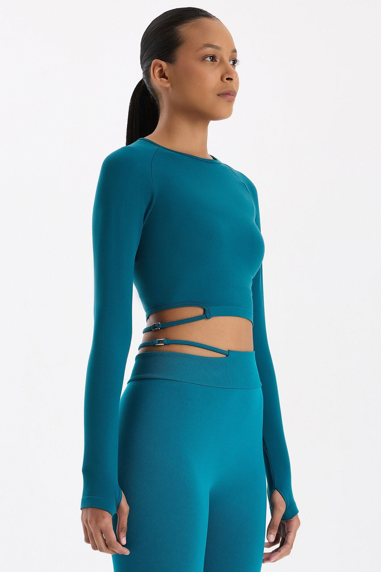 -Tokalı Parmak Geçmeli Crop Top Milenyum Yeşili, dikişsiz giyim teknolojisi kullanılarak üretilmiştir.