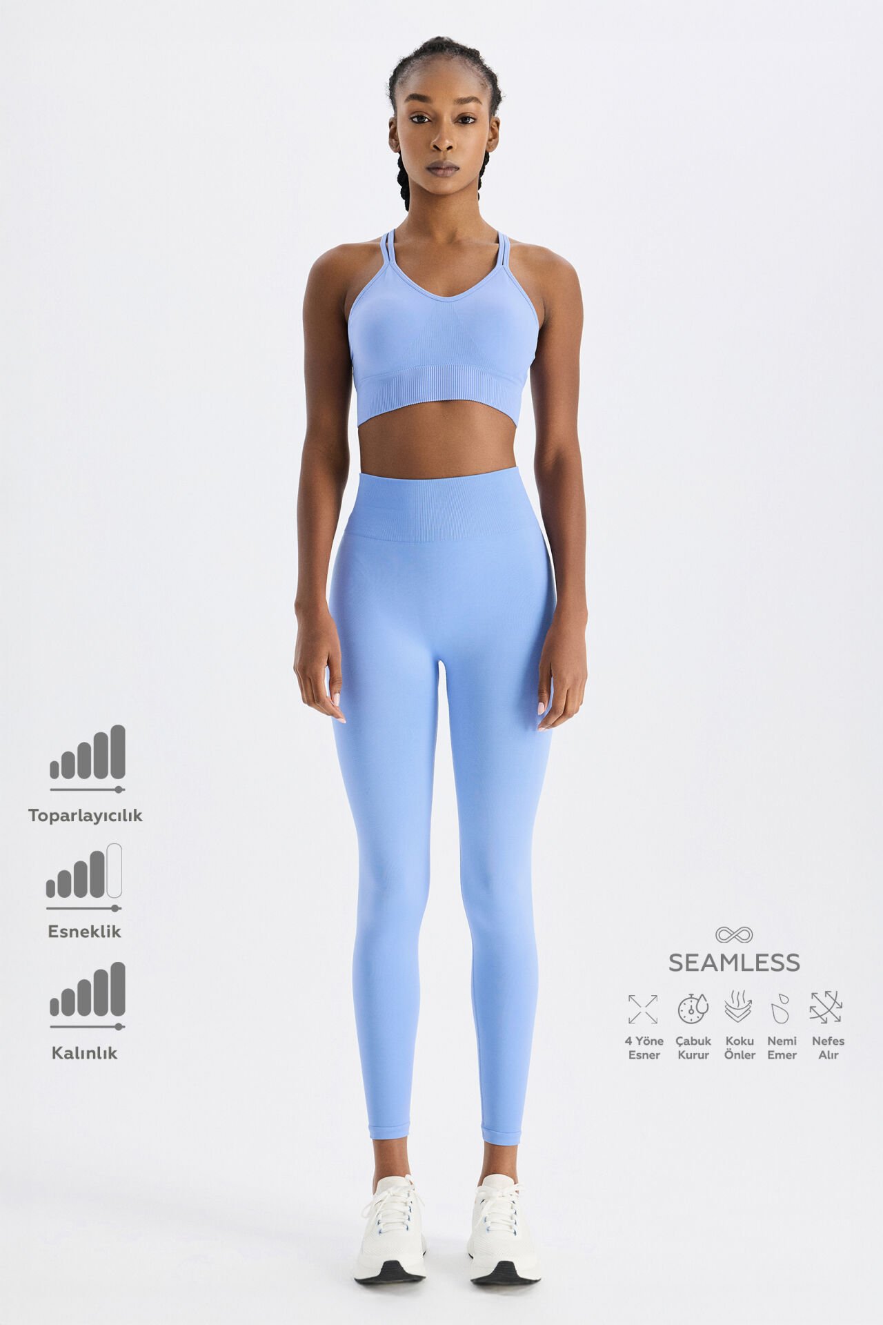 Mavi rengi ile stiline dinamik bir hava katan toparlayıcı tayt, spor yaparken kendini hem şık hem de rahat hissetmeni sağlar. Yüksek belli ve bilekte biten tasarımı ile fit görünüme sahip olurken, kompres kumaşı vücuduna mükemmel bir form kazandırır ve daha ince bir görünüme kavuşursun. Egzersiz sırasında kusursuz destek sunan toparlayıcı tayt, nem yönetimine sahip kumaş teknolojisi sayesinde ferah bir deneyim sunar. Koku oluşumunu önlemeye yardımcı kumaş bileşeni, uzun süre kullanımda bile temiz hissetmene yardımcı olur.
