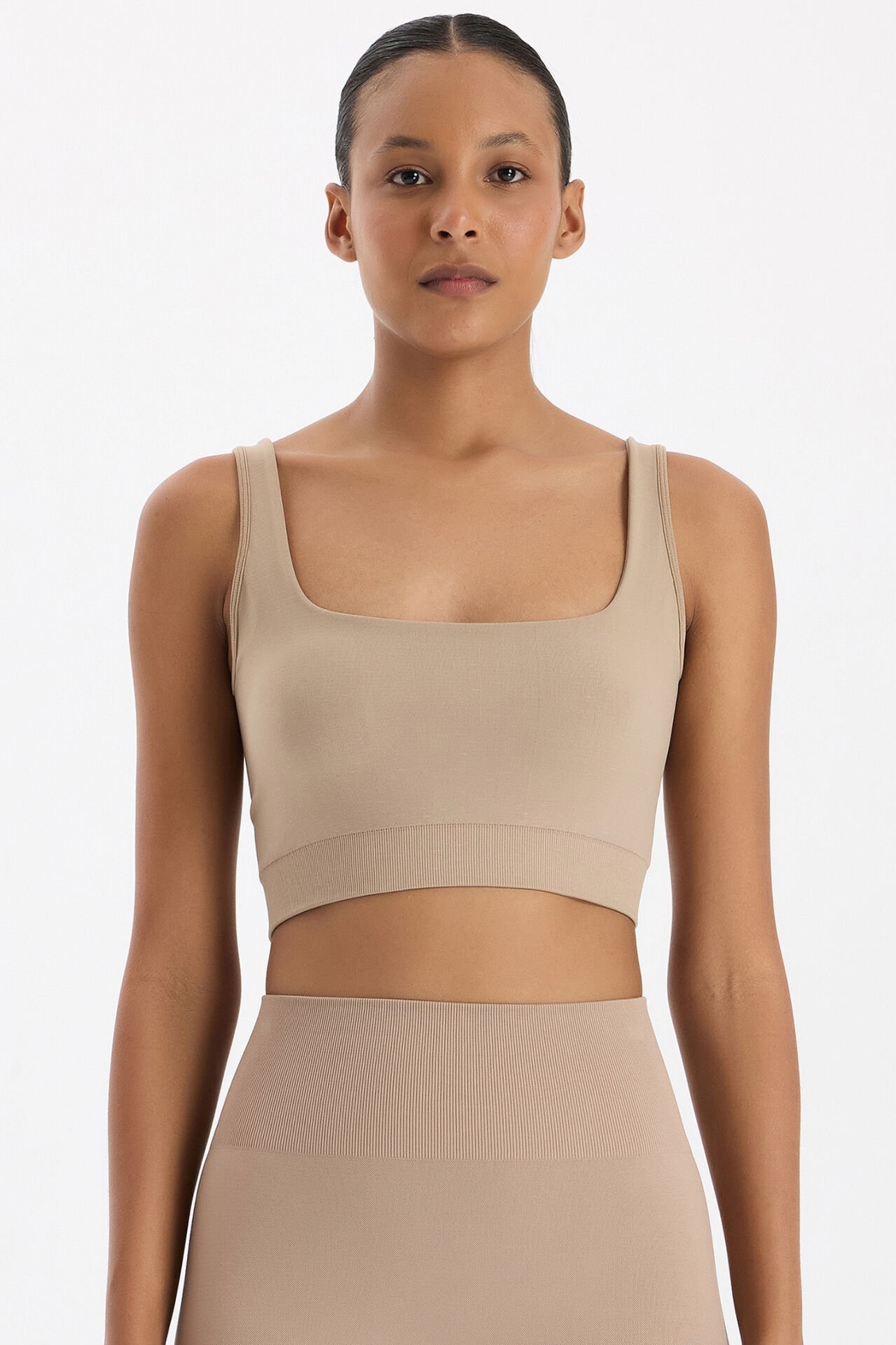 U yaka Kalın Askılı Pedli Sporcu Sütyeni Vizon