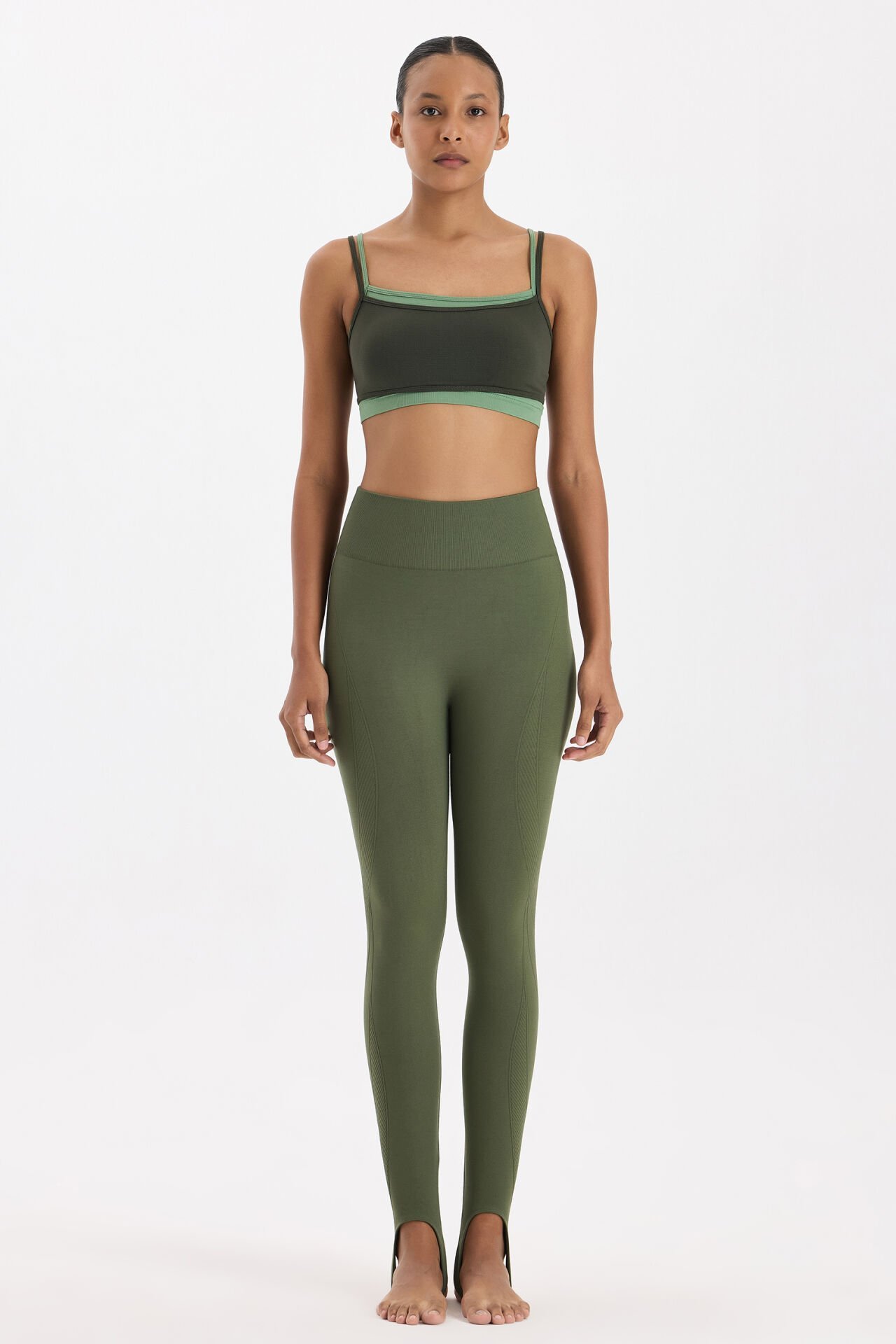 Koyu yaprak yeşili ile çağlanın yumuşak geçişi, doğallık ve zarafeti bir araya getirirken; bu tonlar hem açık renk taytlarla hem de koyu kombinlerle mükemmel bir uyum yakalar. Bel bandı, stabil bir tutuş sağlarken uzun antrenmanlarda bile konfor sunar.