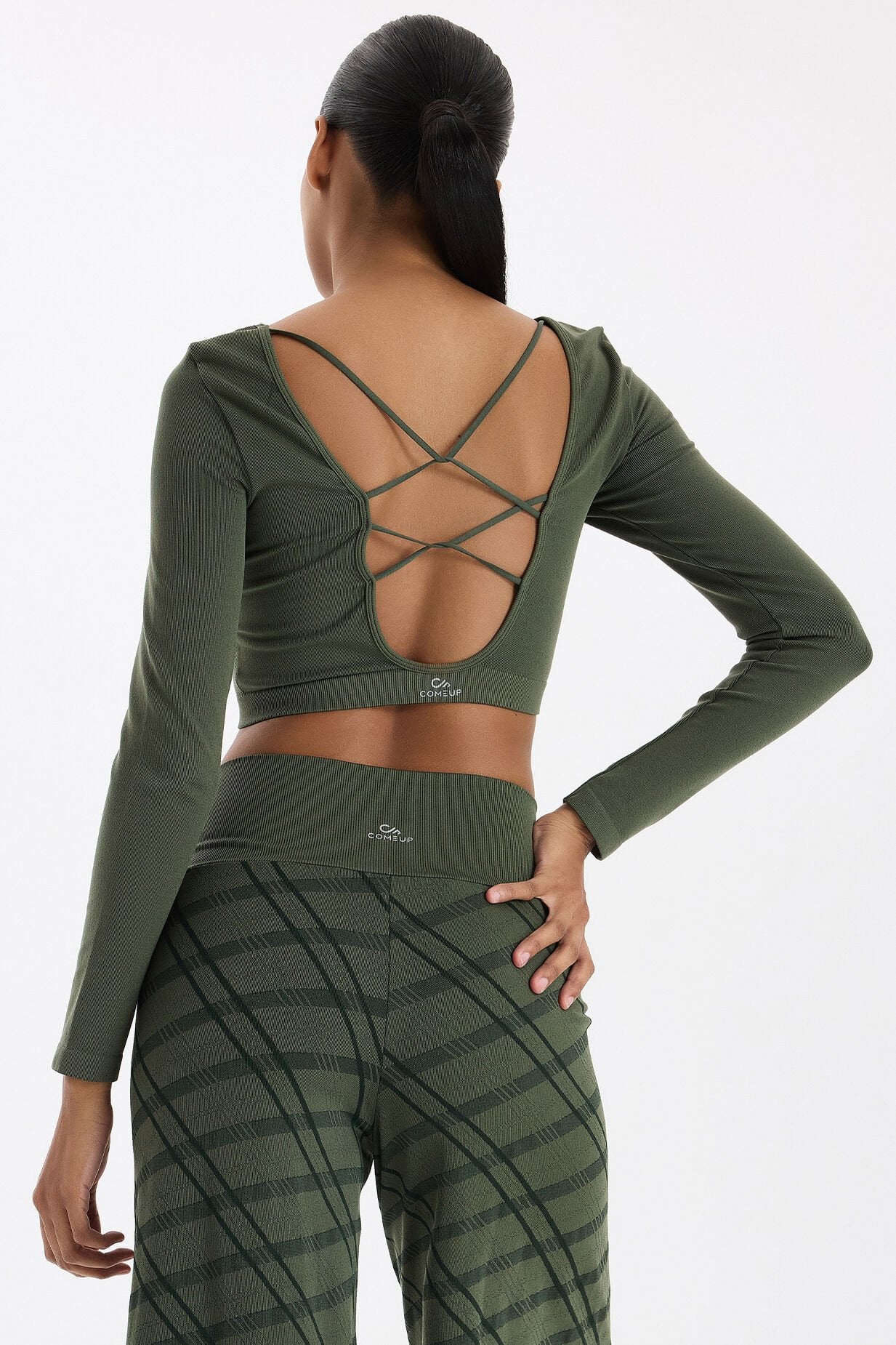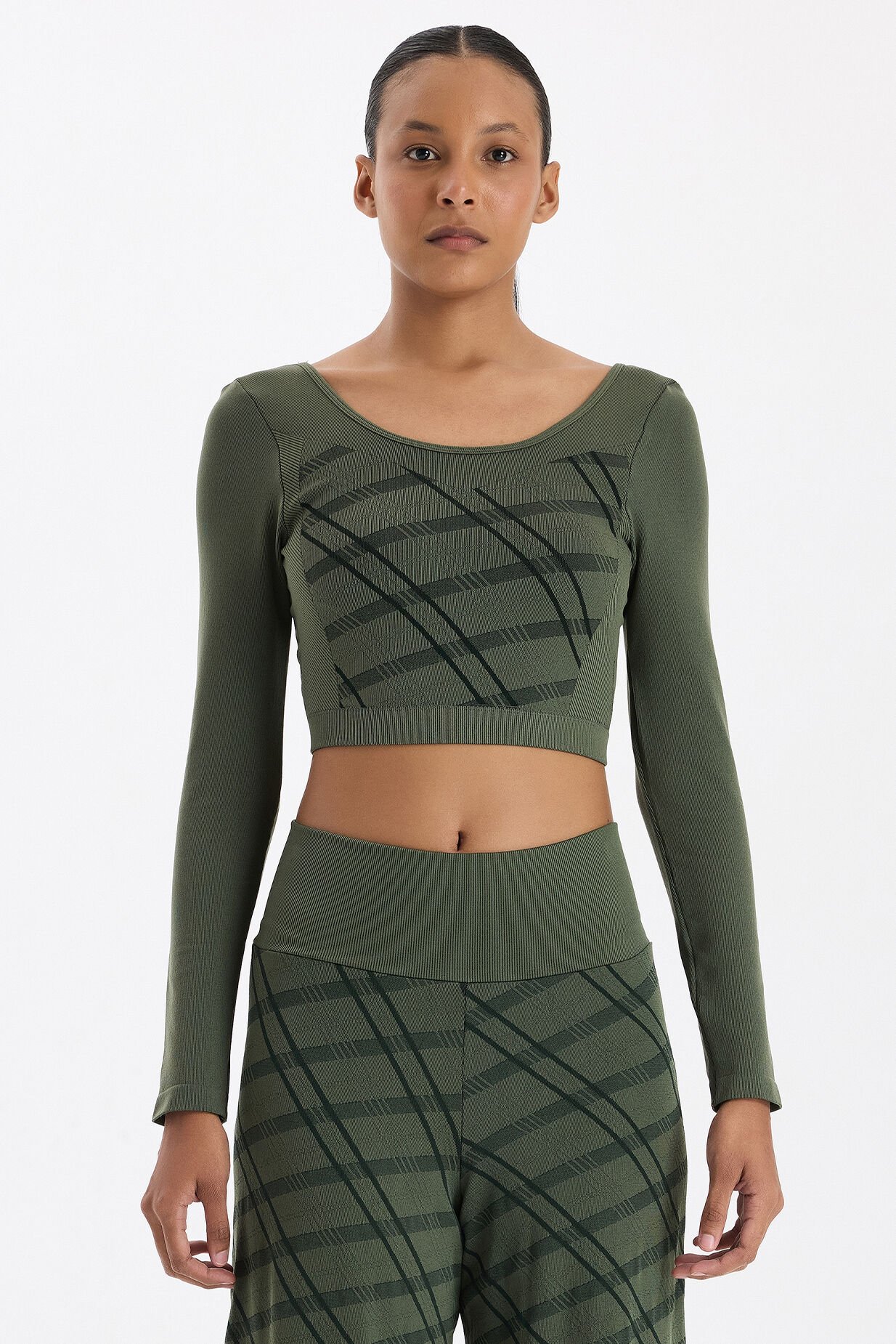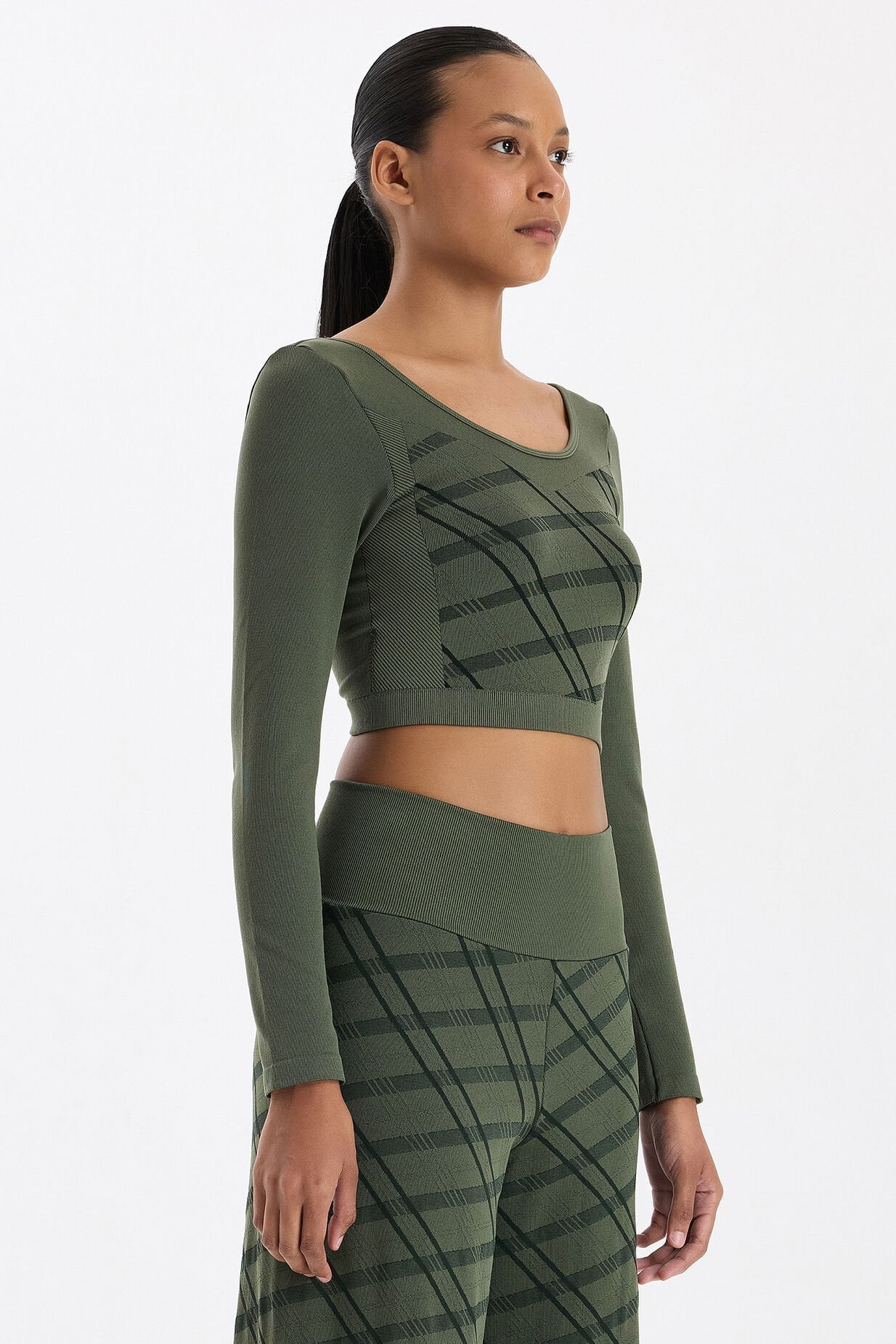 Zamansız şıklığın modern yorumunu sunan Uzun Kollu Pedli Ekose Top – Haki, sezonun en gözde desenlerinden ekose örgüyü dikişsiz giyim teknolojisiyle buluşturur. Haki rengin doğallığıyla tasarımın enerjisi birleşerek sofistike ve güçlü bir görünüm yaratır.