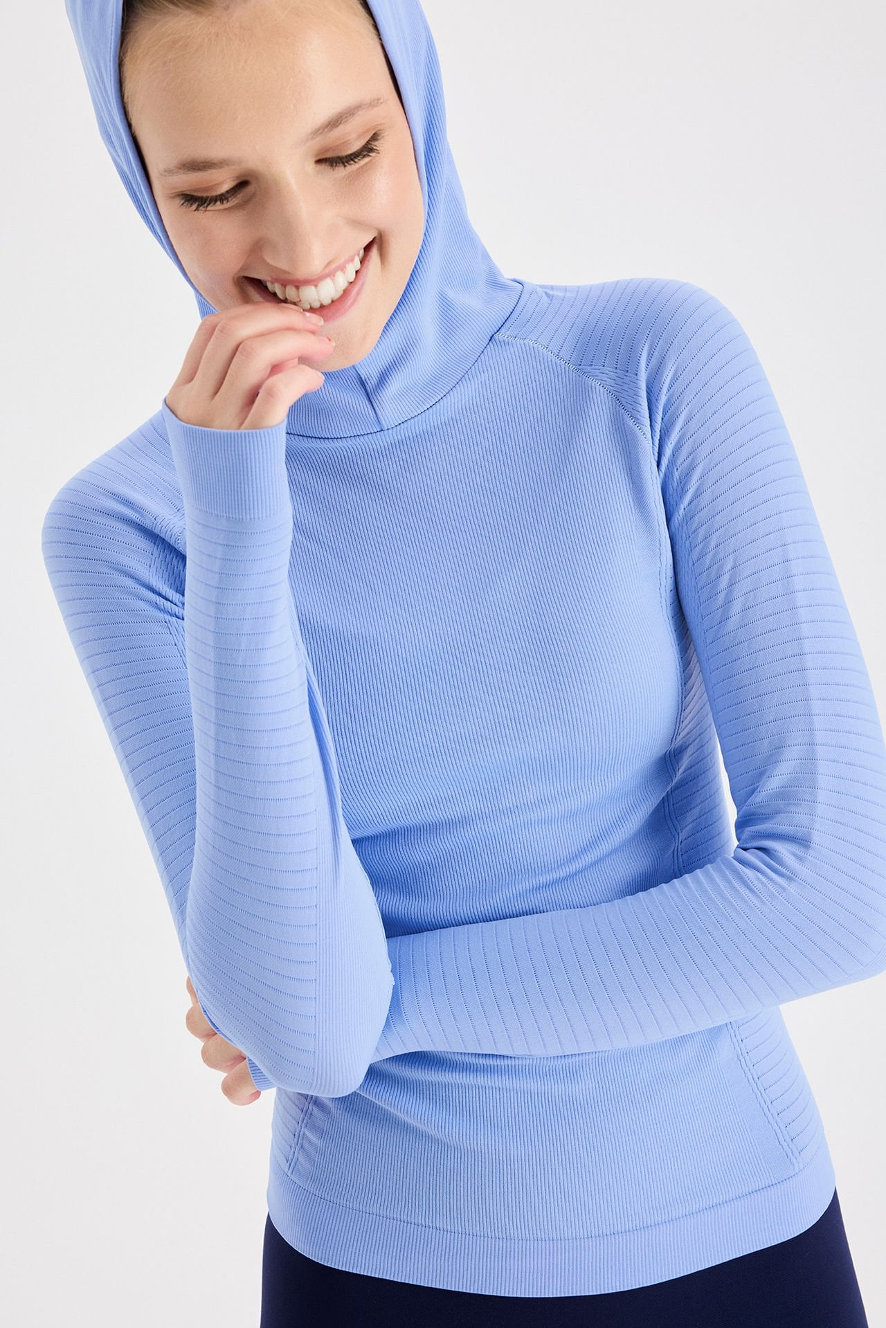 Dikişsiz üretilen spor üstün kumaşı yumuşak ve hafif dokuya sahiptir. Parmak geçme detaylı kapüşonlu üst, fonksiyonel tasarımı ile işlevselliği artırır, böylece dış mekan aktivitelerinde ekstra koruma sağlar.