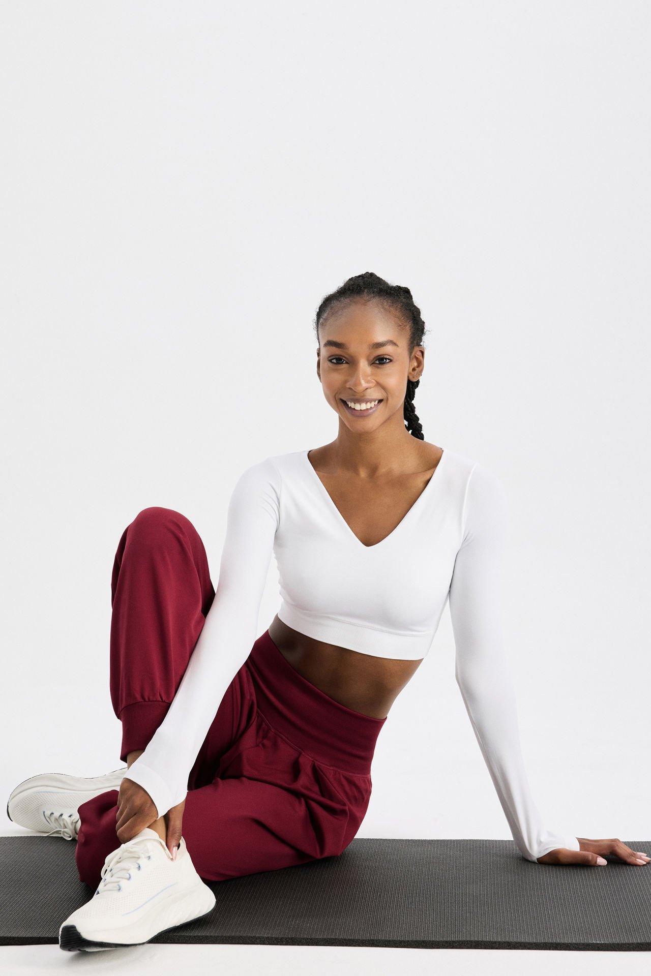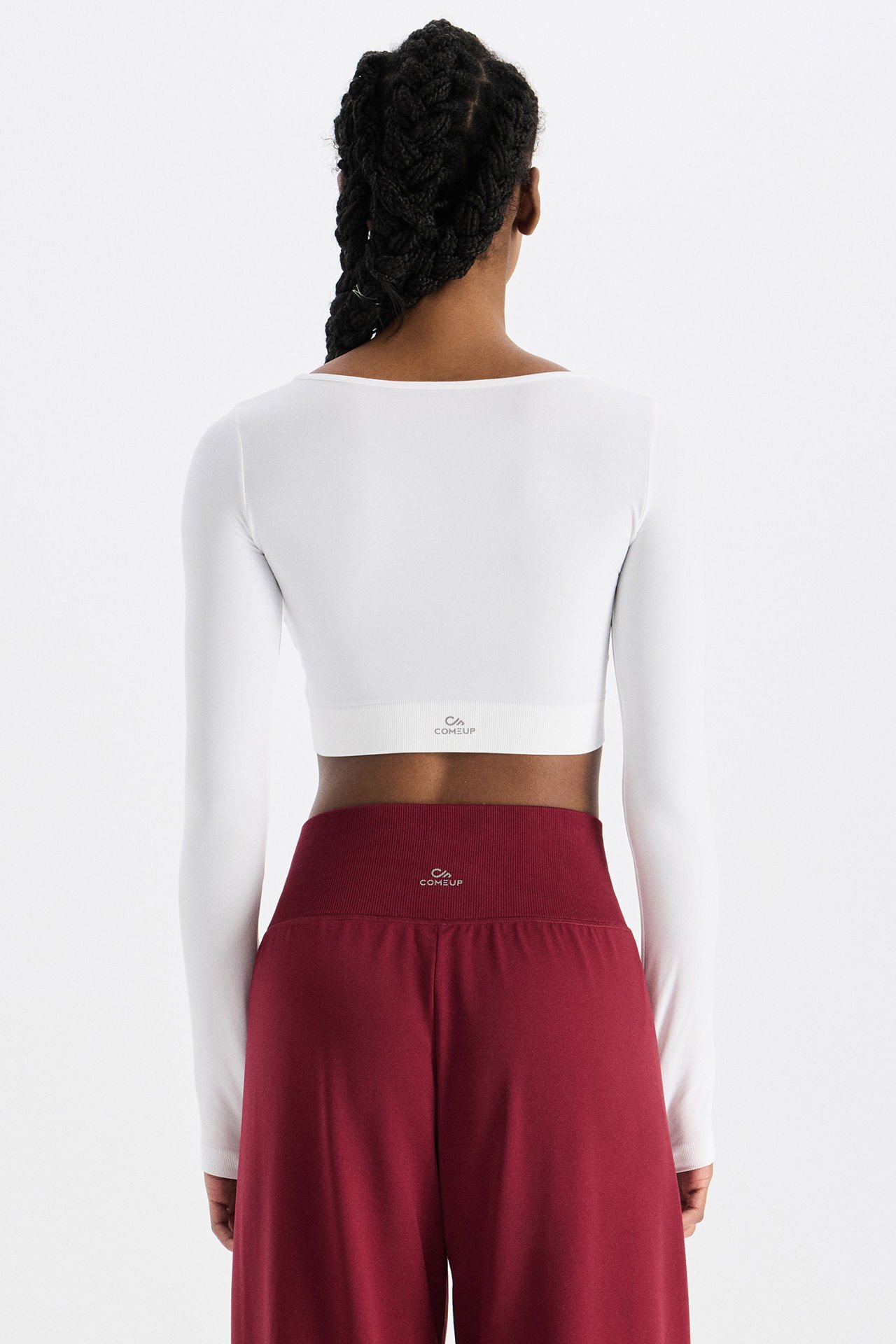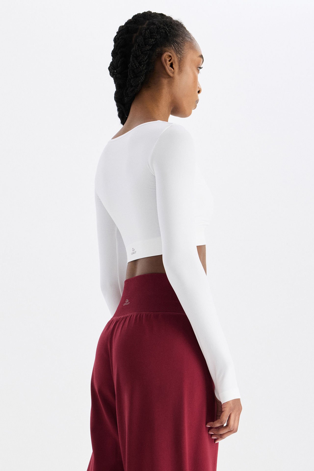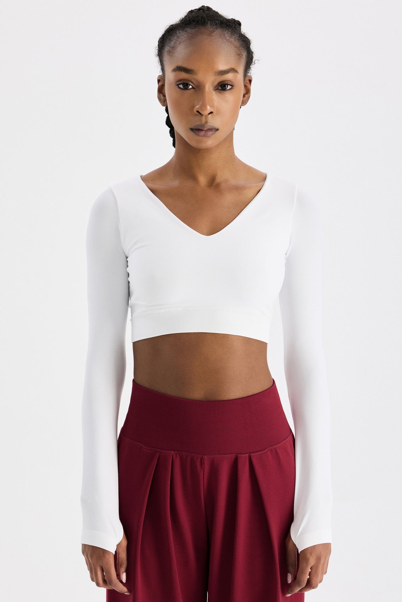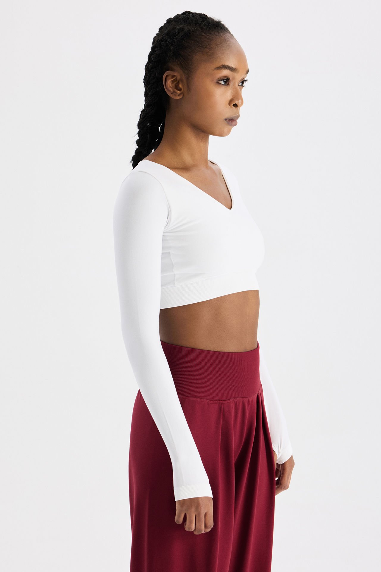 -Crop üst, v yaka formunda ve parmak geçme detaylı.